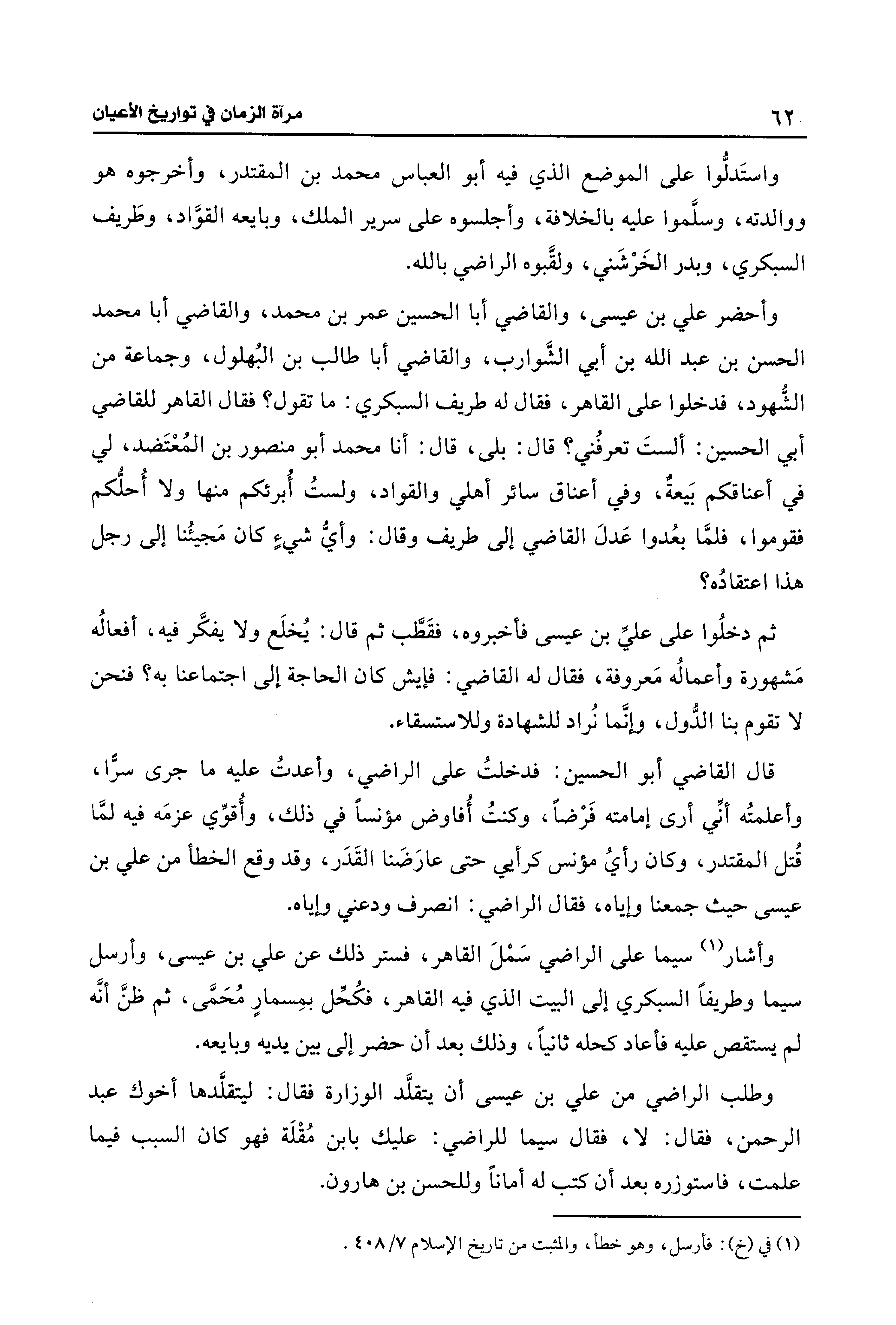 وأحضر علي بن عيسى، والقاضي أبا الحسين عمر بن محمد، والقاضي أبا محمد الحسن بن عبد الله بن أبي الشَّوارب، والقاضي أبا طالب بن البُهلول، وجماعة من الشُّهود، فدخلوا على القاهر، فقال له طريف السبكري: ما تقول؟ فقال القاهر للقاضي أبي الحسين: ألستَ تعرفُني؟ قال: بلى، قال: أنا محمد أبو منصور بن المُعْتَضد، لي في أعناقكم بَيعةٌ، وفي أعناق سائر أهلي والقواد، ولستُ أُبرئكم منها ولا أُحلُّكم فقوموا، فلمَّا بعُدوا عَدلَ القاضي إلى طريف وقال: وأيُّ شيءٍ كان مَجيئُنا إلى رجل هذا اعتقادُه؟