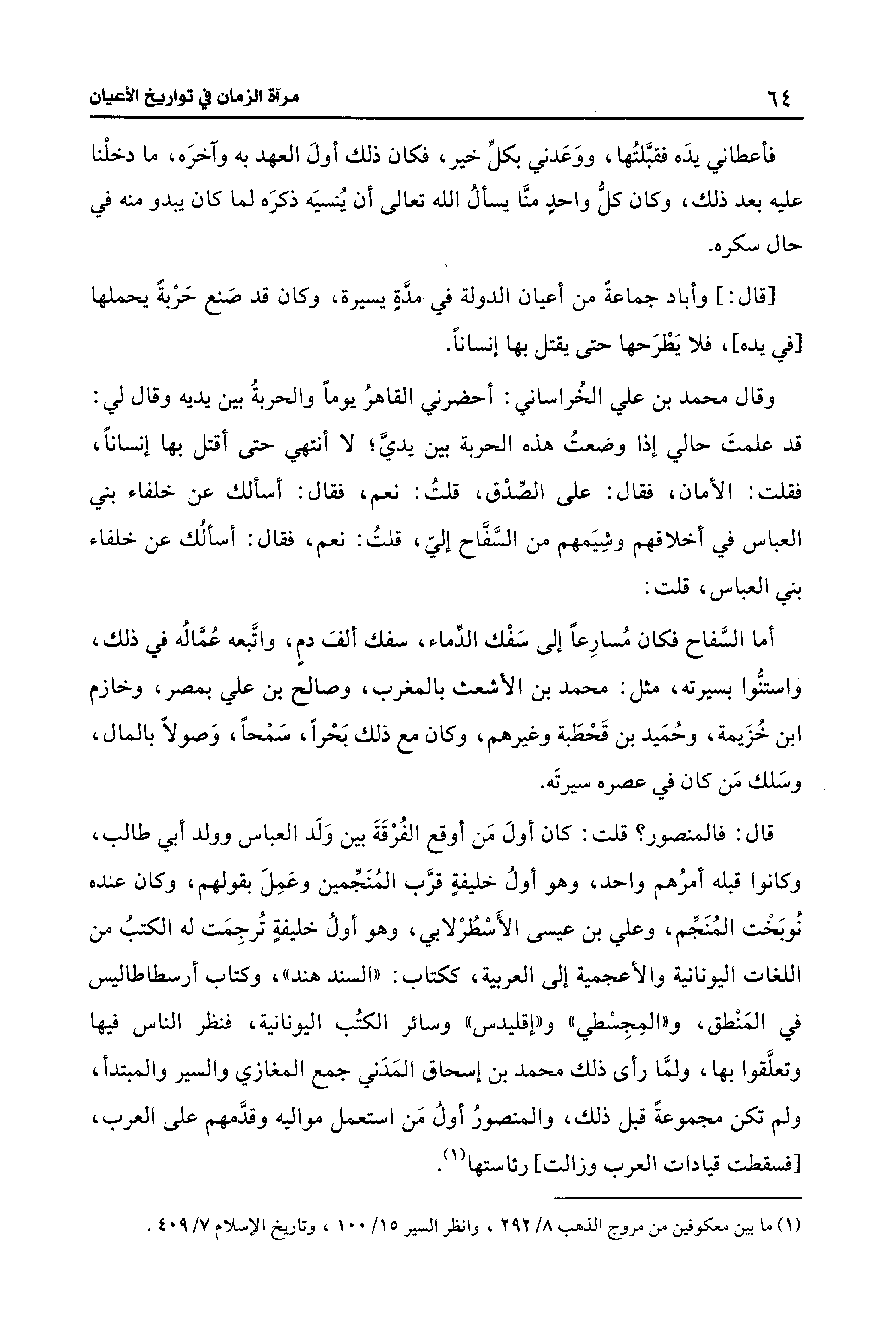 قال: فالمنصور؟ قلت: كان أولَ مَن أوقع الفُرْقَةَ بين وَلَد العباس وولد أبي طالب، وكانوا قبله أمرُهم واحد، وهو أولُ خليفةٍ قرَّب المُنَجِّمين وعَمِلَ بقولهم، وكان عنده نُوبَخْت المُنَجِّم، وعلي بن عيسى الأَسْطُرْلابي، وهو أولُ خليفةٍ تُرجِمَت له الكتبُ من اللغات اليونانية والأعجمية إلى العربية، ككتاب: "السند هند"، وكتاب أرسطاطاليس في المَنْطق، و"المِجِسْطي" و "إقليدس" وسائر الكتُب اليونانية، فنظر الناس فيها وتعلَّقوا بها، ولمَّا رأى ذلك محمد بن إسحاق المَدَني جمع المغازي والسير والمبتدأ، ولم تكن مجموعةً قبل ذلك، والمنصورُ أولُ مَن استعمل مواليه وقدَّمهم على العرب، [فسقطت قيادات العرب وزالت] رئاستها (¬1).