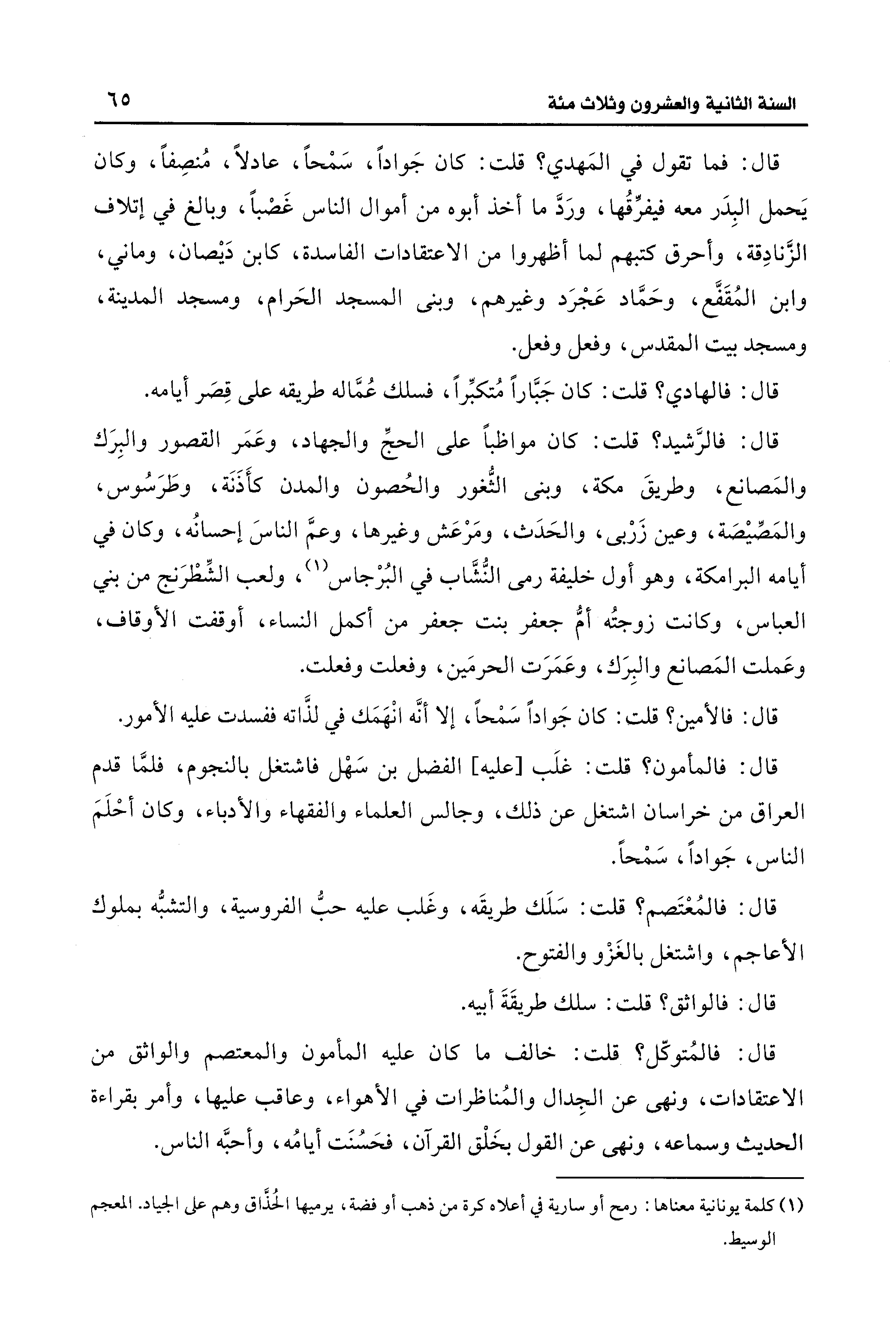 قال: فالمُتوكّل؟ قلت: خالف ما كان عليه المأمون والمعتصم والواثق من الاعتقادات، ونهى عن الجِدال والمُناظرات في الأهواء، وعاقب عليها، وأمر بقراءة الحديث وسماعه، ونهى عن القول بخَلْق القرآن، فحَسُنَت أيامُه، وأحبَّه الناس.
