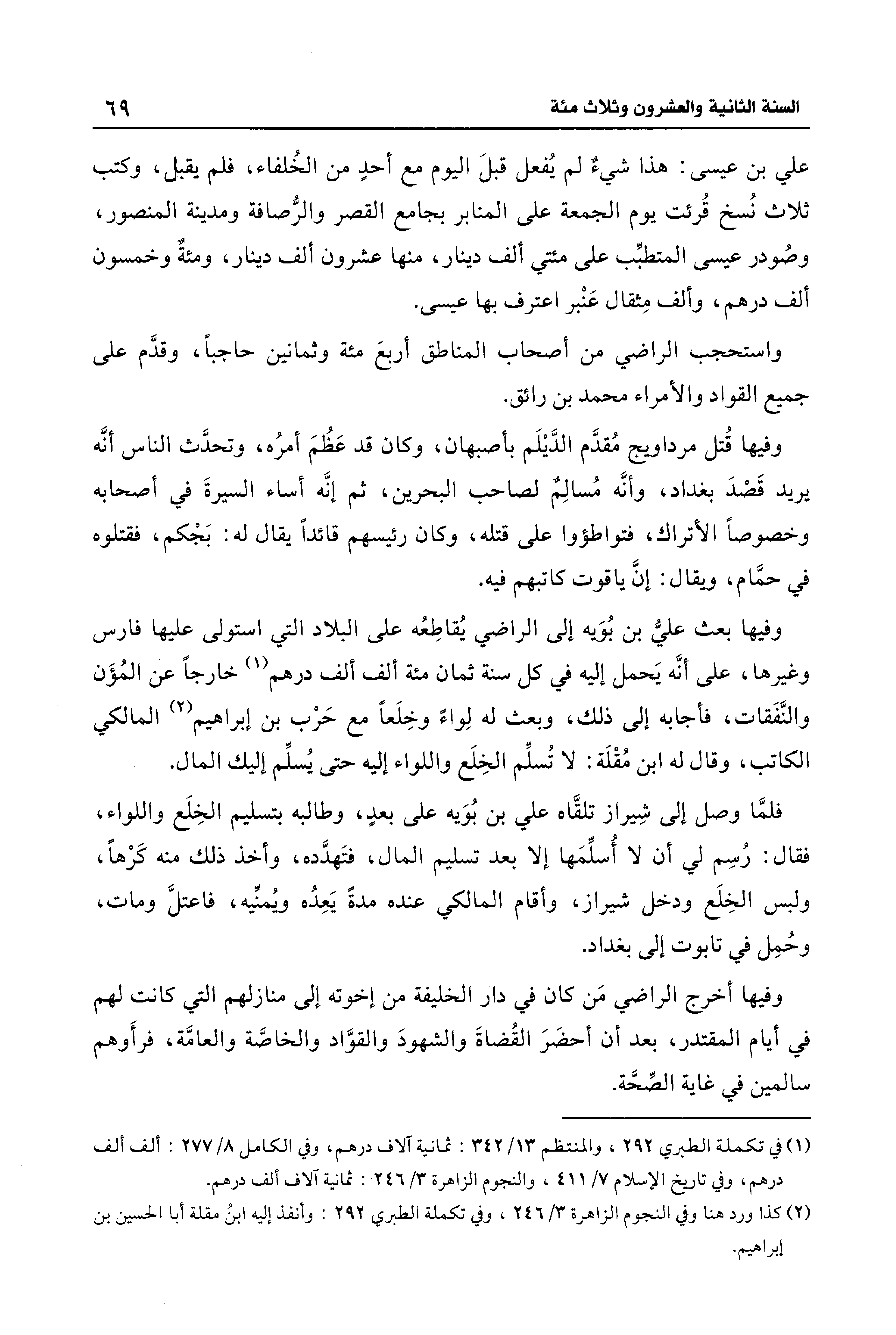 وفيها أخرج الراضي مَن كان في دار الخليفة من إخوته إلى منازلهم التي كانت لهم في أيام المقتدر، بعد أن أحضَرَ القُضاةَ والشهودَ والقوَّاد والخاصَّة والعامَّة، فرأَوهم سالمين في غاية الصِّحَّة.