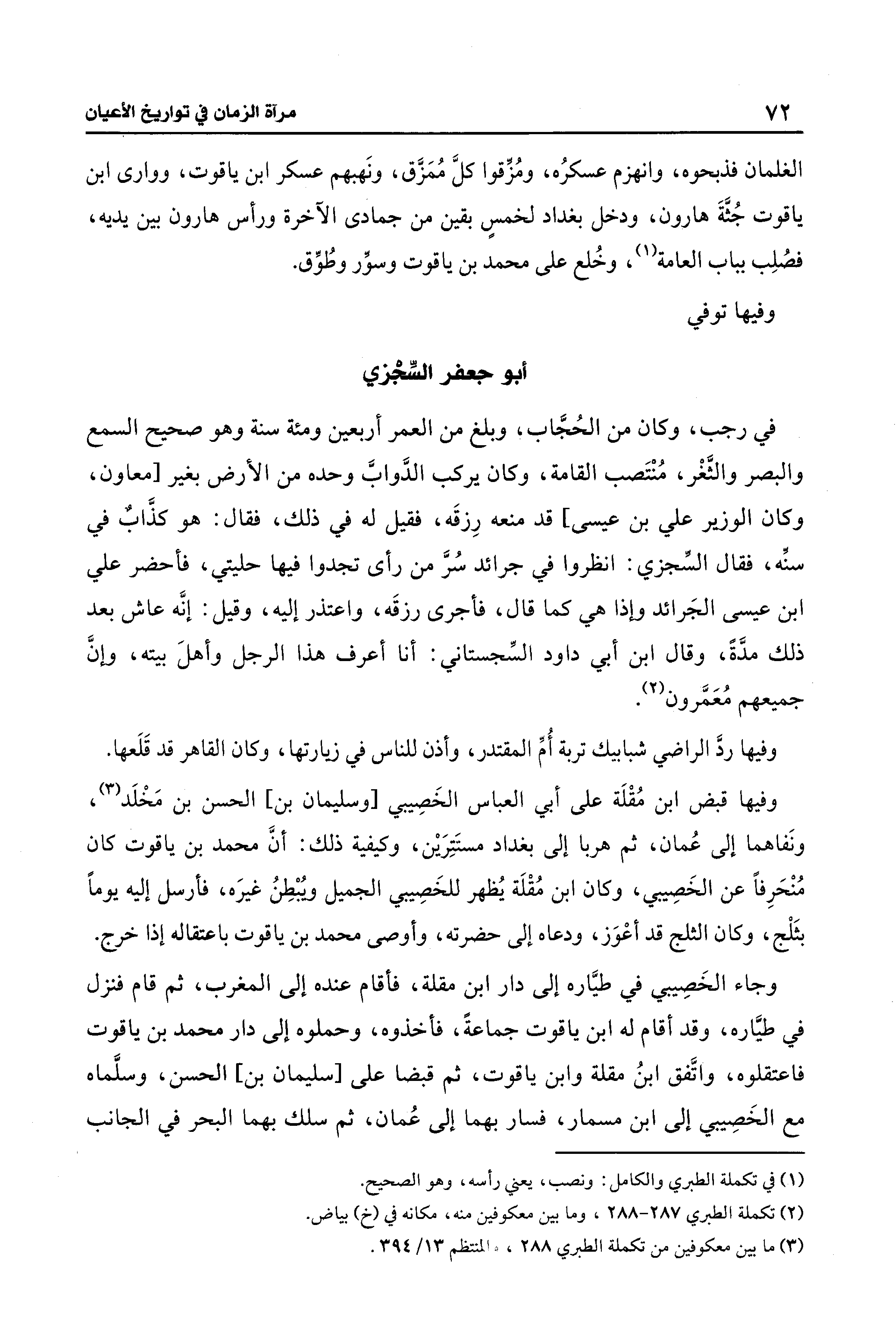 في رجب، وكان من الحُجَّاب، وبلغ من العمر أربعين ومئة سنة وهو صحيح السمع والبصر والثَّغْر، مُنْتَصب القامة، وكان يركب الدَّوابَّ وحده من الأرض بغير [معاون، وكان الوزير علي بن عيسى] قد منعه رِزقَه، فقيل له في ذلك، فقال: هو كذَّابٌ في سنِّه، فقال السِّجزي: انظروا في جرائد سُرَّ من رأى تجدوا فيها حليتي، فأحضر علي بن عيسى الجَرائد وإذا هي كما قال، فأجرى رزقَه، واعتذر إليه، وقيل: إنَّه عاش بعد ذلك مدَّةً، وقال ابن أبي داود السِّجستاني: أنا أعرف هذا الرجل وأهلَ بيته، وإنَّ جميعهم مُعَمَّرون (¬2).