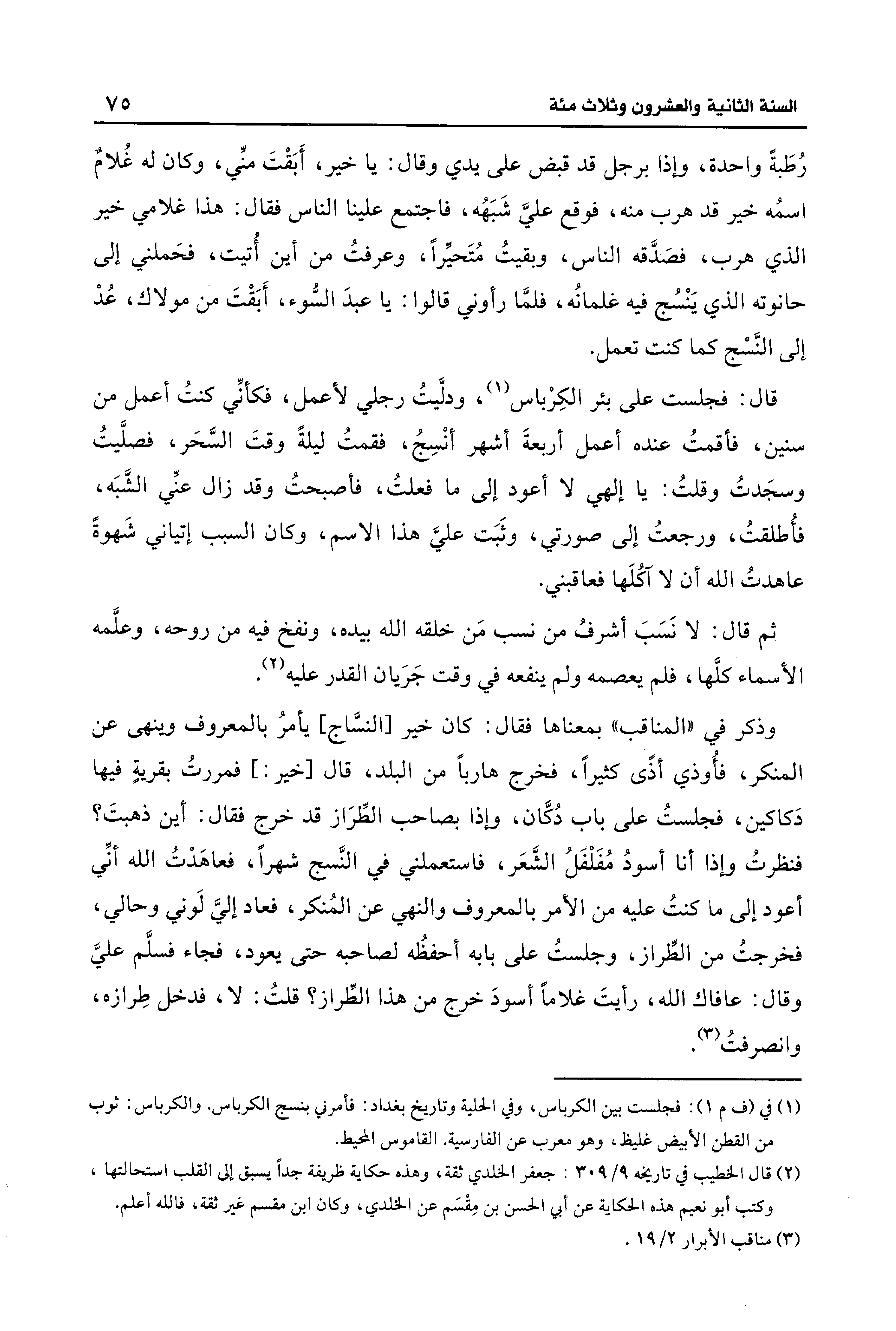 وذكر في "المناقب" بمعناها فقال: كان خير [النسَّاج] يأمرُ بالمعروف وينهى عن المنكر، فأُوذي أذًى كثيرًا، فخرج هاربًا من البلد، قال [خير: ] فمررتُ بقريةٍ فيها دَكاكين، فجلستُ على باب دُكَّان، وإذا بصاحب الطِّرَاز قد خرج فقال: أين ذهبتَ؟ فنظرتُ وإذا أنا أسودُ مُفَلْفَلُ الشَّعَر، فاستعملني في النَّسج شهرًا، فعاهَدْتُ الله أنِّي أعود إلى ما كنتُ عليه من الأمر بالمعروف والنهي عن المُنكر، فعاد إليَّ لَوني وحالي، فخرجتُ من الطِّراز، وجلستُ على بابه أحفظُه لصاحبه حتى يعود، فجاء فسلَّم عليَّ وقال: عافاك الله، رأيتَ غلامًا أسودَ خرج من هذا الطِّراز؟ قلتُ: لا، فدخل طِرازه، وانصرفتُ (¬3).