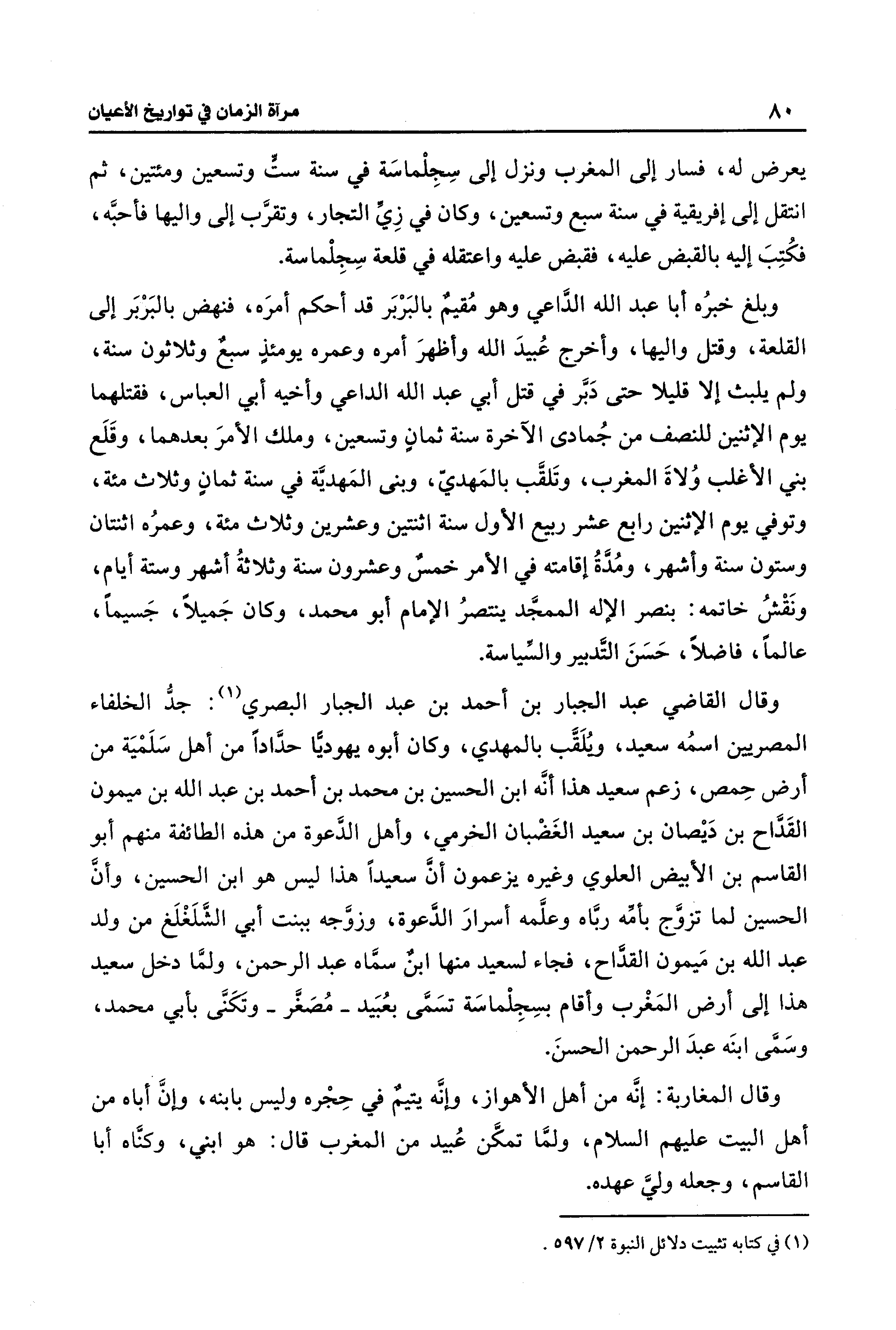 وقال القاضي عبد الجبار بن أحمد بن عبد الجبار البصري (¬1): جدُّ الخلفاء المصريين اسمُه سعيد، ويُلَقَّب بالمهدي، وكان أبوه يهوديًّا حدَّادًا من أهل سَلَمْيَة من أرض حِمص، زعم سعيد هذا أنَّه ابن الحسين بن محمد بن أحمد بن عبد الله بن ميمون القَدَّاح بن دَيْصان بن سعيد الغَضْبان الخرمي، وأهل الدَّعوة من هذه الطائفة منهم أبو القاسم بن الأبيض العلوي وغيره يزعمون أنَّ سعيدًا هذا ليس هو ابن الحسين، وأنَّ الحسين لما تزوَّج بأمِّه ربَّاه وعلَّمه أسرارَ الدَّعوة، وزوَّجه ببنت أبي الشَّلَغْلَغ من ولد عبد الله بن مَيمون القدَّاح، فجاء لسعيد منها ابنٌ سمَّاه عبد الرحمن، ولمَّا دخل سعيد هذا إلى أرض المَغْرب وأقام بسِجِلْماسَة تسَمَّى بعُبَيد -مُصغَّر- وتَكَنَّى بأبي محمد، وسَمَّى ابنَه عبدَ الرحمن الحسنَ.