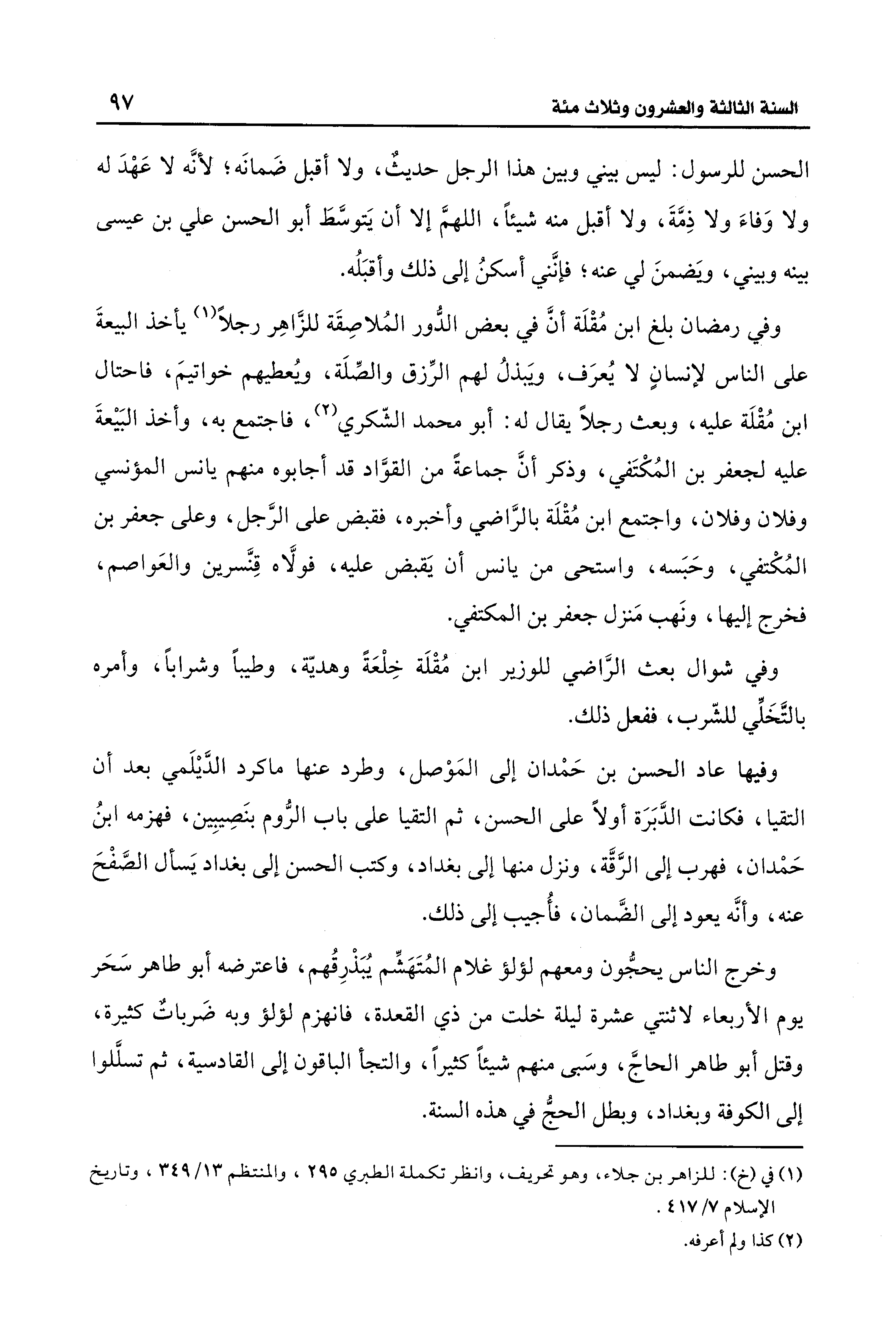 وفيها عاد الحسن بن حَمْدان إلى المَوْصل، وطرد عنها ماكرد الدَّيلَمي بعد أن التقيا، فكانت الدَّبَرَة أولًا على الحسن، ثم التقيا على باب الرُّوم بنَصيبِين، فهزمه ابنُ حَمْدان، فهرب إلى الرَّقَّة، ونزل منها إلى بغداد، وكتب الحسن إلى بغداد يَسأل الصَّفْحَ عنه، وأنَّه يعود إلى الضَّمان، فأُجيب إلى ذلك.