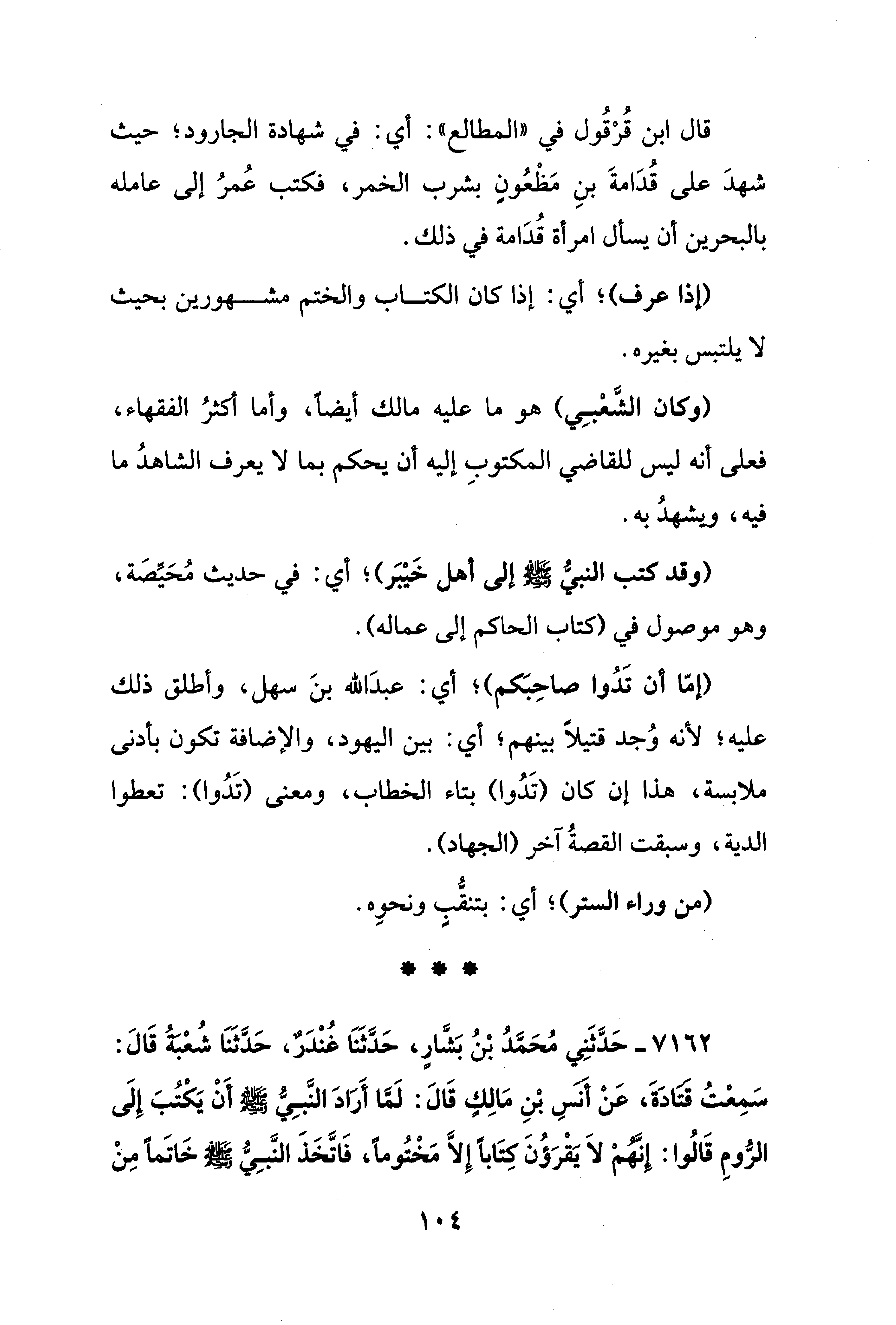 7162 - حَدَّثَنِي مُحَمدُ بْنُ بَشَّارٍ، حَدَّثَنَا غنْدَرٌ، حَدثَنَا شُعْبةُ قَالَ: سَمِعْتُ قتادَةَ، عَنْ أَنس بْنِ مَالِكٍ قَالَ: لَما أَرَادَ النبي - صلى الله عليه وسلم - أَنْ يَكْتُبَ إِلَى الرُّومِ قَالُوا: إِنهم لَا يَقْرَؤُنَ كِتَابًا إِلَّا مَخْتُومًا، فَاتَّخَذَ النَّبِي - صلى الله عليه وسلم - خَاتَمًا مِنْ