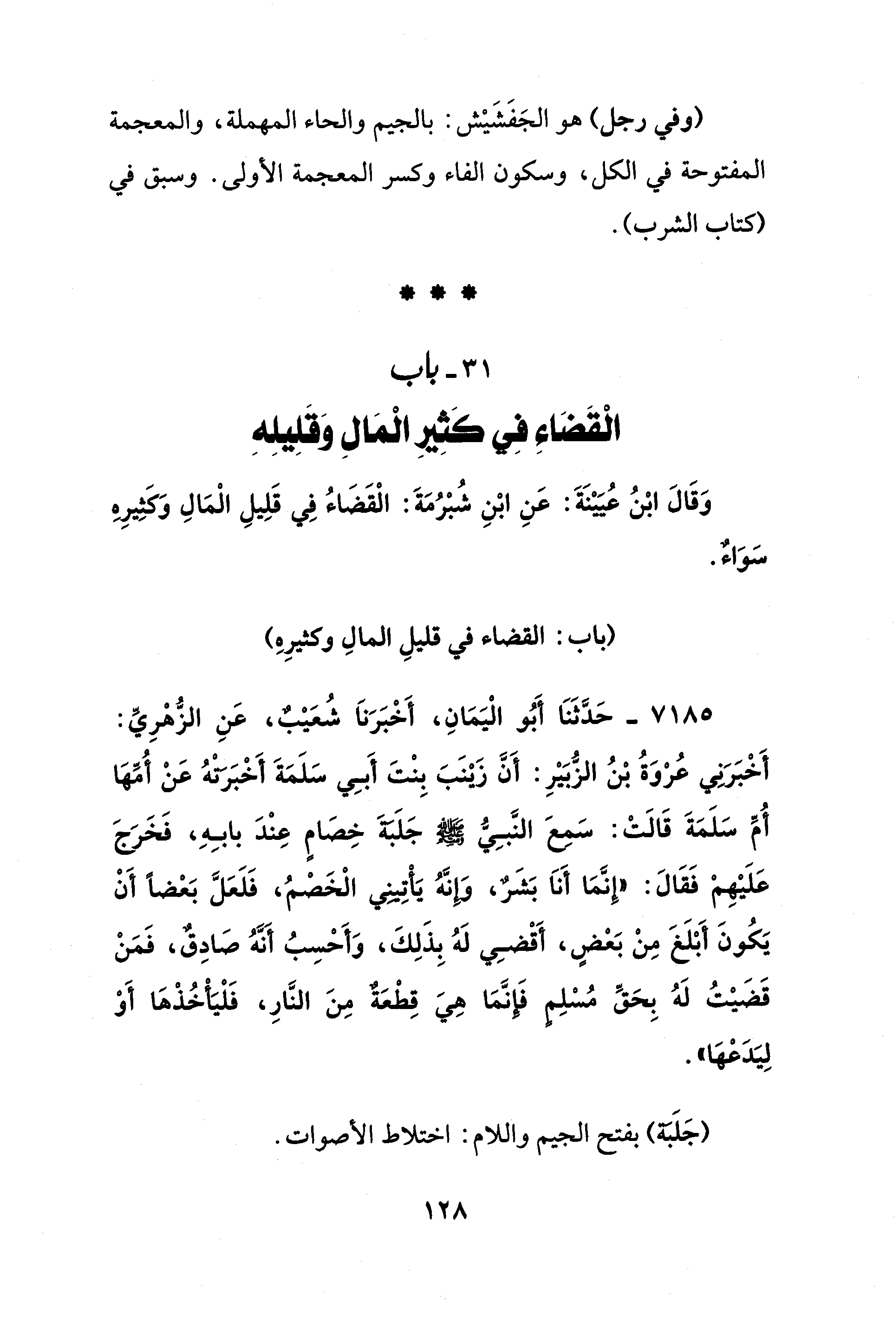 7185 - حَدَّثَنَا أَبُو الْيَمَانِ، أَخْبَرَنَا شُعَيْبٌ، عَنِ الزُّهْرِيِّ: أَخْبَرَني عُرْوَةُ بْنُ الزُّبيْرِ: أَنَّ زَيْنَبَ بِنْتَ أَبِي سَلَمَةَ أَخْبَرَتْهُ عَنْ أُمِّهَا أُمِّ سَلَمَةَ قَالَتْ: سَمِعَ النَّبِيُّ - صلى الله عليه وسلم - جَلبَةَ خِصَامٍ عِنْدَ بابِهِ، فَخَرَجَ عَلَيْهِمْ فَقَالَ: "إِنَّمَا أَنَا بَشَرٌ، وَإِنَّهُ يَأْتِينِي الْخَصْمُ، فَلَعَلَّ بَعْضًا أَنْ يَكُونَ أَبْلَغَ مِنْ بَعْضٍ، أَقْضِي لَهُ بِذَلِكَ، وَأَحْسِبُ أَنَّهُ صَادِقٌ، فَمَنْ قَضَيْتُ لَهُ بِحَقِّ مُسْلِمٍ فَإِنَّمَا هِيَ قِطْعَةٌ مِنَ النَّارِ، فَلْيَأْخُذْهَا أَوْ لِيَدَعْهَا".