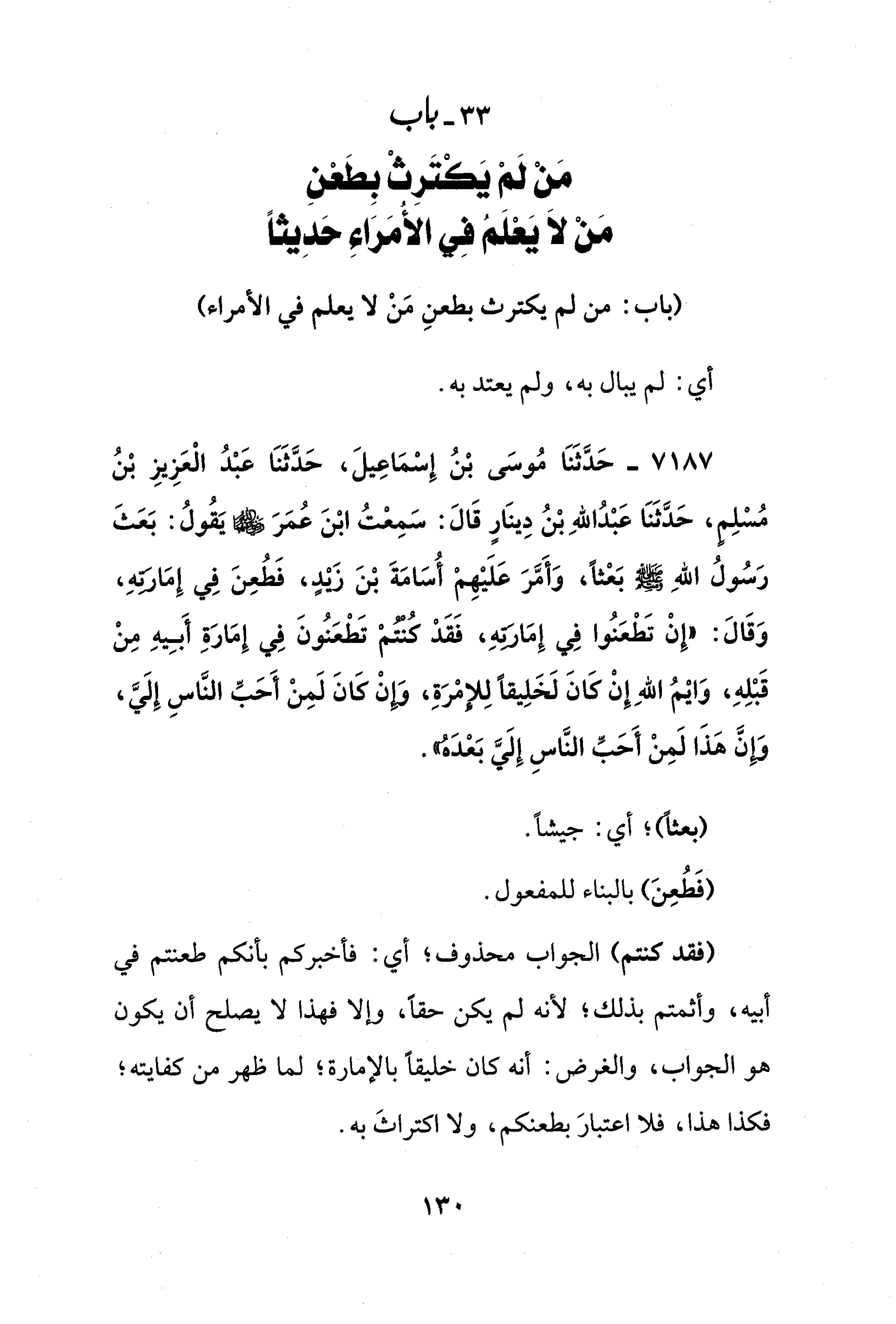 33 - باب مَنْ لَمْ يَكْتَرِثْ بِطَعْنِ مَنْ لَا يَعْلَمُ فِي الأُمَرَاءِ حَدِيثًا