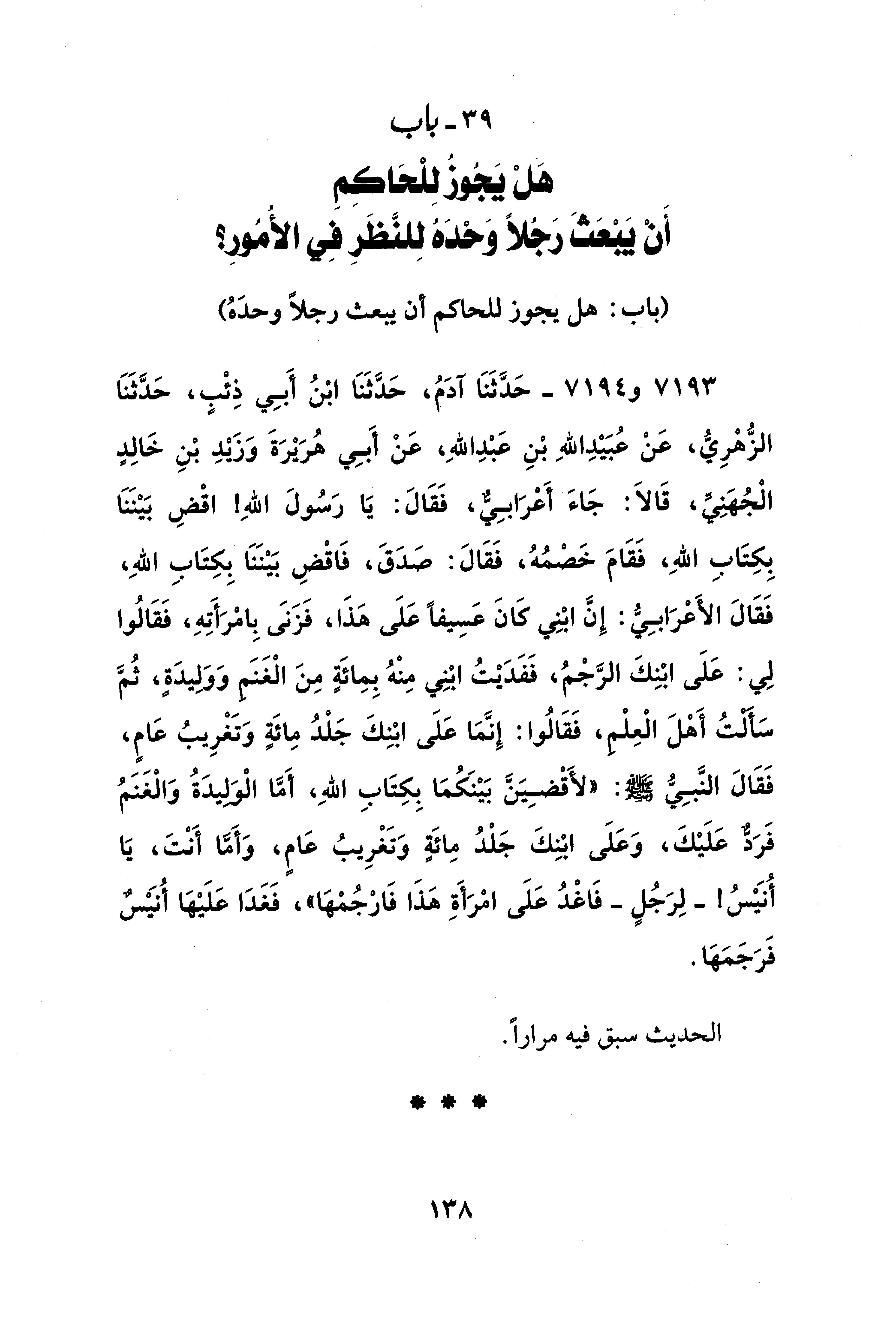 7193 - و 7194 - حَدَّثَنَا آدَمُ، حَدَّثَنَا ابْنُ أَبَي ذِئْبٍ، حَدَّثَنَا الزُّهْرِيُّ، عَنْ عُبَيْدِ اللهِ بْنِ عَبْدِ اللهِ، عَنْ أَبِي هُرَيْرَةَ وَزَيْدِ بْنِ خَالِدٍ الْجُهَنِيِّ، قَالَا: جَاءَ أَعْرَابِيٌّ، فَقَالَ: يَا رَسُولَ اللهِ! اقْضِ بَيْنَنَا بِكِتَابِ اللهِ، فَقَامَ خَصْمُهُ، فَقَالَ: صَدَقَ، فَاقْضِ بَيْنَنَا بِكِتَابِ اللهِ، فَقَالَ الأَعْرَابِيُّ: إِنَّ ابْنِي كَانَ عَسِيفًا عَلَى هَذَا، فَزَنىَ بِامْرَأَتِهِ، فَقَالُوا لِي: عَلَى ابْنِكَ الرَّجْمُ، فَفَدَيْتُ ابْنِي مِنْهُ بِمِائَةٍ مِنَ الْغَنَمِ وَوَلِيدَةٍ، ثُمَّ سَأَلْتُ أَهْلَ الْعِلْم، فَقَالُوا: إِنَّمَا عَلَى ابْنِكَ جَلْدُ مِائَةٍ وَتَغْرِيبُ عَامٍ، فَقَالَ النَّبِيُّ - صلى الله عليه وسلم -: "لأَقْضِيَنَّ بَيْنَكُمَا بِكِتَابِ اللهِ، أَمَّا الْوَلِيدَةُ وَالْغَنَمُ فَرَدٌّ عَلَيْكَ، وَعَلَى ابْنِكَ جَلْدُ مِائَةٍ وَتَغْرِيبُ عَامٍ، وَأَمَّا أَنْتَ، يَا أُنيسُ! -لِرَجُلٍ- فَاغْدُ عَلَى امْرَأَةِ هَذَا فَارْجُمْهَا"، فَغَدَا عَلَيْهَا أُنَيْسٌ فَرَجَمَهَا.