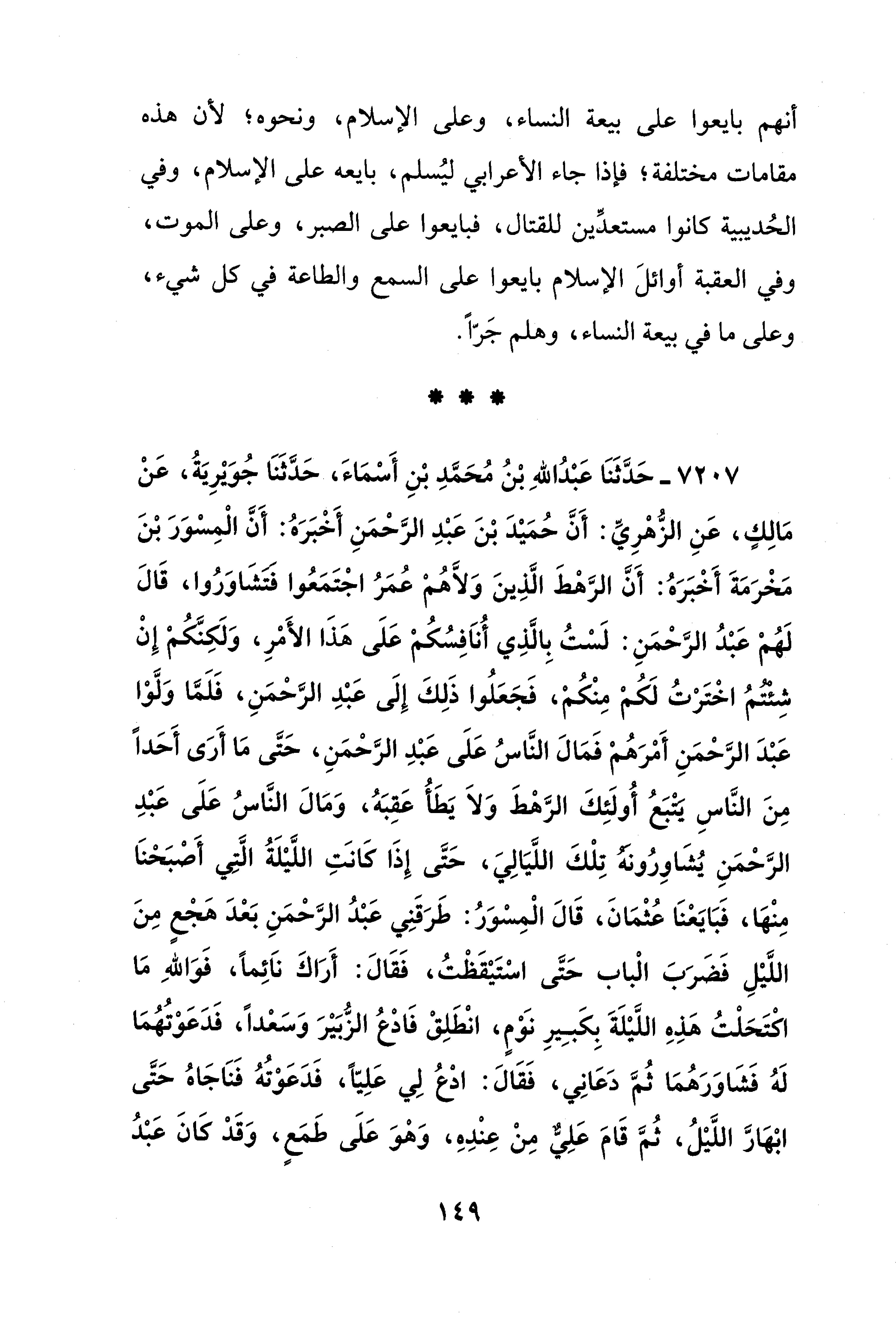 7207 - حَدَّثَنَا عَبْدُ اللهِ بْنُ مُحَمَّدِ بْنِ أَسْمَاءَ، حَدَّثَنَا جُويرِيَةُ، عَنْ مَالِكٍ، عَنِ الزُّهْرِيِّ: أَنَّ حُمَيْدَ بْنَ عَبْدِ الرَّحْمَنِ أَخْبَرَهُ: أَنَّ الْمِسْوَرَ بْنَ مَخْرَمَةَ أَخْبَرَهُ: أَنَّ الرَّهْطَ الَّذِينَ وَلَّاهُمْ عُمَرُ اجْتَمَعُوا فتشَاوَرُوا، قَالَ لَهُمْ عَبْدُ الرَّحْمَنِ: لَسْتُ بِالَّذِي أُنَافِسُكُمْ عَلَى هَذَا الأَمْرِ، وَلَكِنَّكُمْ إِنْ شِئتمُ اخْتَرْتُ لَكُمْ مِنْكُمْ، فَجَعَلُوا ذَلِكَ إِلَى عَبْدِ الرَّحْمَنِ، فَلَمَّا وَلَّوْا عَبْدَ الرَّحْمَنِ أَمْرَهُمْ فَمَالَ النَّاسُ عَلَى عَبْدِ الرَّحْمَنِ، حَتَّى مَا أَرَى أَحَدًا مِنَ النَّاسِ يَتْبَعُ أُولَئِكَ الرَّهْطَ وَلَا يَطَأُ عَقِبَهُ، وَمَالَ النَّاسُ عَلَى عَبْدِ الرَّحْمَنِ يُشَاوِرُونهُ تِلْكَ اللَّيَالِيَ، حَتَّى إِذَا كَانَتِ اللَّيْلَةُ الَّتِي أَصْبَحْنَا مِنْهَا، فَبَايَعْنَا عُثْمَانَ، قَالَ الْمِسْوَرُ: طَرَقَنِي عَبْدُ الرَّحْمَنِ بَعْدَ هَجْعٍ مِنَ اللَّيْلِ فَضَرَبَ الْباب حَتَّى اسْتَيْقَظْتُ، فَقَالَ: أَرَاكَ ناَئِمًا، فَوَاللهِ مَا اكْتَحَلْتُ هَذِهِ اللَّيْلَةَ بِكَبِيرِ نَوْمٍ، انْطَلِقْ فَادْعُ الزُّبَيْرَ وَسَعْدًا، فَدَعَوْتُهُمَا لَهُ فَشَاوَرَهُمَا ثُمَّ دَعَانِي، فَقَالَ: ادْعُ لِي عَلِيًّا، فَدَعَوْتُهُ فَنَاجَاهُ حَتَّى ابْهَارَّ اللَّيْلُ، ثُمَّ قَامَ عَلِيٌّ مِنْ عِنْدِهِ، وَهْوَ عَلَى طَمَعٍ، وَقَدْ كَانَ عَبْدُ