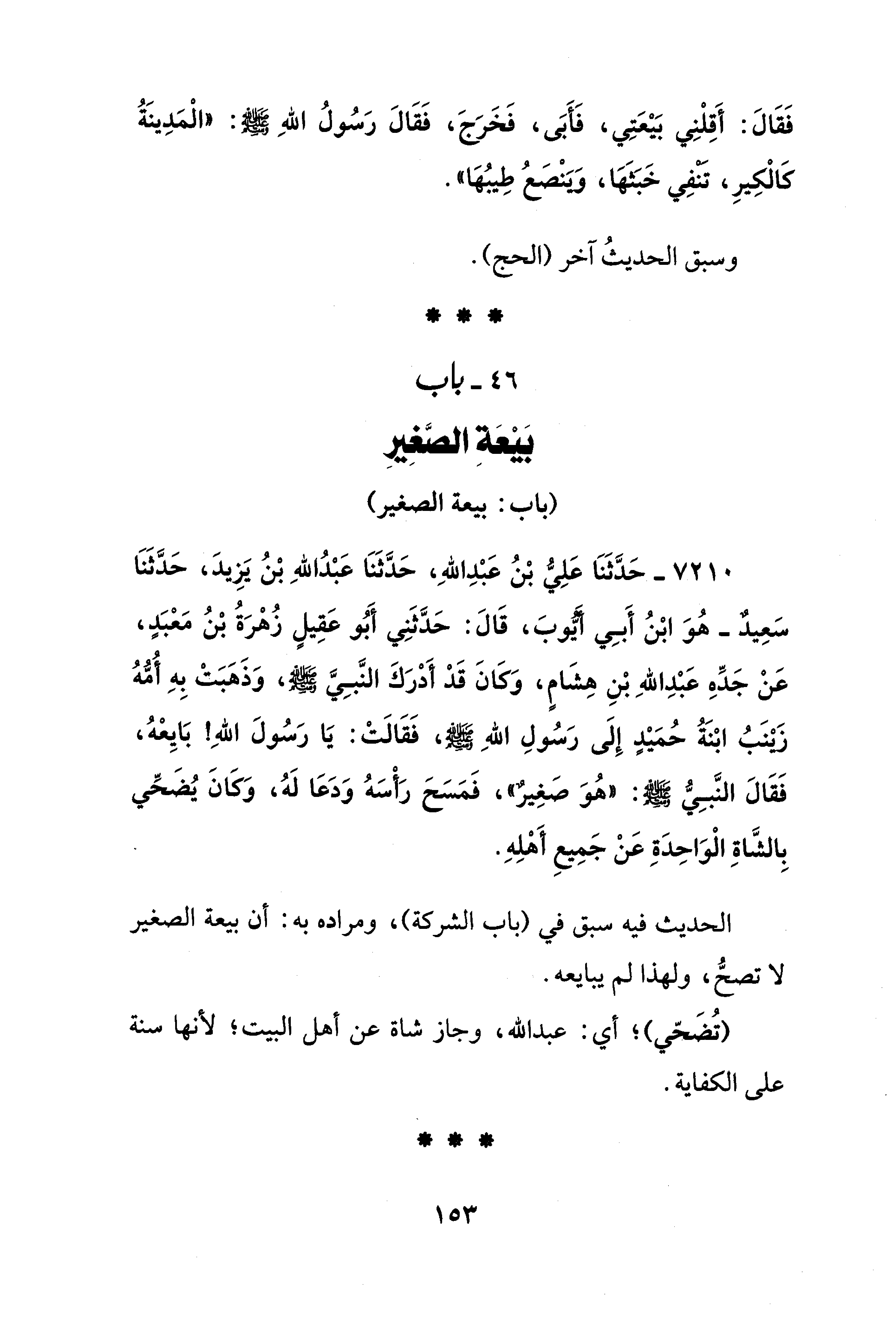 7210 - حَدَّثَنَا عَلِيُّ بْنُ عَبْدِ اللهِ، حَدَّثَنَا عَبْدُ اللهِ بْنُ يَزِيدَ، حَدَّثَنَا سَعِيدٌ -هُوَ ابْنُ أَبِي أَيُّوبَ، قَالَ: حَدَّثَنِي أَبُو عَقِيلٍ زُهْرَةُ بْنُ مَعْبَدٍ، عَنْ جَدِّهِ عَبْدِ اللهِ بْنِ هِشَامٍ، وَكَانَ قَدْ أَدْرَكَ النَّبِيَّ - صلى الله عليه وسلم -، وَذَهَبَتْ بِهِ أُمُّهُ زَيْنَبُ ابْنَةُ حُمَيْدٍ إِلَى رَسُولِ اللهِ - صلى الله عليه وسلم -، فَقَالَتْ: يَا رَسُولَ اللهِ! بَايِعْهُ، فَقَالَ النَّبِيُّ - صلى الله عليه وسلم -: "هُوَ صَغِيرٌ"، فَمَسَحَ رَأْسَهُ وَدَعَا لَهُ، وَكَانَ يُضَحِّي بِالشَّاةِ الْوَاحِدَةِ عَنْ جَمِيعِ أَهْلِهِ.