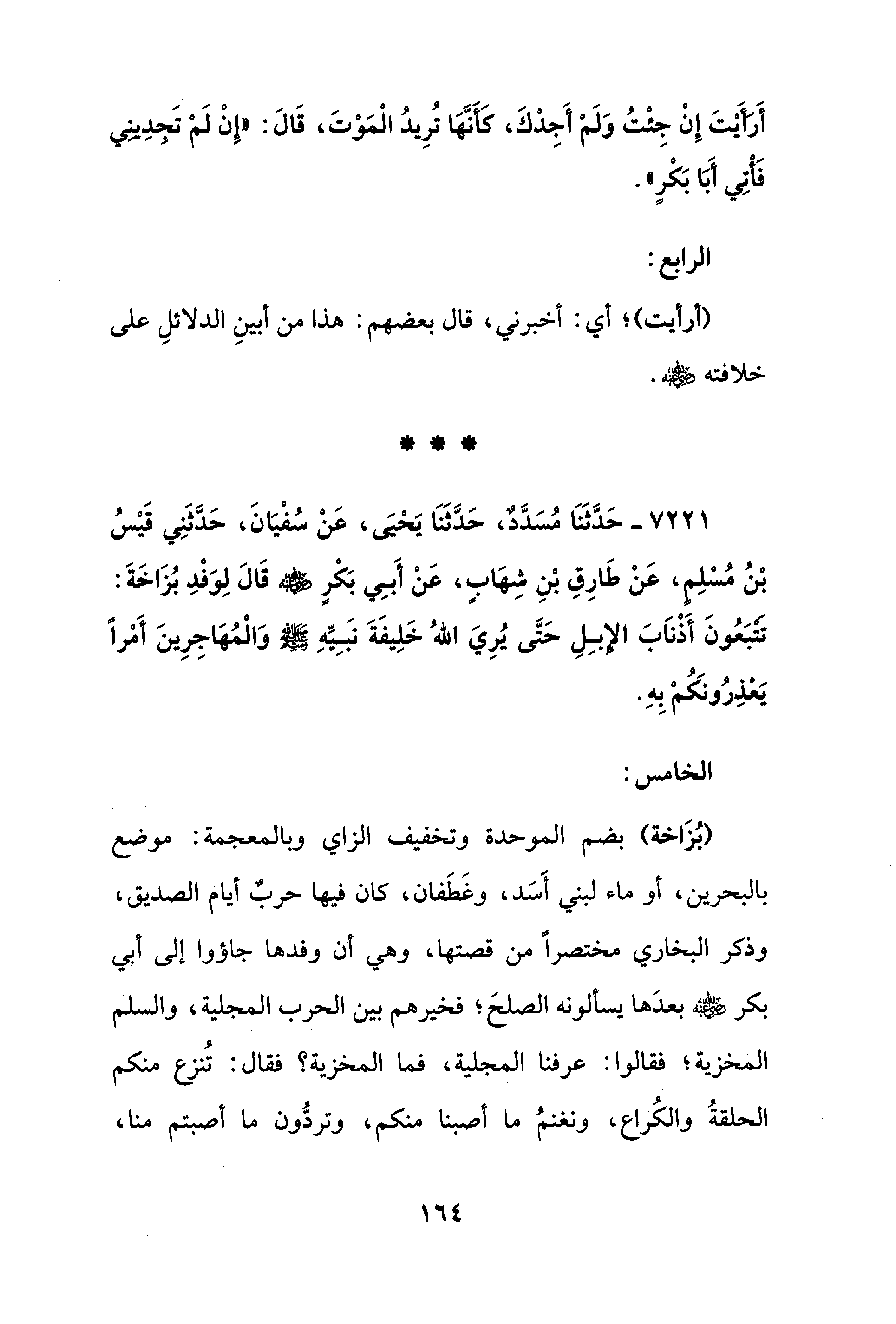 7221 - حَدَّثَنَا مُسَدَّدٌ، حَدَّثَنَا يَحْيَى، عَنْ سُفْيَانَ، حَدَّثَنِي قَيْسُ بْنُ مُسْلِمٍ، عَنْ طَارِقِ بْنِ شِهَابٍ، عَنْ أَبِي بَكْرٍ - رضي الله عنه - قَالَ لِوَفْدِ بُزَاخَةَ: تتبَعُونَ أَذْنَابَ الإبِلِ حَتَّى يُرِيَ اللهُ خَلِيفَةَ نبَيِّهِ - صلى الله عليه وسلم - وَالْمُهَاجِرِينَ أَمْرًا يَعْذِرُونكُمْ بِهِ.