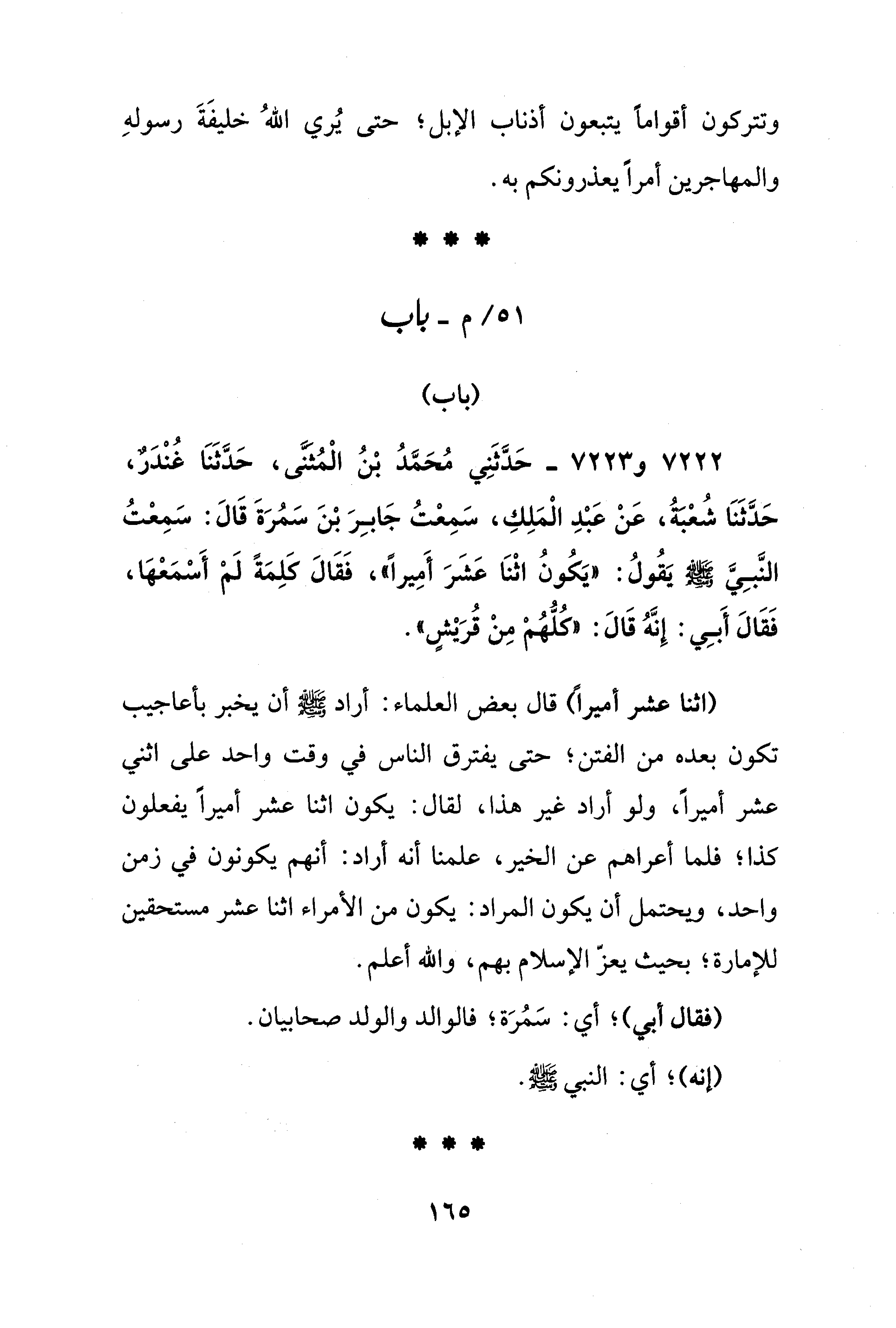7222 - و 7223 - حَدَّثَنِي مُحَمَّدُ بْنُ الْمُثَنَّى، حَدَّثَنَا غُنْدَرٌ، حَدَّثَنَا شُعْبَةُ، عَنْ عَبْدِ الْمَلِكِ، سَمِعْتُ جَابِرَ بْنَ سَمُرَةَ قَالَ: سَمِعْتُ النَّبِيَّ - صلى الله عليه وسلم - يَقُولُ: "يَكُونُ اثْنَا عَشَرَ أَمِيرًا"، فَقَالَ كلِمَةً لَمْ أَسْمَعْهَا، فَقَالَ أَبِي: إِنَّهُ قَالَ: "كُلُّهُمْ مِنْ قُرَيْشٍ".