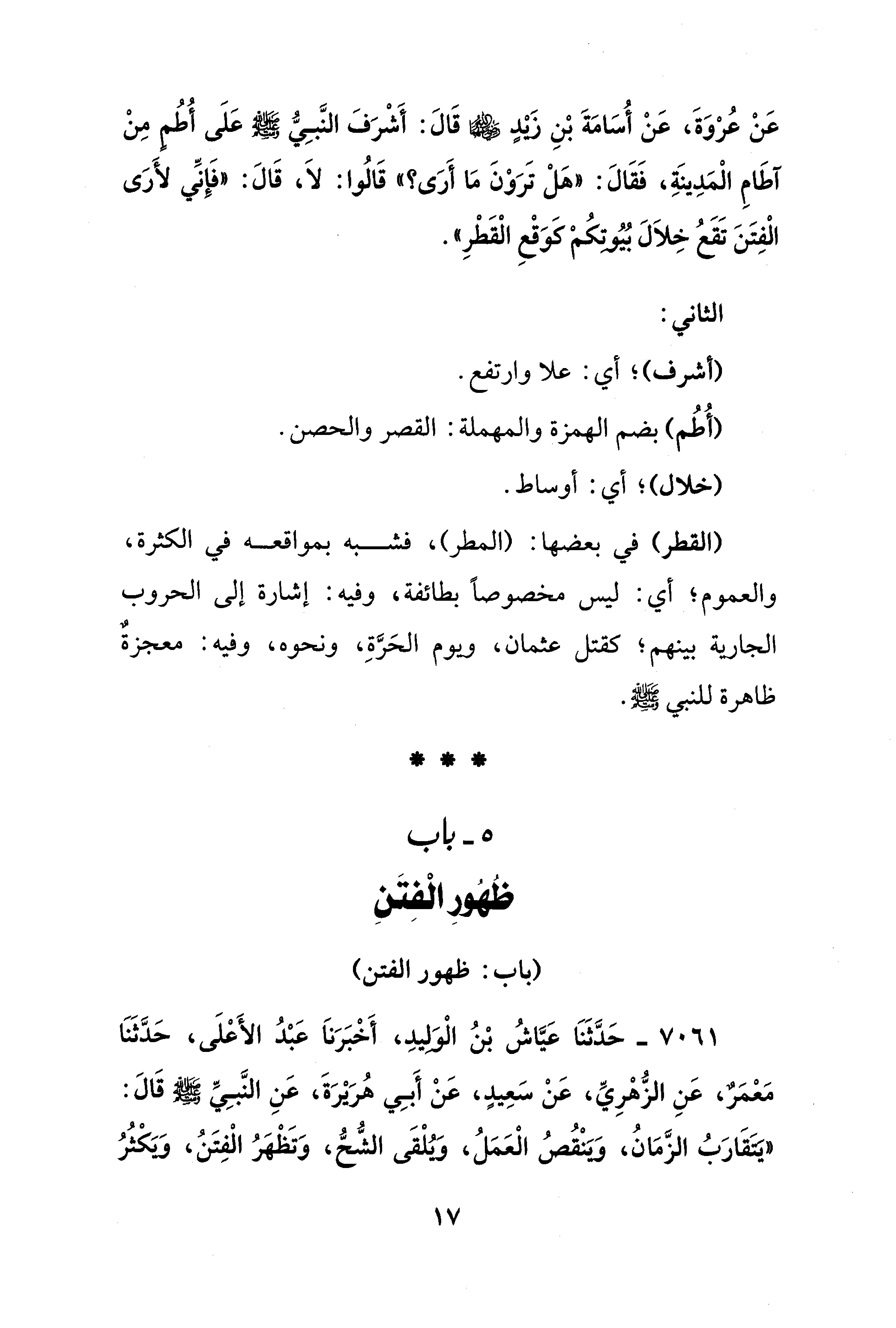عَنْ عُرْوَةَ، عَنْ أُسَامَةَ بْنِ زيدٍ - رضي الله عنهما - قَالَ: أَشْرَفَ النَّبِيُّ - صلى الله عليه وسلم - عَلَى أُطُم مِنْ آطَامِ الْمَدِينَةِ، فَقَالَ: "هَلْ تَرَوْنَ مَا أَرَى؟ " قَالُوا: لَا، قَالَ: "فَإِنِّي لأَرَى الْفِتَنَ تَقَعُ خِلاَلَ بُيُوتكُم كوَقْعِ الْقَطْرِ".