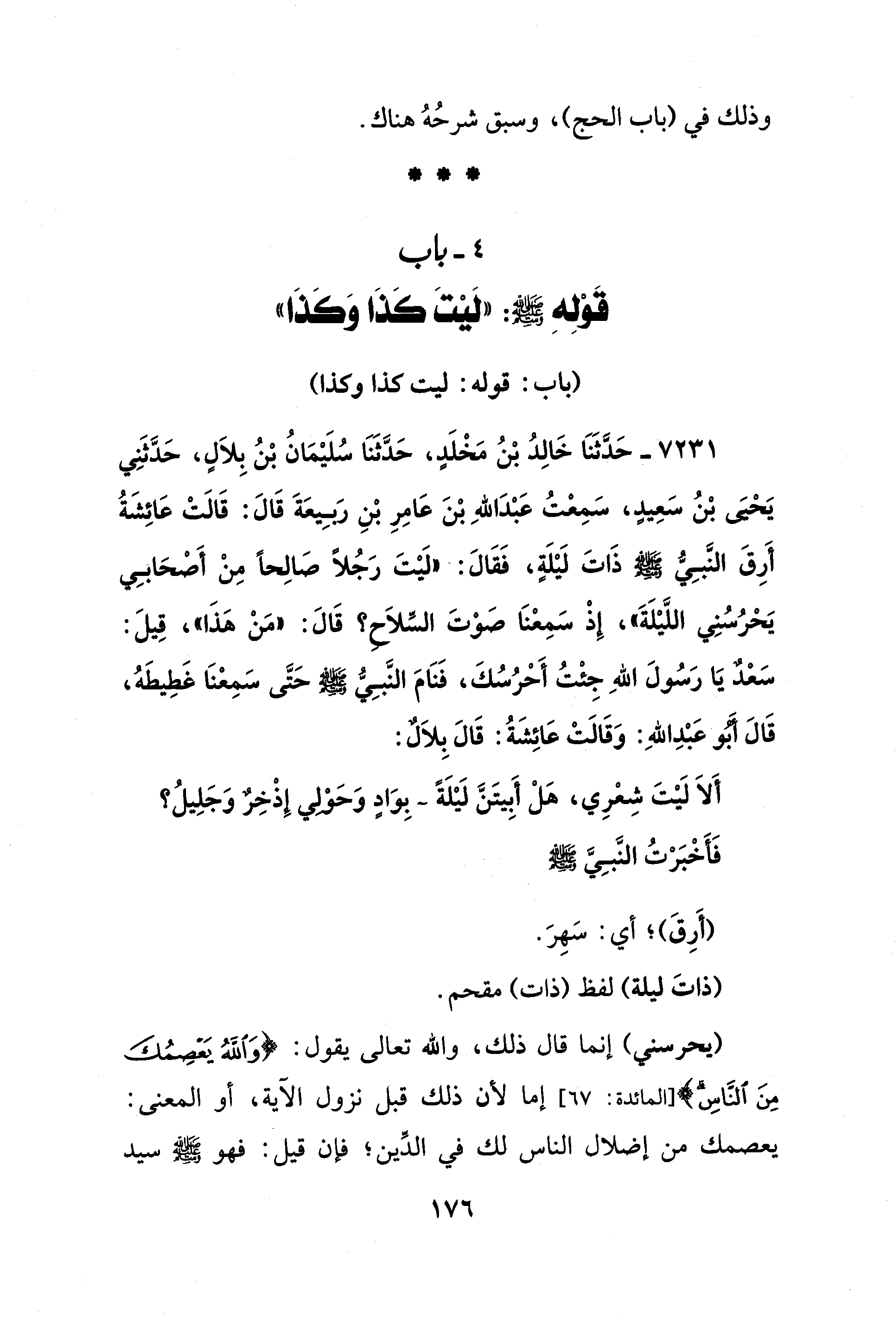 7231 - حَدَّثَنَا خَالِدُ بْنُ مَخْلَدٍ، حَدَّثَنَا سُلَيْمَانُ بْنُ بِلاَلٍ، حَدَّثَنِي يَحْيَى بْنُ سَعِيدٍ، سَمِعْتُ عَبْدَ اللهِ بْنَ عَامِرِ بْنِ رَبِيعَةَ قَالَ: قَالَتْ عَائِشَةُ أَرِقَ النَّبِيُّ - صلى الله عليه وسلم - ذَاتَ لَيلَةٍ، فَقَالَ: "لَيتَ رَجُلًا صَالِحًا مِنْ أَصْحَابِي يَحْرُسُنِي اللَّيْلَةَ"، إِذْ سَمِعْنَا صَوْتَ السِّلاَح؟ قَالَ: "مَنْ هَذَا"، قِيلَ: سَعْدٌ يَا رَسُولَ اللهِ جِئْتُ أَحْرُسُكَ، فَنَامَ النَّبِيُّ - صلى الله عليه وسلم - حَتَّى سَمِعْنَا غَطِيطَهُ، قَالَ أَبُو عَبْدِ اللهِ: وَقَالَتْ عَائِشَةُ: قَالَ بِلاَلٌ: