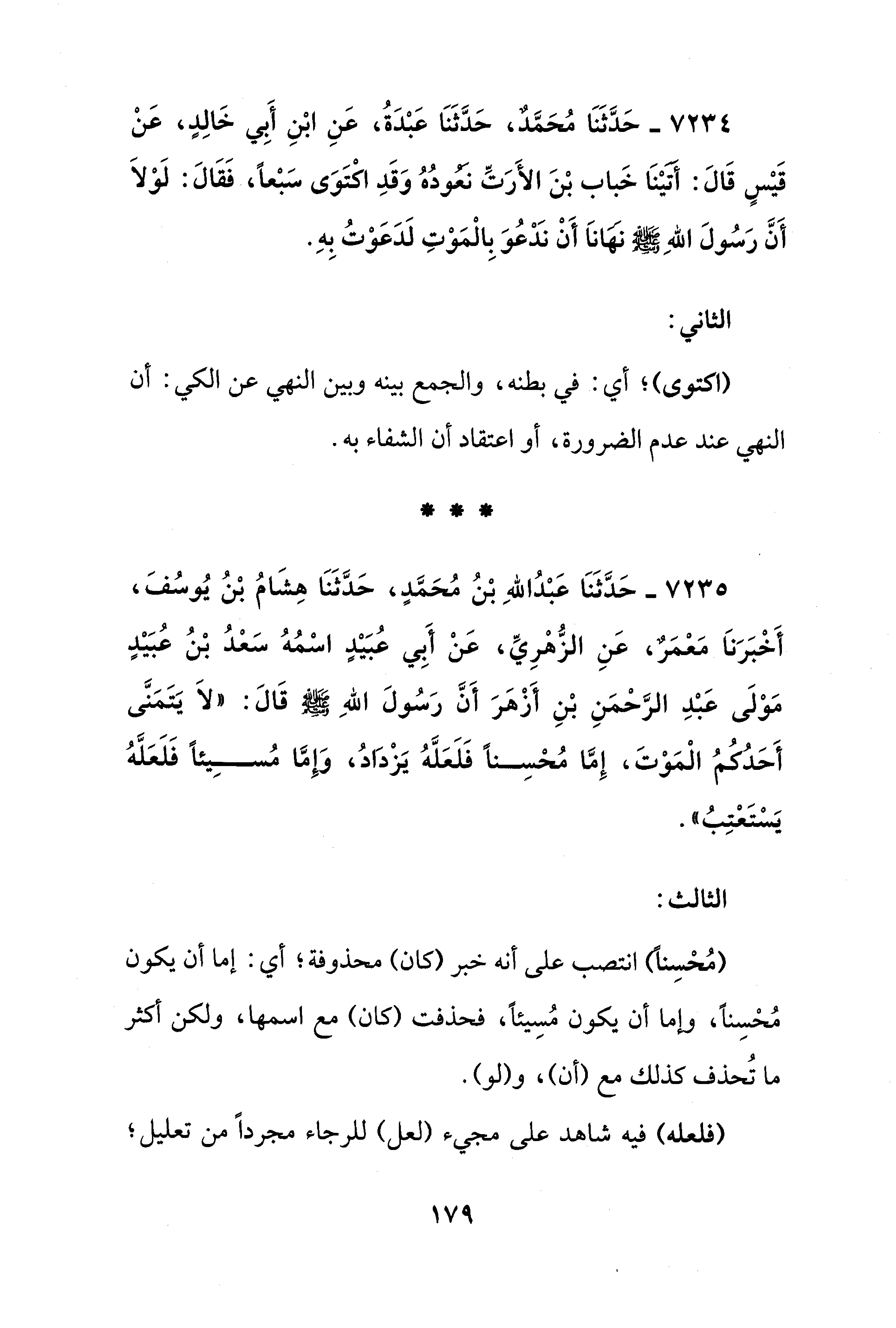 7234 - حَدَّثَنَا مُحَمَّدٌ، حَدَّثَنَا عَبْدَةُ، عَنِ ابْنِ أَبِي خَالِدٍ، عَنْ قَيْسٍ قَالَ: أتيْنَا خَباب بْنَ الأَرَتِّ نعودُهُ وَقَدِ اكْتَوَى سَبْعًا، فَقَالَ: لَوْلَا أَنَّ رَسُولَ اللهِ - صلى الله عليه وسلم - نهانَا أَنْ نَدْعُوَ بِالْمَوْتِ لَدَعَوْتُ بِهِ.