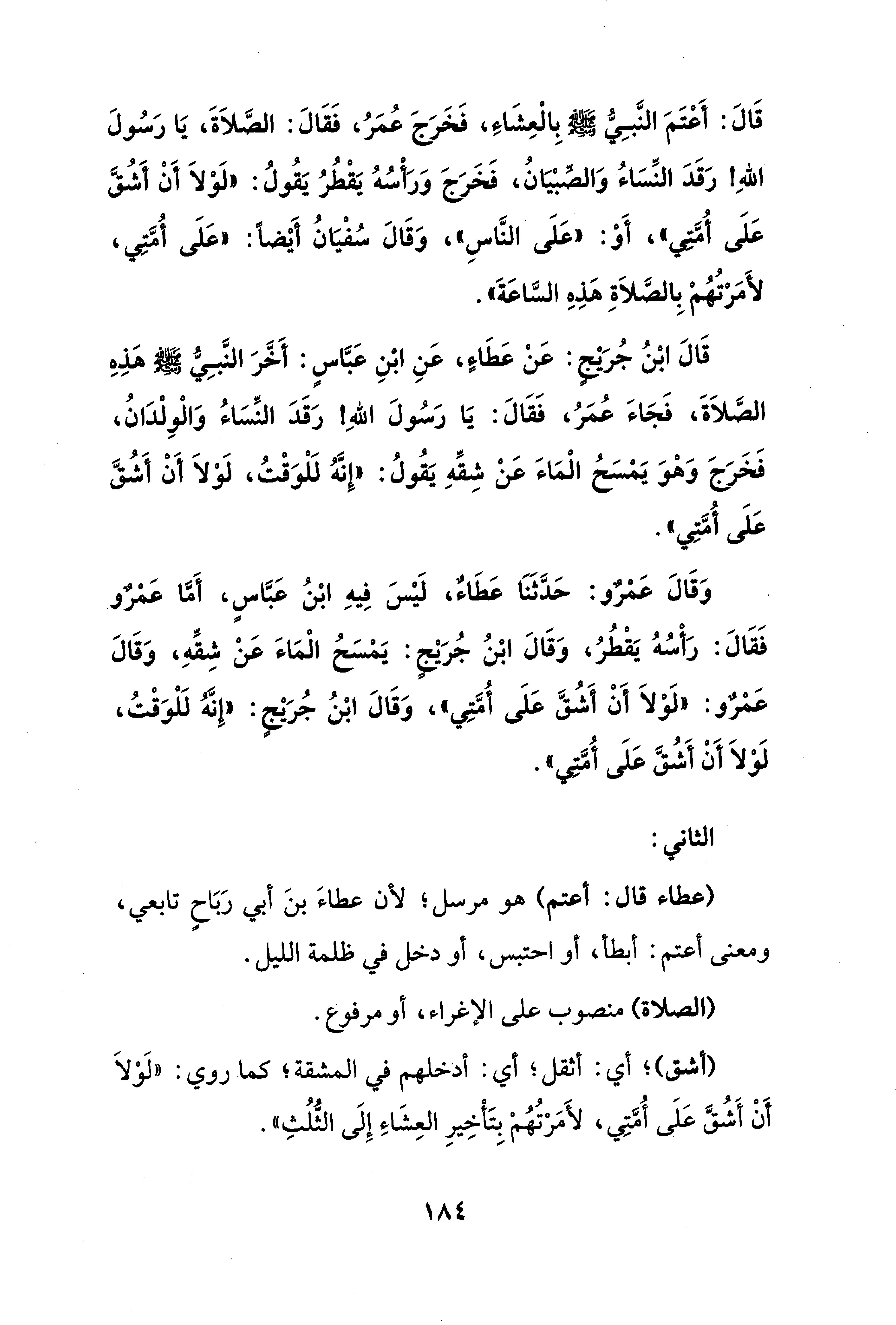 قَالَ ابْنُ جُرَيْجٍ: عَنْ عَطَاءٍ، عَنِ ابْنِ عَبَّاسٍ: أَخَّرَ النَّبِيُّ - صلى الله عليه وسلم - هَذِهِ الصَّلاَةَ، فَجَاءَ عُمَرُ، فَقَالَ: يَا رَسُولَ اللهِ! رَقَدَ النِّسَاءُ وَالْوِلْدَانُ، فَخَرَجَ وَهْوَ يَمْسَحُ الْمَاءَ عَنْ شِقِّهِ يَقُولُ: "إِنَّهُ لَلْوَقْتُ، لَوْلَا أَنْ أَشُقَّ عَلَى أُمَّتِي".