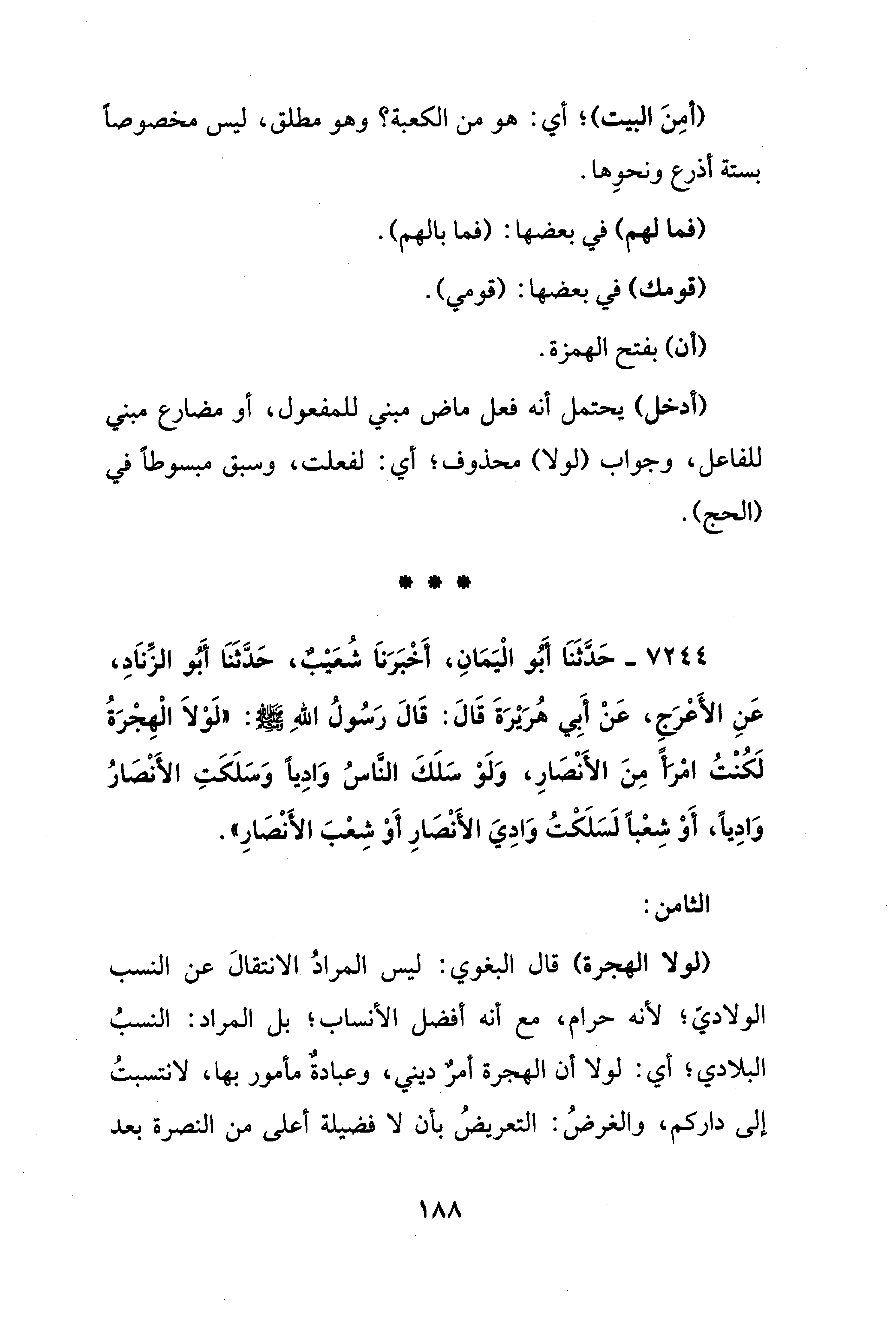 (لولا الهجرة) قال البغوي: ليس المرادُ الانتقالَ عن النسب الولاديّ؛ لأنه حرام، مع أنه أفضل الأنساب؛ بل المراد: النسبُ البلادي؛ أي: لولا أن الهجرة أمرٌ ديني، وعبادةٌ مأمور بها، لانتسبتُ إلى داركم، والغرضُ: التعريضُ بأن لا فضيلة أعلى من النصرة بعد