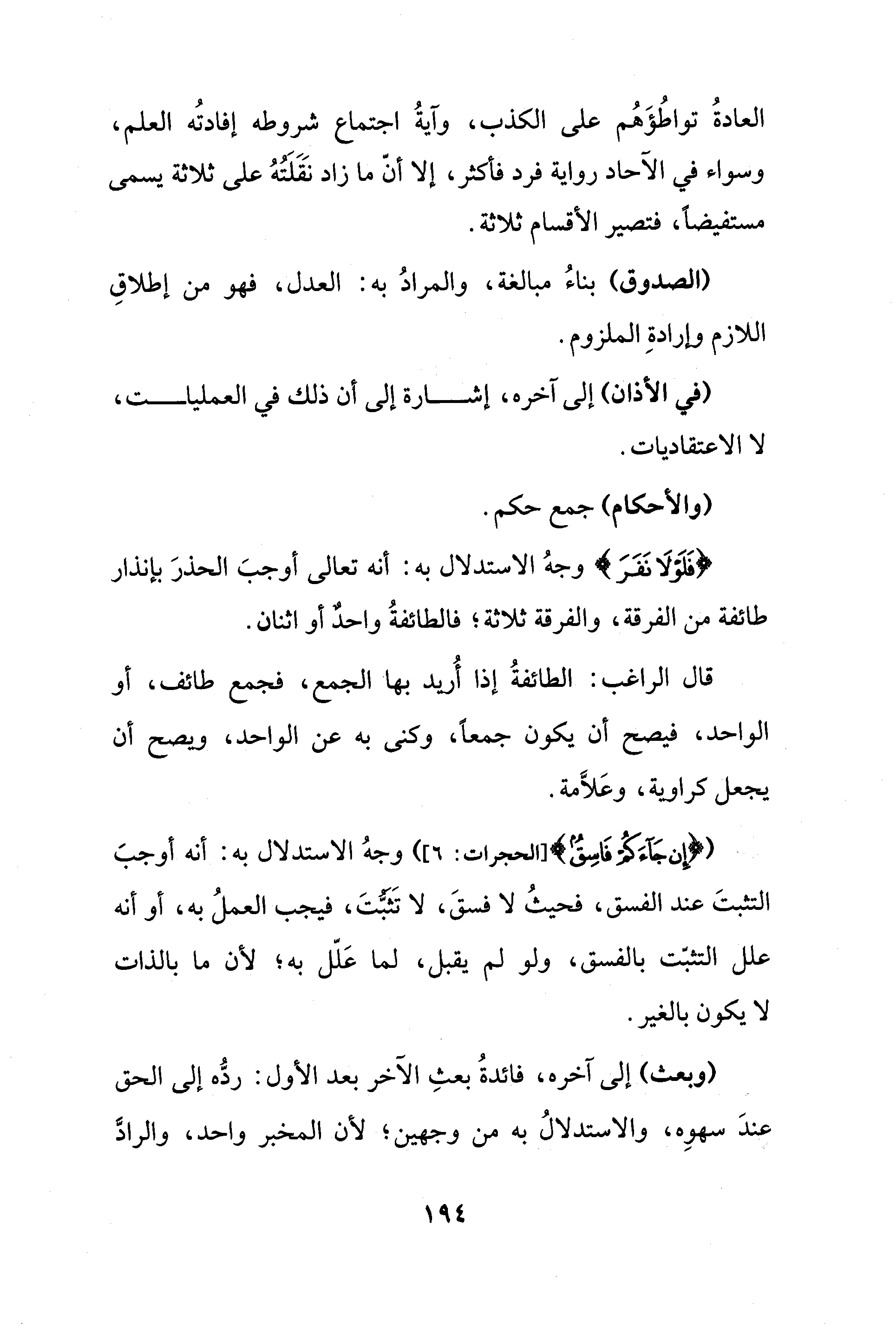 ({إِنْ جَاءَكُمْ فَاسِقٌ} [الحجرات: 6]) وجهُ الاستدلال به: أنه أوجبَ التثبتَ عند الفسق، فحيثُ لا فسقَ، لا تَثبُّتَ، فيجب العملُ به، أو أنه علل التثبّت بالفسق، ولو لم يقبل، لما عَلّل به؛ لأن ما بالذات لا يكون بالغير.