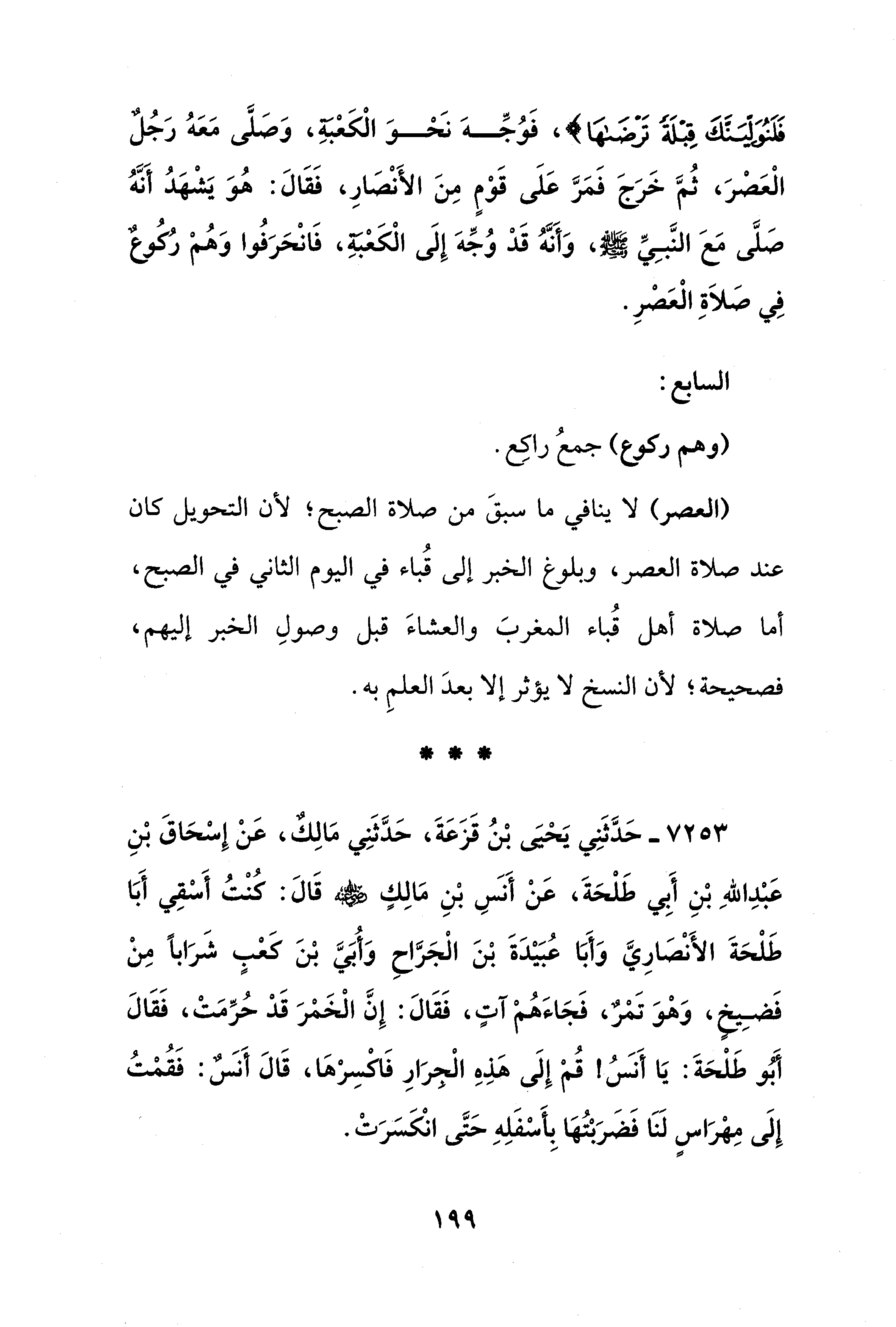 فَلَنُوَلِّيَنَّكَ قِبْلَةً تَرْضَاهَا}، فَوُجِّهَ نَحْوَ الْكَعْبَةِ، وَصَلَّى مَعَهُ رَجُلٌ الْعَصْرَ، ثُمَّ خَرَجَ فَمَرَّ عَلَى قَوْمٍ مِنَ الأَنْصَارِ، فَقَالَ: هُوَ يَشْهَدُ أَنَّهُ صَلَّى مَعَ النَّبِيِّ - صلى الله عليه وسلم -، وَأنَّهُ قَدْ وُجِّهَ إِلَى الْكَعْبَةِ، فَانْحَرَفُوا وَهُمْ رُكُوعٌ في صَلاَةِ الْعَصْرِ.