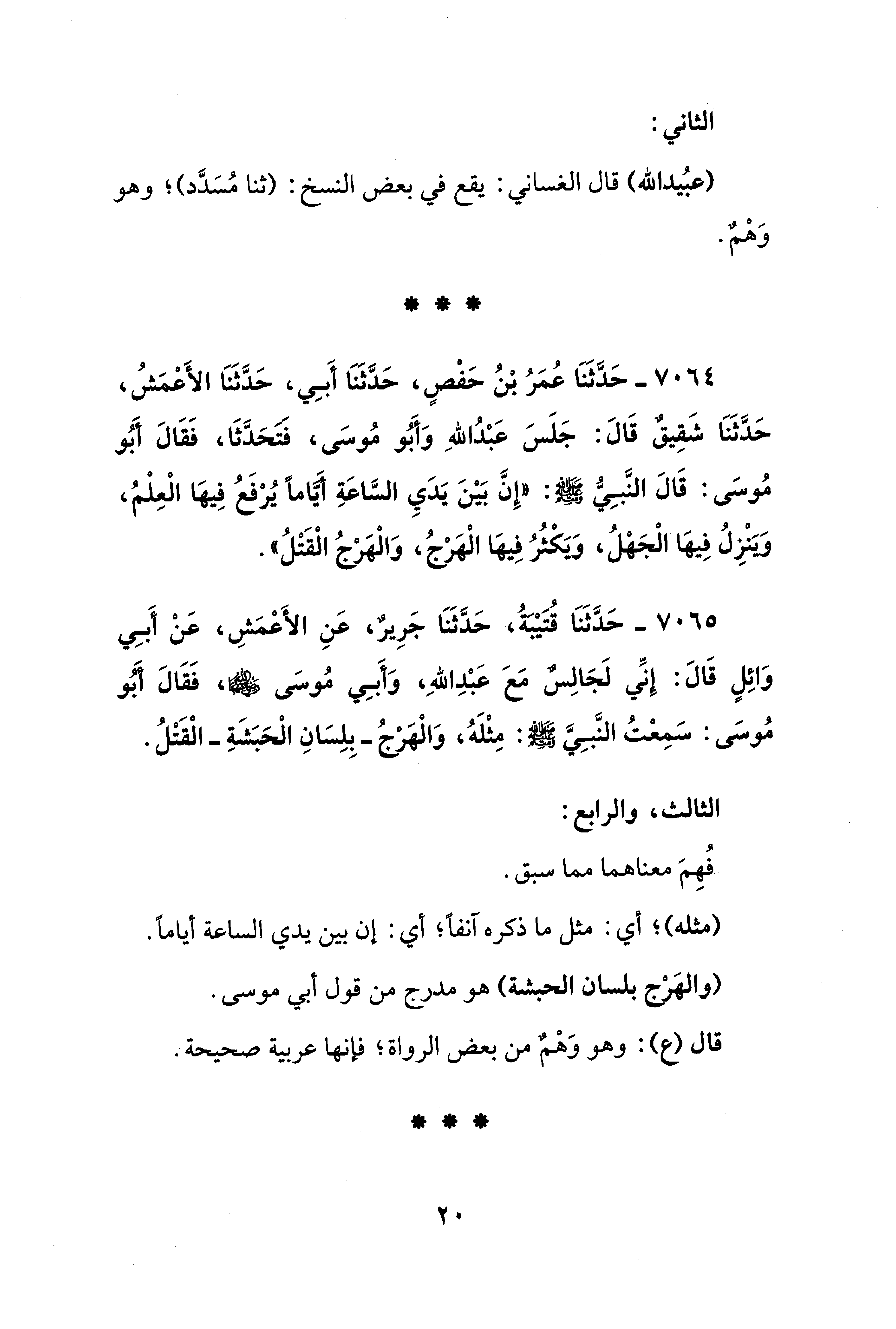 7065 - حَدَّثَنَا قتيْبةُ، حَدَّثَنَا جَرِيرٌ، عَنِ الأَعْمَشِ، عَنْ أَبِي وَائِلٍ قَالَ: إِنِّي لَجَالِسٌ مَعَ عَبْدِ اللهِ، وَأَبِي مُوسَى - رضي الله عنهما -، فَقَالَ أَبُو مُوسَى: سَمِعْتُ النَّبِيَّ - صلى الله عليه وسلم -: مِثْلَهُ، وَالْهَرْجُ -بِلِسَانِ الْحَبَشَةِ- الْقَتْلُ.