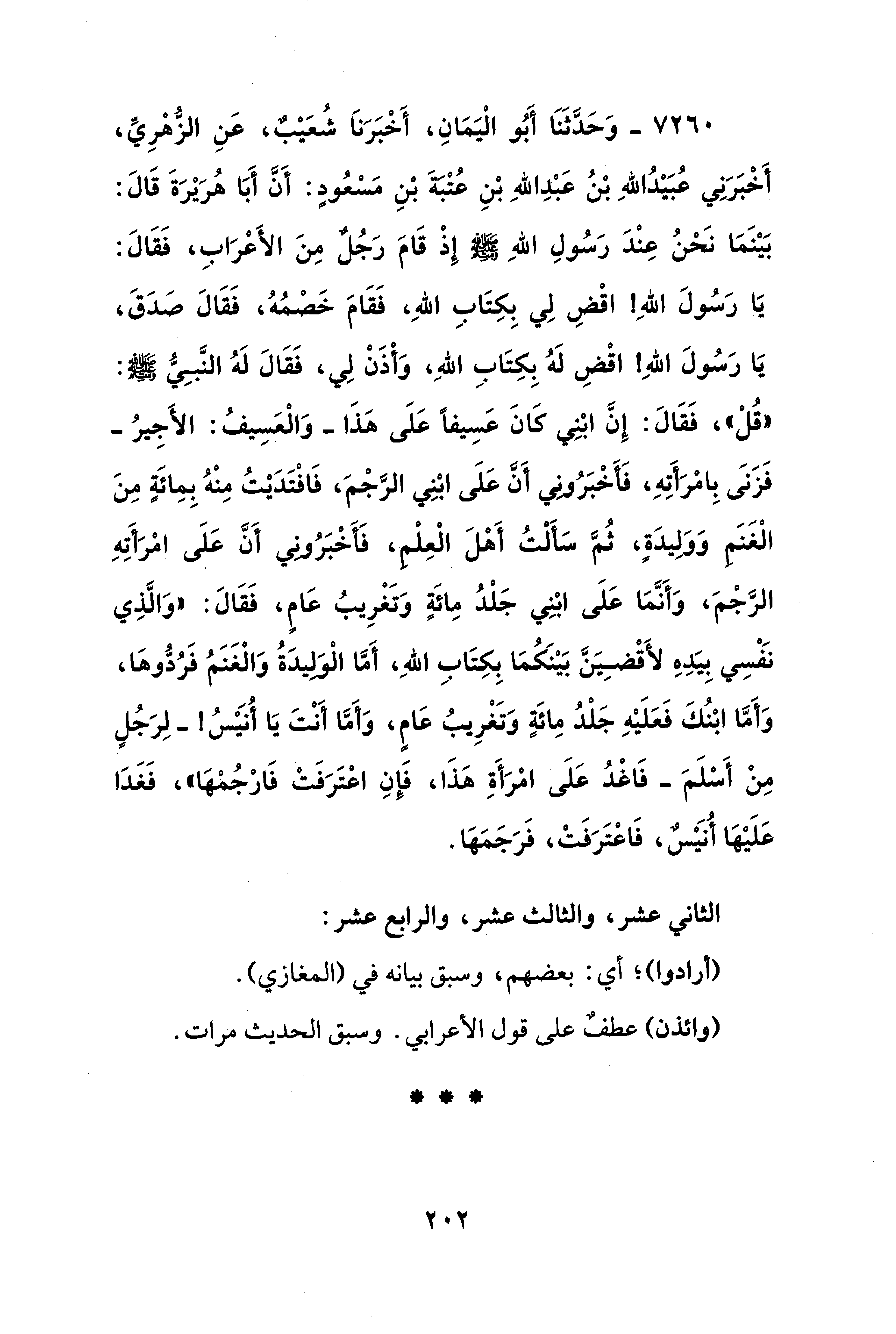 7260 - وَحَدَّثَنَا أَبُو الْيَمَانِ، أَخْبَرَنَا شُعَيْبٌ، عَنِ الزُّهْرِيِّ، أَخْبَرَنِي عُبَيْدُ اللهِ بْنُ عَبْدِ اللهِ بْنِ عُتْبةَ بْنِ مَسْعُودٍ: أَنَّ أَبَا هُرَيْرَةَ قَالَ: بَيْنَمَا نَحْنُ عِنْدَ رَسُولِ اللهِ - صلى الله عليه وسلم - إِذْ قَامَ رَجُلٌ مِنَ الأَعْرَابِ، فَقَالَ: يَا رَسُولَ اللهِ! اقْضِ لِي بِكِتَابِ اللهِ، فَقَامَ خَصْمُهُ، فَقَالَ صَدَقَ، يَا رَسُولَ اللهِ! اقْضِ لَهُ بِكِتَابِ اللهِ، وَأْذَنْ لِي، فَقَالَ لَهُ النَّبِيُّ - صلى الله عليه وسلم -: "قُلْ"، فَقَالَ: إِنَّ ابْنِي كَانَ عَسِيفًا عَلَى هَذَا -وَالْعَسِيفُ: الأَجِيرُ- فَزَنَى بِامْرَأَتِهِ، فَأَخْبَرُوني أَنَّ عَلَى ابْنِي الرَّجْمَ، فَافْتَدَيْتُ مِنْهُ بِمِائَةٍ مِنَ الْغَنَمِ وَوَلِيدَةٍ، ثُمَّ سَأَلْتُ أَهْلَ الْعِلْم، فَأَخْبَرُونِي أَنَّ عَلَى امْرَأَتِهِ الرَّجْمَ، وَأَنَّمَا عَلَى ابْنِي جَلْدُ مِائَةٍ وَتَغْرِيبُ عَامٍ، فَقَالَ: "وَالَّذِي نَفْسِي بِيَدِهِ لأَقْضِيَنَّ بَيْنَكُمَا بِكِتَابِ اللهِ، أَمَّا الْوَلِيدَةُ وَالْغَنَمُ فَرُدُّوهَا، وَأَمَّا ابْنُكَ فَعَلَيْهِ جَلْدُ مِائَةٍ وَتَغْرِيبُ عَامٍ، وَأَمَّا أَنْتَ يَا أُنيسُ! -لِرَجُلٍ مِنْ أَسْلَمَ- فَاغْدُ عَلَى امْرَأَةِ هَذَا، فَإِنِ اعْتَرَفَتْ فَارْجُمْهَا"، فَغَدَا عَلَيْهَا أُنَيْسٌ، فَاعْتَرَفَتْ، فَرَجَمَهَا.