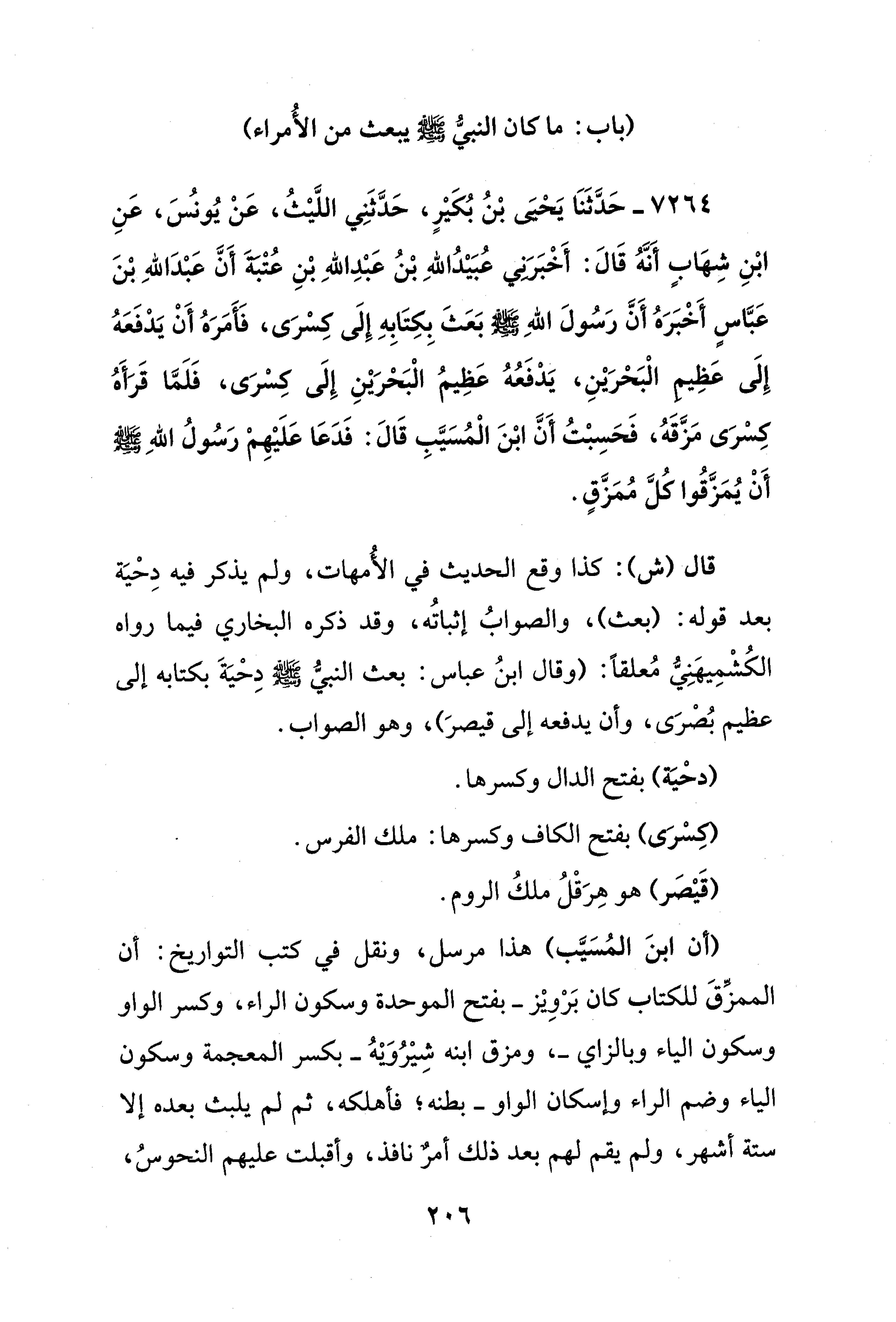 7264 - حَدَّثَنَا يَحْيَى بْنُ بُكَيْرٍ، حَدَّثَنِي اللَّيْثُ، عَنْ يُونس، عَنِ ابْنِ شِهَابٍ أَنَّهُ قَالَ: أَخْبَرَني عُبَيْدُ اللهِ بْنُ عَبْدِ اللهِ بْنِ عُتْبَةَ أَنَّ عَبْدَ اللهِ بْنَ عَبَّاسٍ أَخْبَرَهُ أَنَّ رَسُولَ اللهِ - صلى الله عليه وسلم - بَعَثَ بِكِتَابِهِ إِلَى كِسْرَى، فَأَمَرَهُ أَنْ يَدْفَعَهُ إِلَى عَظِيم الْبَحْرَيْنِ، يَدْفَعُهُ عَظِيمُ الْبَحْرَيْنِ إِلَى كِسْرَى، فَلَمَّا قَرَأَهُ كِسْرَى مَزَّقَهُ، فَحَسِبْتُ أَنَّ ابْنَ الْمُسَيَّبِ قَالَ: فَدَعَا عَلَيْهِمْ رَسُولُ اللهِ - صلى الله عليه وسلم - أَنْ يُمَزَّقُوا كُلَّ مُمَزَّقٍ.