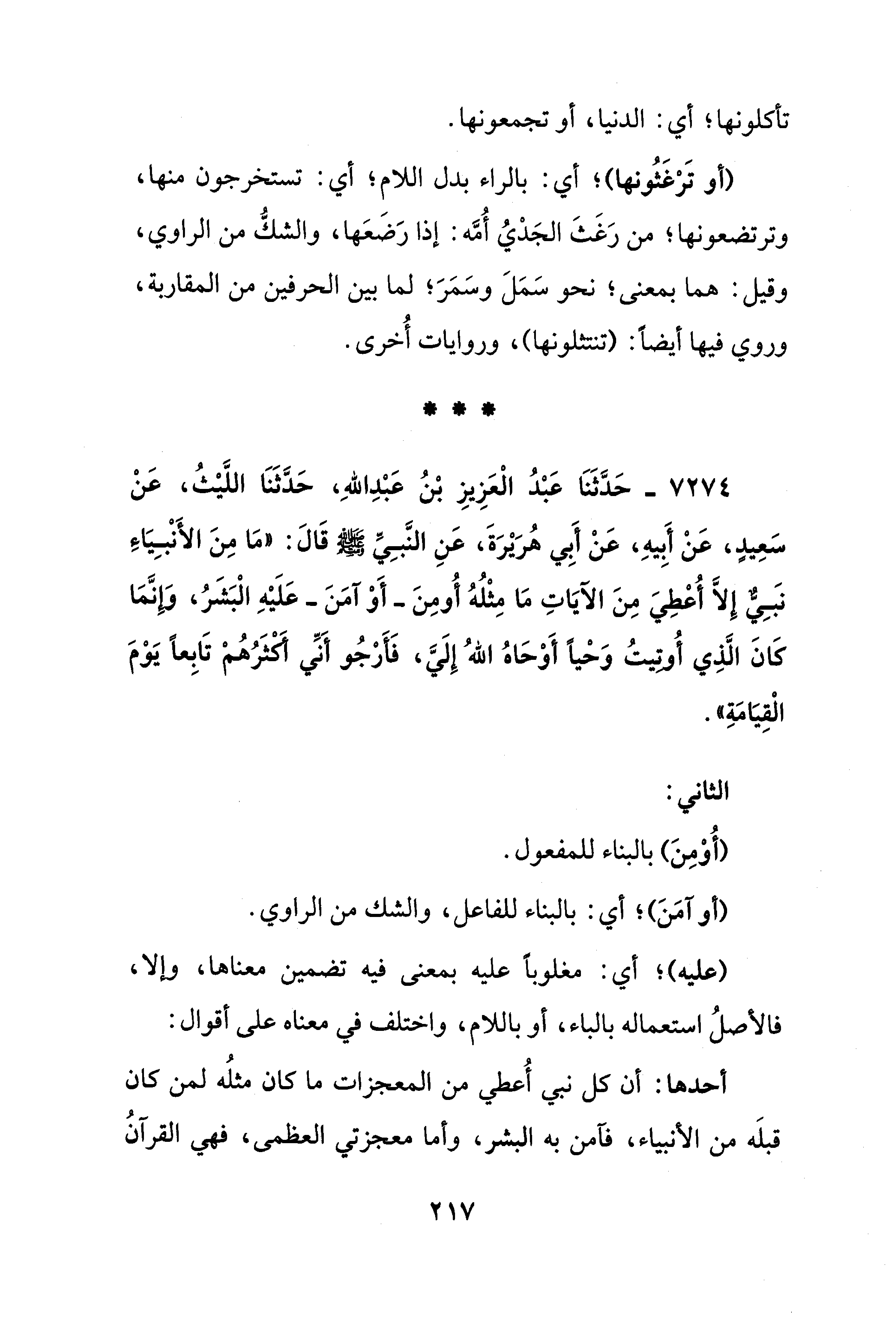 7274 - حَدَّثَنَا عَبْدُ الْعَزِيزِ بْنُ عَبْدِ اللهِ، حَدَّثَنَا اللَّيْثُ، عَنْ سَعِيدٍ، عَنْ أَبِيهِ، عَنْ أَبِي هُرَيرَةَ، عَنِ النَّبِيِّ - صلى الله عليه وسلم - قَالَ: "مَا مِنَ الأَنْبِيَاءِ نَبِيٌّ إِلَّا أُعْطِيَ مِنَ الآيَاتِ مَا مِثْلُهُ أُومِنَ -أَوْ آمَنَ- عَلَيْهِ الْبَشَرُ، وَإِنَّمَا كَانَ الَّذِي أُوتِيتُ وَحْيًا أَوْحَاهُ اللهُ إِلَيَّ، فَأَرْجُو أَنِّي أَكْثَرُهُمْ تَابِعًا يَوْمَ الْقِيَامَةِ".