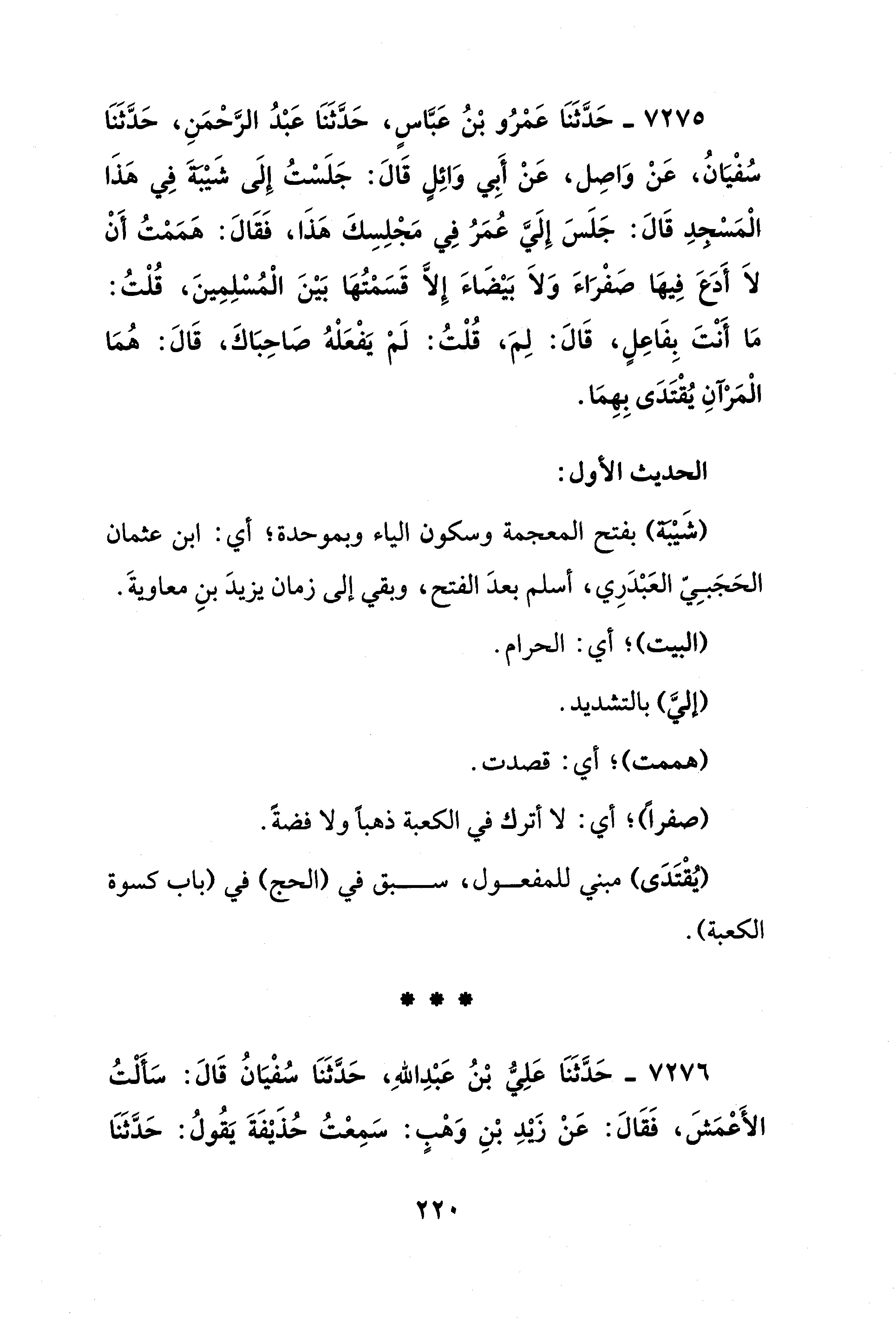 7275 - حَدَّثَنَا عَمْرُو بْنُ عَبَّاسٍ، حَدَّثَنَا عَبْدُ الرَّحْمَنِ، حَدَّثَنَا سُفْيَانُ، عَنْ وَاصِلٍ، عَنْ أَبِي وَائِلٍ قَالَ: جَلَسْتُ إِلَى شَيْبَةَ فِي هَذَا الْمَسْجِدِ قَالَ: جَلَسَ إِلَيَّ عُمَرُ فِي مَجْلِسِكَ هَذَا، فَقَالَ: هَمَمْتُ أَنْ لَا أَدَعَ فِيهَا صَفْرَاءَ وَلَا بَيْضَاءَ إِلَّا قَسَمْتُهَا بَيْنَ الْمُسْلِمِينَ، قُلْتُ: مَا أَنْتَ بِفَاعِلٍ، قَالَ: لِمَ، قُلْتُ: لَمْ يَفْعَلْهُ صَاحِبَاكَ، قَالَ: هُمَا الْمَرْآنِ يُقْتَدَى بِهِمَا.