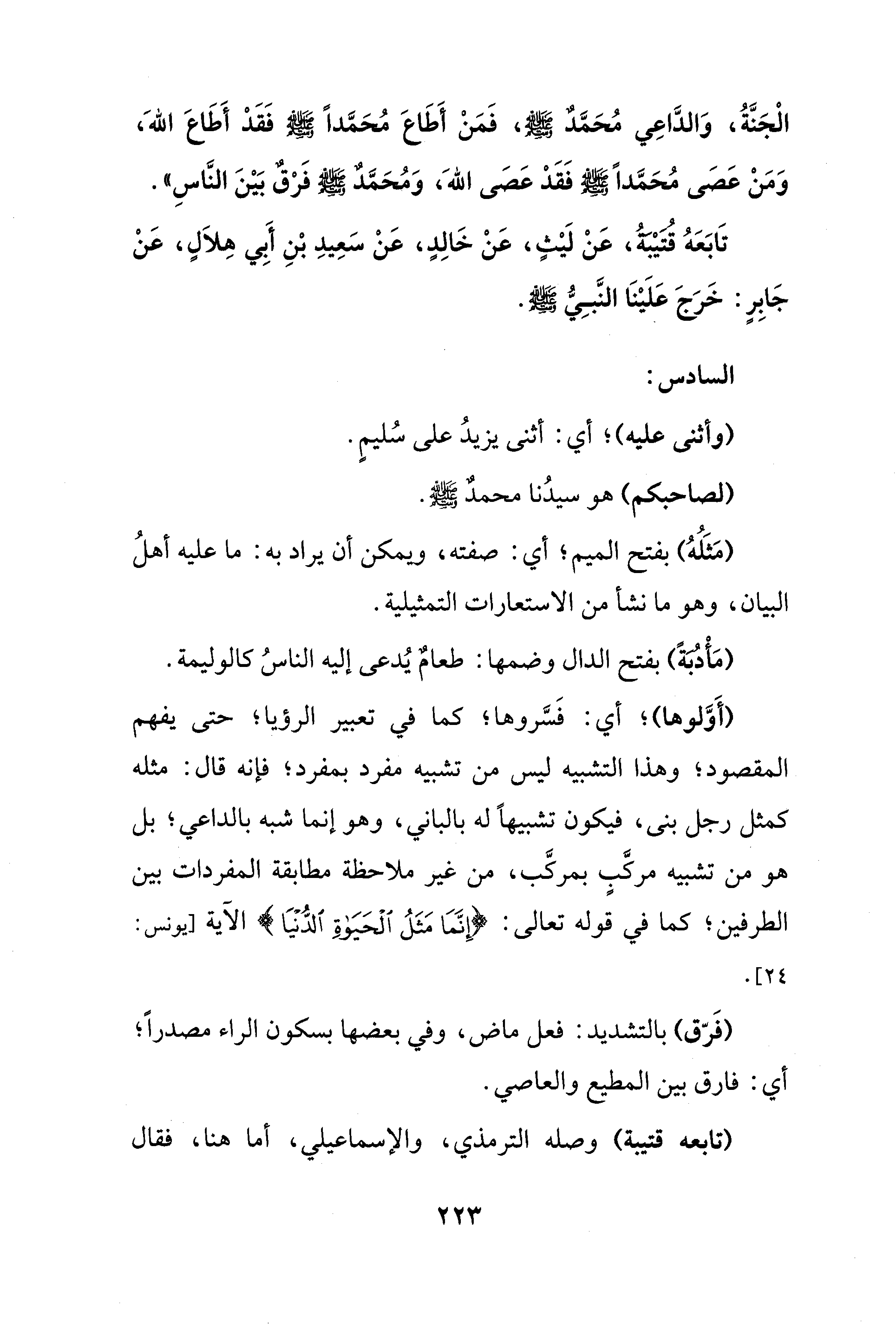 الْجَنَّةُ، وَالدَّاعِي مُحَمَّدٌ - صلى الله عليه وسلم -، فَمَنْ أَطَاعَ مُحَمَّدًا - صلى الله عليه وسلم - فَقَدْ أَطَاعَ اللهَ، وَمَنْ عَصَى مُحَمَّدًا - صلى الله عليه وسلم - فَقَدْ عَصَى اللهَ، وَمُحَمَّدٌ - صلى الله عليه وسلم - فَرْقٌ بَيْنَ النَّاسِ".