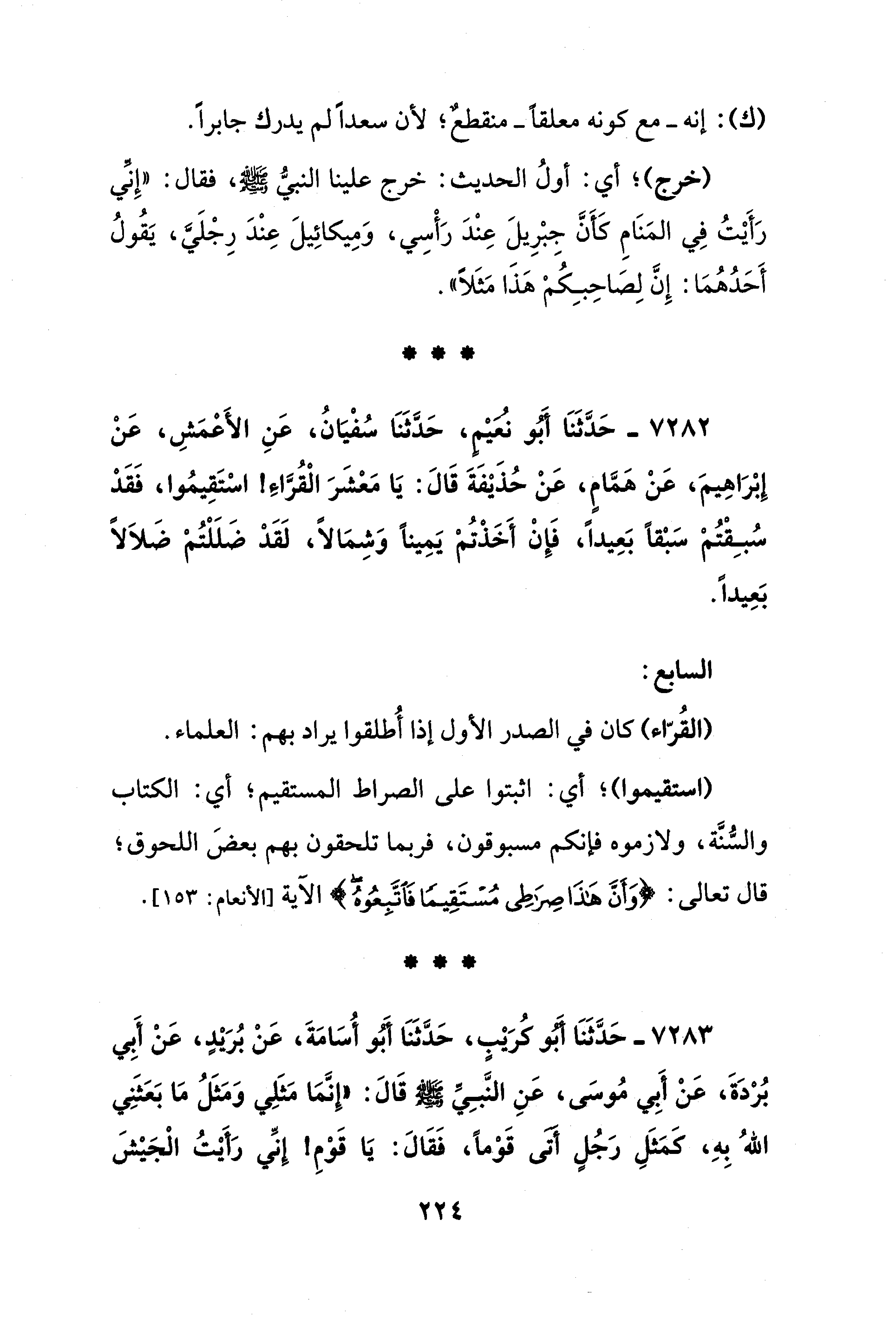 7282 - حَدَّثَنَا أَبُو نُعَيْمٍ، حَدَّثَنَا سُفْيَانُ، عَنِ الأَعْمَشِ، عَنْ إِبْرَاهِيمَ، عَنْ هَمَّامٍ، عَنْ حُذَيْفةَ قَالَ: يَا مَعْشَرَ الْقُرَّاءِ! اسْتَقِيمُوا، فَقَدْ سُبِقْتُمْ سَبْقًا بَعِيدًا، فَإِنْ أَخَذْتُمْ يَمِينًا وَشِمَالًا، لَقَدْ ضَلَلْتُمْ ضَلاَلًا بَعِيدًا.