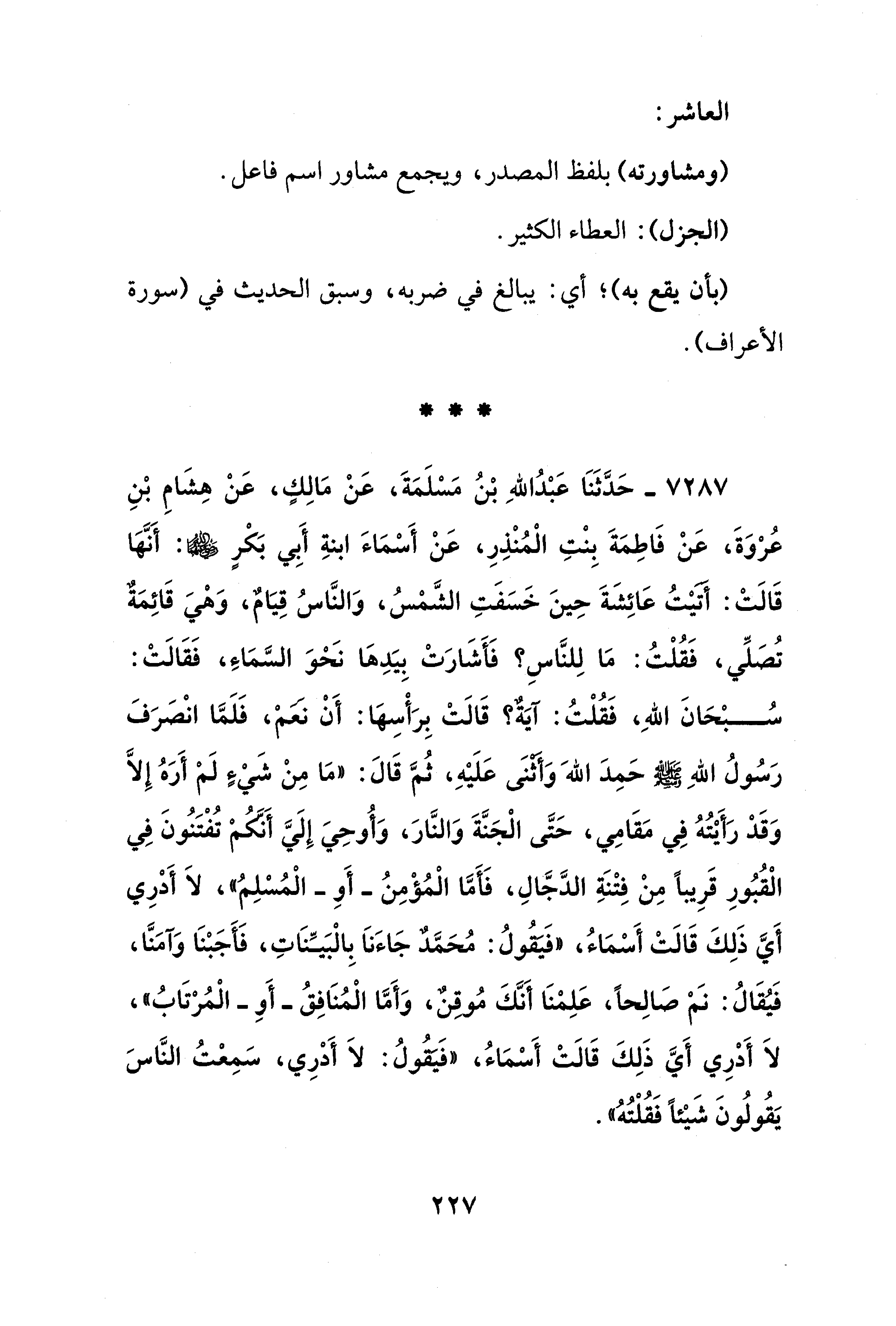 7287 - حَدَّثَنَا عَبْدُ اللهِ بْنُ مَسْلَمَةَ، عَنْ مَالِكٍ، عَنْ هِشَامِ بْنِ عُرْوَةَ، عَنْ فَاطِمَةَ بِنْتِ الْمُنْذِرِ، عَنْ أَسْمَاءَ ابنةِ أَبِي بَكْرٍ - رضي الله عنهما -: أَنَّهَا قَالَتْ: أَتَيْتُ عَائِشَةَ حِينَ خَسَفَتِ الشَّمْسُ، وَالنَّاسُ قِيَامٌ، وَهْيَ قَائِمَةٌ تُصَلِّي، فَقُلْتُ: مَا لِلنَّاسِ؟ فَأَشَارَتْ بِيَدِهَا نَحْوَ السَّمَاءَ، فَقَالَتْ: سُبْحَانَ اللهِ، فَقُلْتُ: آيَةٌ؟ قَالَتْ بِرَأْسِهَا: أَنْ نَعَمْ، فَلَمَّا انْصَرَفَ رَسُولُ اللهِ - صلى الله عليه وسلم - حَمِدَ اللهَ وَأَثْنَى عَلَيهِ، ثُمَّ قَالَ: "مَا مِنْ شَيءٍ لَمْ أَرَهُ إِلَّا وَقَدْ رَأَيْتُهُ فِي مَقَامِي، حَتَّى الْجَنَّةَ وَالنَّارَ، وَأُوحِيَ إِلَيَّ أَنَّكمْ تُفْتَنُونَ فِي الْقُبُورِ قَرِيبًا مِنْ فِتْنَةِ الدَّجَّالِ، فَأَمَّا الْمُؤْمِنُ -أَوِ- الْمُسْلِمُ"، لَا أَدْرِي أَيَّ ذَلِكَ قَالَتْ أَسْمَاءُ، "فَيَقُولُ: مُحَمَّدٌ جَاءَنَا بِالْبَيِّنَاتِ، فأَجَبْنَا وَآمَنَّا، فَيُقَالُ: نَمْ صَالِحًا، عَلِمْنَا أَنَّكَ مُوقِنٌ، وَأَمَّا الْمُنَافِقُ -أَوِ- الْمُرْتَابُ"، لَا أَدْرِي أَيَّ ذَلِكَ قَالَتْ أَسْمَاءُ، "فَيَقُولُ: لَا أَدْرِي، سَمِعْتُ النَّاسَ يَقُولُونَ شَيْئًا فَقُلْتُهُ".