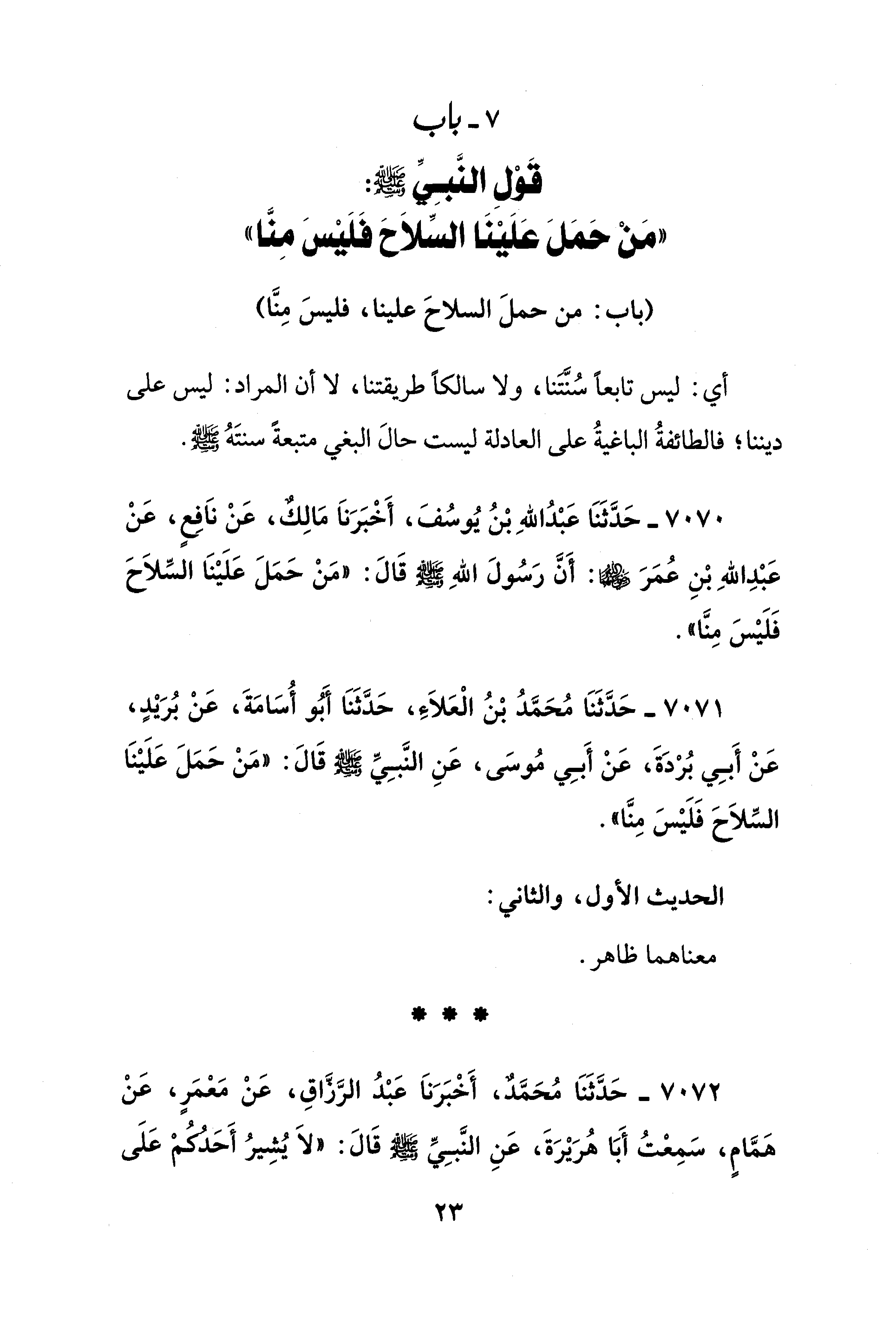 7 - باب قَوْلِ النَّبِيِّ - صلى الله عليه وسلم -: "مَنْ حَمل عَلَيْنَا السِّلاَحَ فَلَيْسَ مِنَّا"