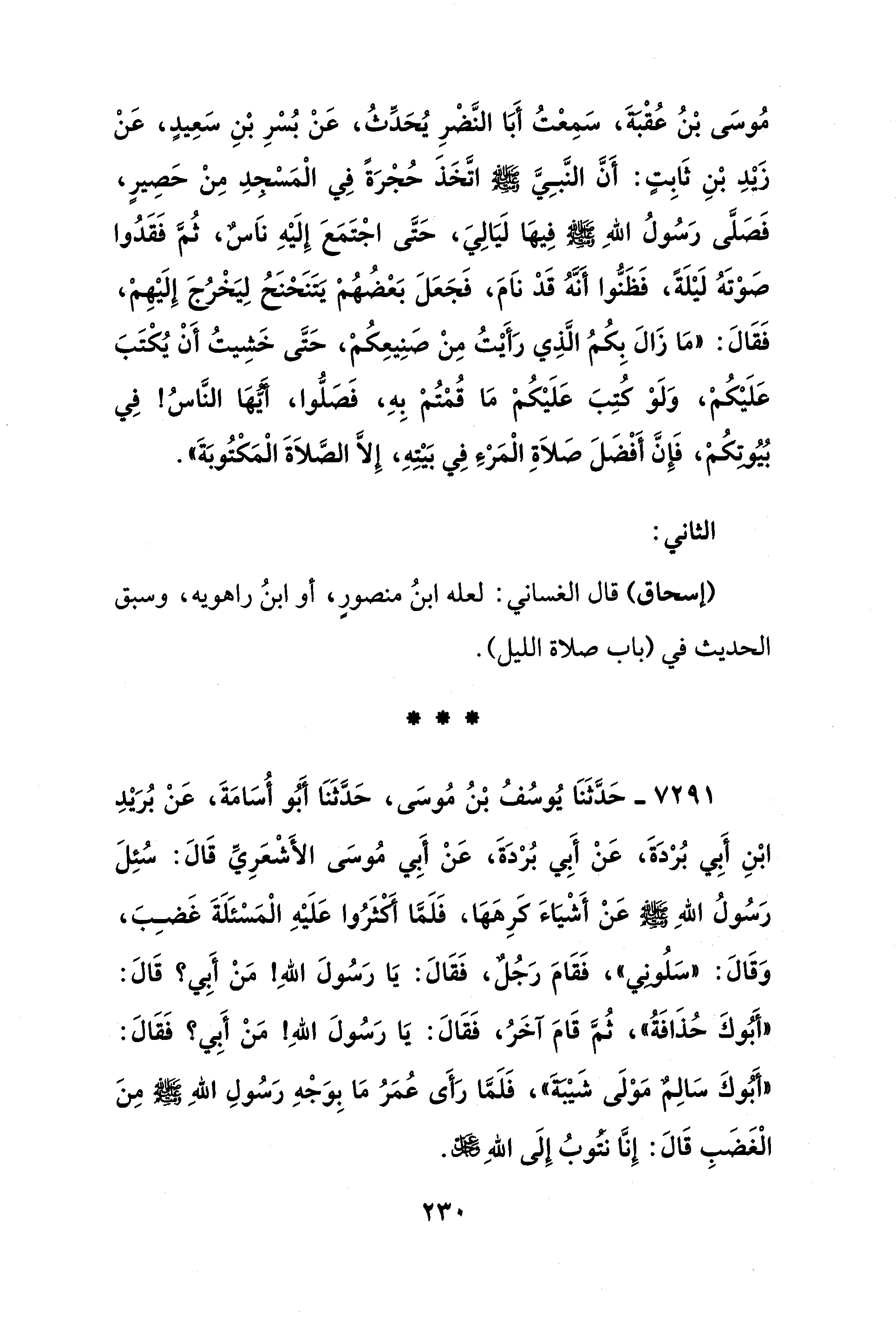 مُوسَى بْنُ عُقْبَةَ، سَمِعْتُ أَبَا النَّضْرِ يُحَدِّثُ، عَنْ بُسْرِ بْنِ سَعِيدٍ، عَنْ زَيْدِ بْنِ ثَابِتٍ: أَنَّ النَّبِيَّ - صلى الله عليه وسلم - اتَّخَذَ حُجْرَةً فِي الْمَسْجدِ مِنْ حَصِيرٍ، فَصَلَّى رَسُولُ اللهِ - صلى الله عليه وسلم - فِيهَا لَيَالِيَ، حَتَّى اجْتَمَعَ إِلَيْهِ نَاسٌ، ثُمَّ فَقَدُوا صَوْتَهُ لَيْلَةً، فَظَنُّوا أَنَّهُ قَدْ نَامَ، فَجَعَلَ بَعْضُهُمْ يَتَنَحْنَحُ لِيَخْرُجَ إِلَيْهِمْ، فَقَالَ: "مَا زَالَ بِكُمُ الَّذِي رَأَيْتُ مِنْ صَنِيعِكُمْ، حَتَّى خَشِيتُ أَنْ يُكْتَبَ عَلَيْكُمْ، وَلَوْ كُتِبَ عَلَيْكُمْ مَا قُمْتُمْ بِهِ، فَصَلّوا، أَيُّهَا النَّاسُ! فِي بُيُوتِكُمْ، فَإِنَّ أَفْضَلَ صَلاَةِ الْمَرْءِ فِي بَيْتِهِ، إِلَّا الصَّلاَةَ الْمَكْتُوبَةَ".