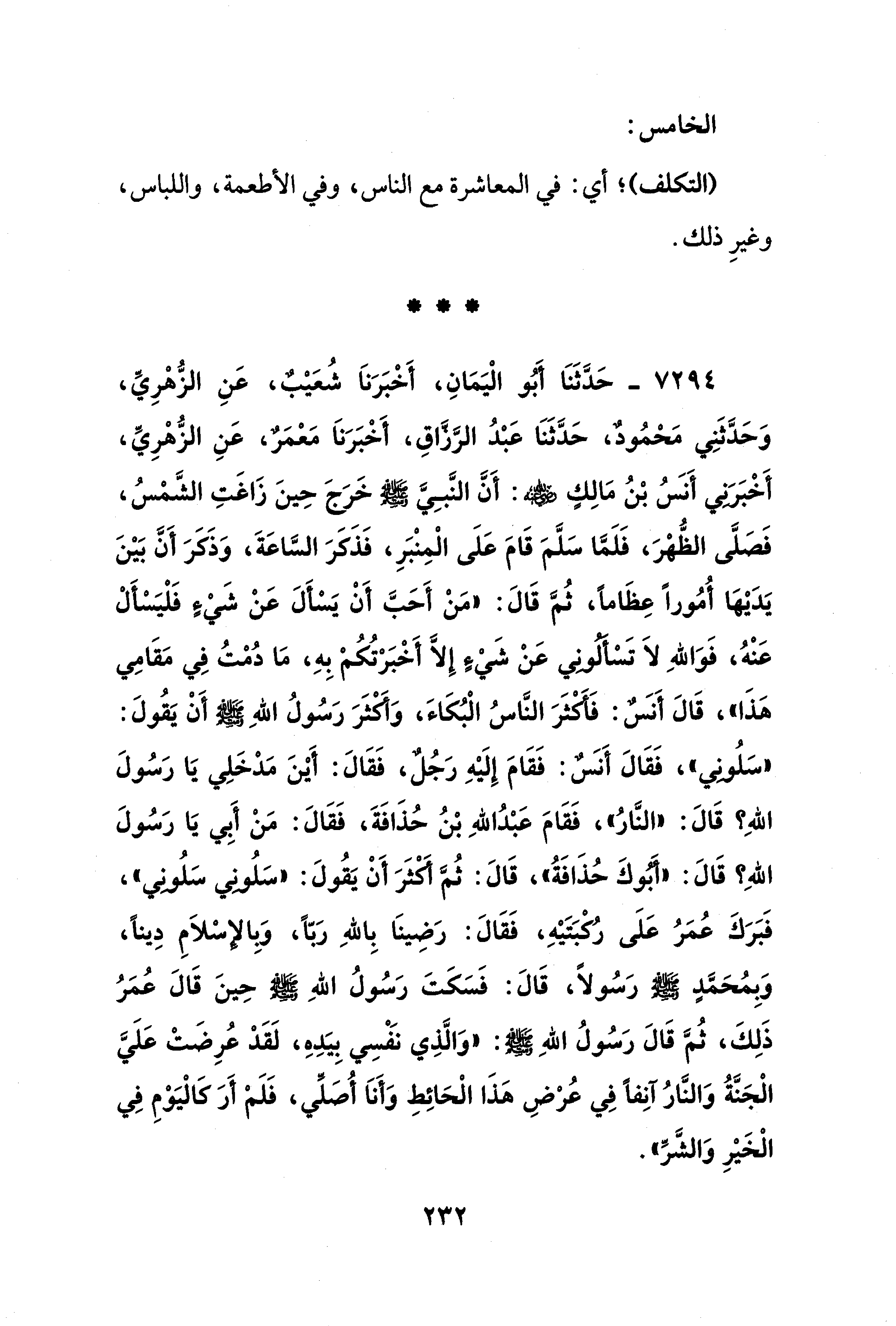 7294 - حَدَّثَنَا أَبُو الْيَمَانِ، أَخْبَرَنَا شُعَيْبٌ، عَنِ الزُّهْرِيِّ، وَحَدَّثَنِي مَحْمُودٌ، حَدَّثَنَا عَبْدُ الرَّزَّاقِ، أَخْبَرَنَا مَعْمَرٌ، عَنِ الزُّهْرِيِّ، أَخْبَرَنِي أَنَسُ بْنُ مَالِكٍ - رضي الله عنه -: أَنَّ النَّبِيَّ - صلى الله عليه وسلم - خَرَجَ حِينَ زَاغَتِ الشَّمْسُ، فَصَلَّى الظُّهْرَ، فَلَمَّا سَلَّمَ قَامَ عَلَى الْمِنْبَرِ، فَذَكَرَ السَّاعَةَ، وَذَكَرَ أَن بَيْنَ يَدَيْهَا أُمُورًا عِظَامًا، ثُمَّ قَالَ: "مَنْ أَحَبَّ أَنْ يَسْأَلَ عَنْ شَيْءٍ فَلْيَسْأَلْ عَنْهُ، فَوَاللهِ لَا تَسْأَلُونِي عَنْ شَيْءٍ إِلَّا أَخْبَرْتُكُمْ بِهِ، مَا دُمْتُ فِي مَقَامِي هَذَا" قَالَ أَنَسٌ: فَأَكْثَرَ النَّاسُ الْبُكَاءَ، وَأَكْثَرَ رَسُولُ اللهِ - صلى الله عليه وسلم - أَنْ يَقُولَ: "سَلُونِي"، فَقَالَ أَنَسٌ: فَقَامَ إِلَيْهِ رَجُلٌ، فَقَالَ: أَيْنَ مَدْخَلِي يَا رَسُولَ اللهِ؟ قَالَ: "النَّارُ"، فَقَامَ عَبْدُ اللهِ بْنُ حُذَافَةَ، فَقَالَ: مَنْ أَبِي يَا رَسُولَ اللهِ؟ قَالَ: "أَبُوكَ حُذَافَةُ"، قَالَ: ثُمَّ أَكْثَرَ أَنْ يَقُولَ: "سَلُونِي سَلُونِي"، فَبَرَكَ عُمَرُ عَلَى رُكْبَتَيْهِ، فَقَالَ: رَضِينَا بِاللهِ رَبًّا، وَبِالإِسْلاَمِ دِينًا، وَبِمُحَمَّدٍ - صلى الله عليه وسلم - رَسُولًا، قَالَ: فَسَكَتَ رَسُولُ اللهِ - صلى الله عليه وسلم - حِينَ قَالَ عُمَرُ ذَلِكَ، ثُمَّ قَالَ رَسُولُ اللهِ - صلى الله عليه وسلم -: "وَالَّذِي نَفْسِي بِيَدِهِ، لَقَدْ عُرِضَتْ عَلَيَّ الْجَنَّةُ وَالنَّارُ آنِفًا فِي عُرْضِ هَذَا الْحَائِطِ وَأَنَا أُصَلِّي، فَلَمْ أَرَ كَالْيَوْمِ فِي الْخَيْرِ وَالشَّرِّ".