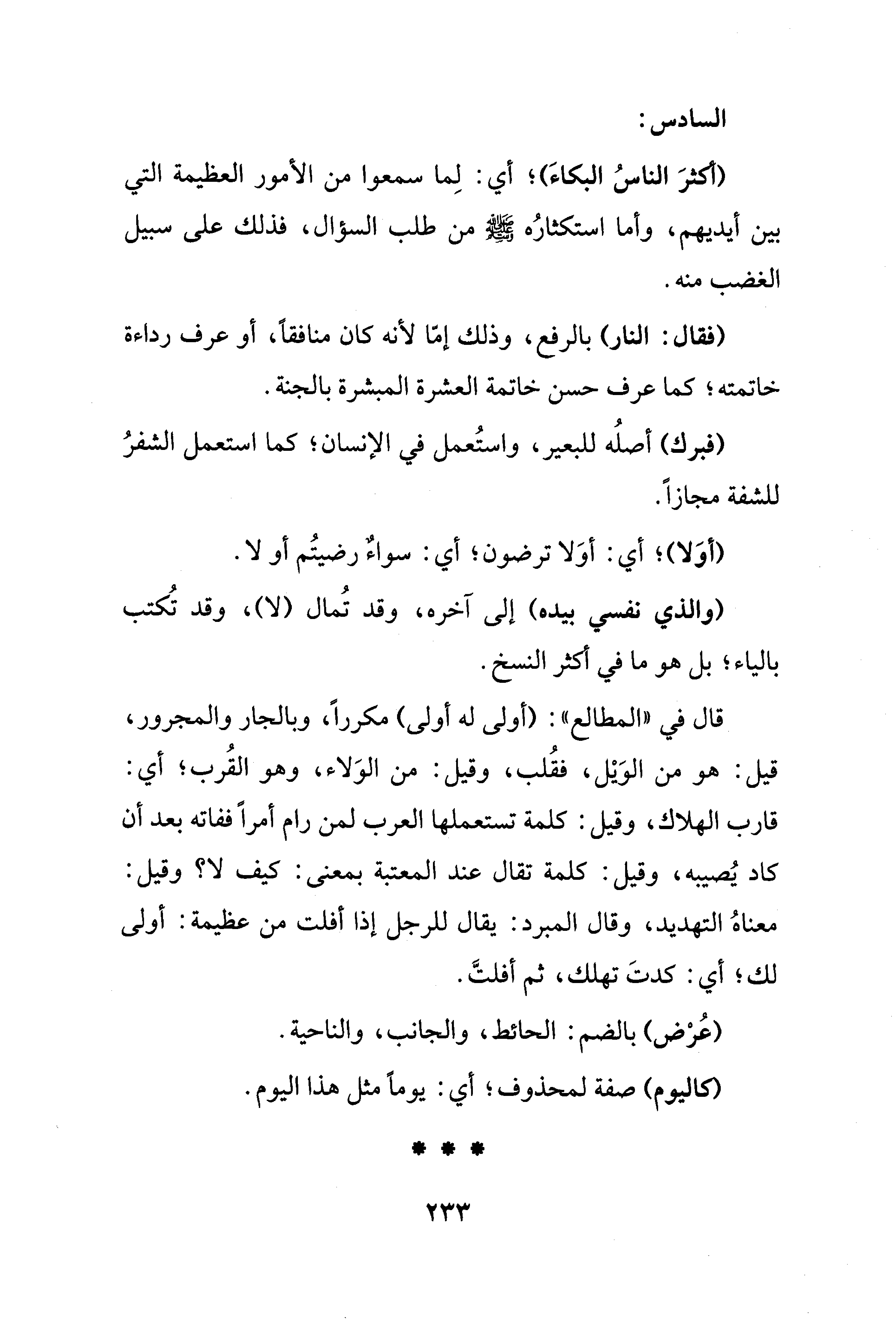 قال في "المطالع": (أولى له أولى) مكررًا، وبالجار والمجرور، قيل: هو من الوَيْل، فقُلب، وقيل: من الوَلاء، وهو القُرب؛ أي: قارب الهلاك، وقيل: كلمة تستعملها العرب لمن رام أمرًا ففاته بعد أن كاد يُصيبه، وقيل: كلمة تقال عند المعتبة بمعنى: كيف لا؟ وقيل: معناهُ التهديد، وقال المبرد: يقال للرجل إذا أفلت من عظيمة: أولى لك؛ أي: كدتَ تهلك، ثم أفلتَّ.