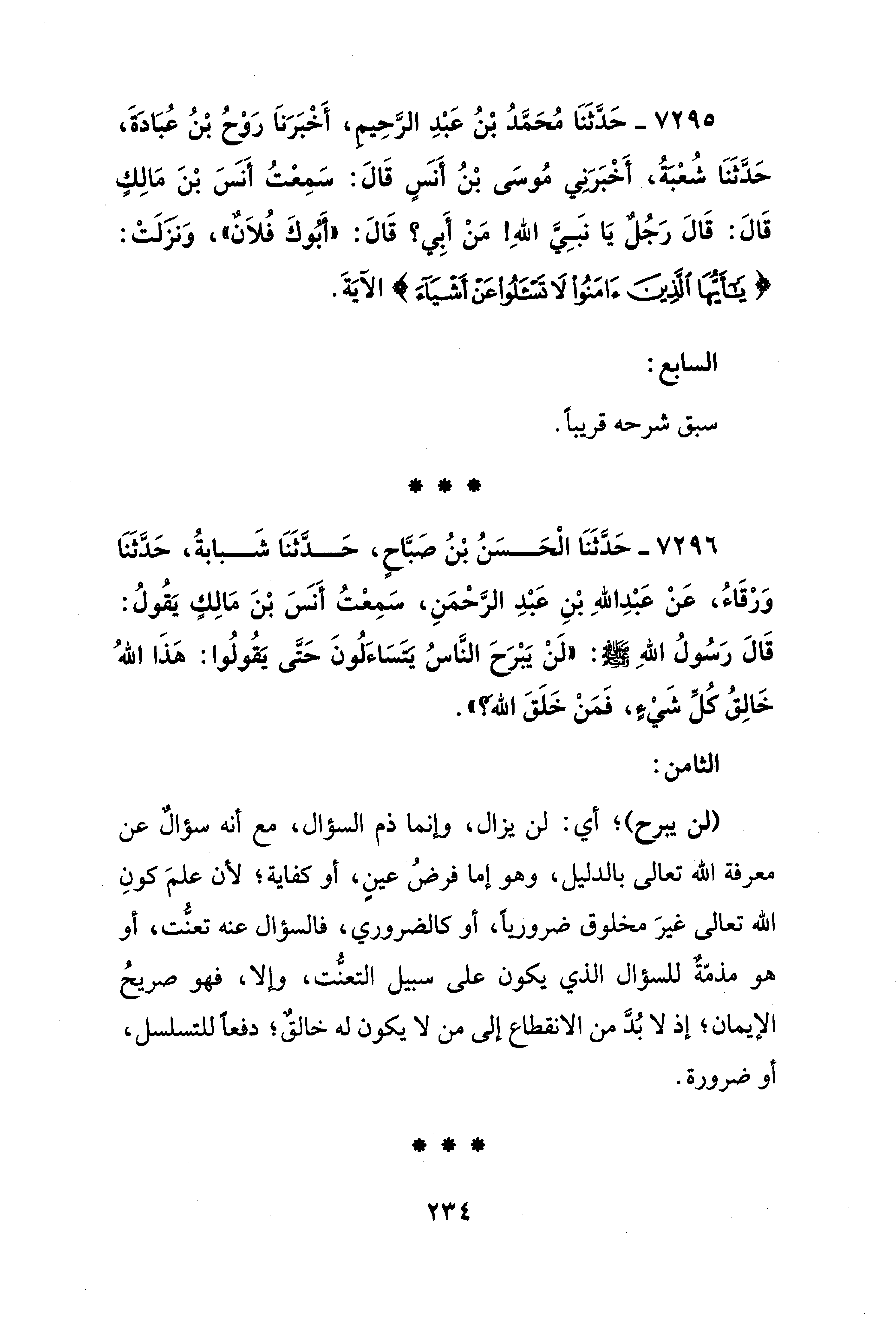 7296 - حَدَّثَنَا الْحَسَنُ بْنُ صَبَّاحٍ، حَدَّثَنَا شَبابةُ، حَدَّثَنَا وَرْقَاءُ عَنْ عَبْدِ اللهِ بْنِ عَبْدِ الرَّحْمَنِ، سَمِعْتُ أَنَسَ بْنَ مَالِكٍ يَقُولُ: قَالَ رَسُولُ اللهِ - صلى الله عليه وسلم -: "لَنْ يَبْرَحَ النَّاسُ يَتَسَاءَلُونَ حَتَّى يَقُولُوا: هَذَا اللهُ خَالِقُ كُلِّ شَيْءٍ، فَمَنْ خَلَقَ اللهَ".