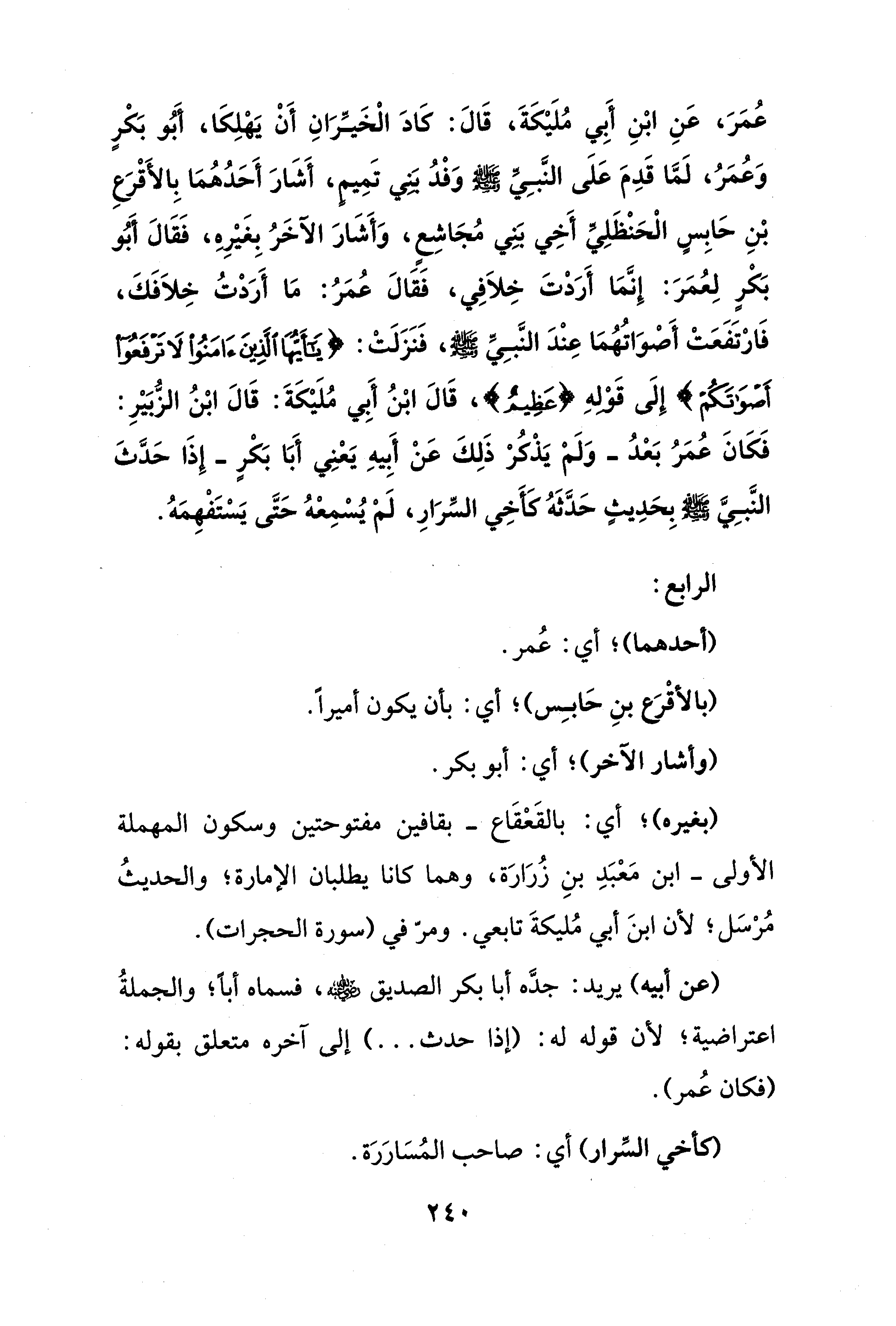 عُمَرَ، عَنِ ابْنِ أَبِي مُلَيْكَةَ، قَالَ: كَادَ الْخَيِّرَانِ أَنْ يَهْلِكَا، أَبُو بَكْرٍ وَعُمَرُ، لَمَّا قَدِمَ عَلَى النَّبِيِّ - صلى الله عليه وسلم - وَفْدُ بَنِي تَمِيم، أَشَارَ أَحَدُهُمَا بِالأَقْرَعِ بْنِ حَابِسٍ الْحَنْظَلِيِّ أَخِي بَنِي مُجَاشِعٍ، وَأَشَارَ الآخَرُ بِغَيْرِهِ، فَقَالَ أَبُو بَكْرٍ لِعُمَرَ: إِنَّمَا أَرَدْتَ خِلاَفِي، فَقَالَ عُمَرُ: مَا أَرَدْتُ خِلاَفَكَ، فَارْتَفَعَتْ أَصْوَاتُهُمَا عِنْدَ النَّبِيِّ - صلى الله عليه وسلم -، فَنَزَلَتْ: {يَا أَيُّهَا الَّذِينَ آمَنُوا لَا تَرْفَعُوا أَصْوَاتَكُمْ} إلى قَوْلِهِ {عَظِيمٌ}، قَالَ ابْنُ أَبِي مُلَيْكَةَ: قَالَ ابْنُ الزُّبَيْرِ: فَكَانَ عُمَرُ بَعْدُ -وَلَمْ يَذْكُرْ ذَلِكَ عَنْ أَبيهِ يَعْنِي أَبَا بَكْرٍ - إِذَا حَدَّثَ النَّبِيَّ - صلى الله عليه وسلم - بِحَدِيثٍ حَدَّثَهُ كَأَخِي السِّرَارِ، لَمْ يُسْمِعْهُ حَتَّى يَسْتَفْهِمَهُ.