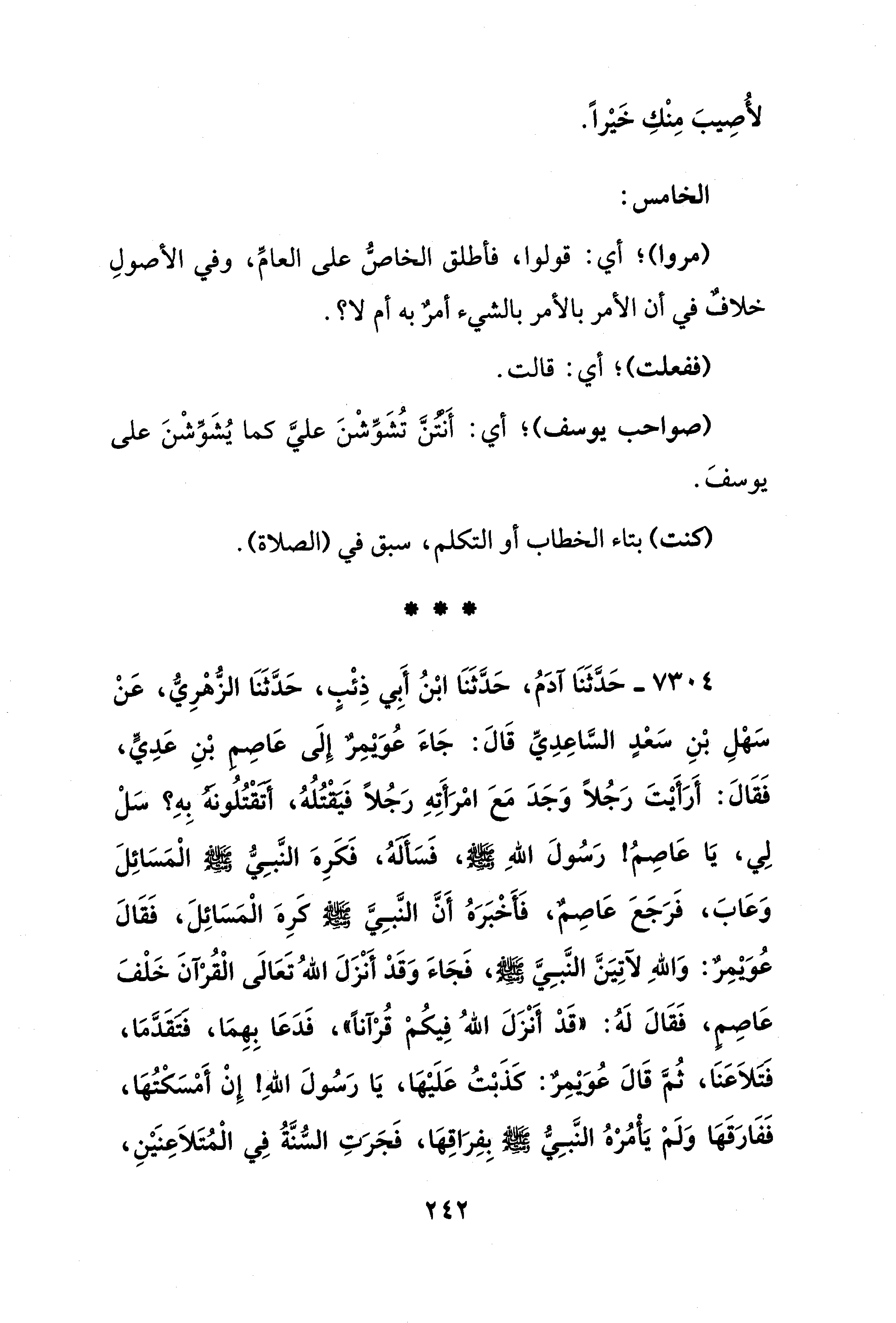 7304 - حَدَّثَنَا آدَمُ، حَدَّثَنَا ابْنُ أَبِي ذِئْب، حَدَّثَنَا الزُّهْرِيُّ، عَنْ سَهْلِ بْنِ سَعْدٍ السَّاعِدِيِّ قَالَ: جَاءَ عُوَيْمِرٌ إِلَى عَاصِم بْنِ عَدِيٍّ، فَقَالَ: أَرَأَيتَ رَجُلًا وَجَدَ مَعَ امْرَأَتِهِ رَجُلًا فَيَقْتُلُهُ، أَتَقْتُلُونَهُ بِهِ؟ سَلْ لِي، يَا عَاصِمُ! رَسُولَ اللهِ - صلى الله عليه وسلم -، فَسَأَلهُ، فَكَرِهَ النَّبِيُّ - صلى الله عليه وسلم - الْمَسَائِلَ وَعَابَ، فَرَجَعَ عَاصِمٌ، فَأَخْبَرَهُ أَنَّ النَّبِيَّ - صلى الله عليه وسلم - كَرِهَ الْمَسَائِلَ، فَقَالَ عُوَيْمِرٌ: وَاللهِ لآتِيَنَّ النَّبِيَّ - صلى الله عليه وسلم -، فَجَاءَ وَقَدْ أَنْزَلَ اللهُ تَعَالَى الْقُرْآنَ خَلْفَ عَاصِمٍ، فَقَالَ لَهُ: "قَدْ أَنْزَلَ اللهُ فِيكُمْ قُرْآنًا"، فَدَعَا بِهِمَا، فتقَدَّمَا، فَتَلاَعَنَا، ثُمَّ قَالَ عُوَيْمِرٌ: كَذَبْتُ عَلَيْهَا، يَا رَسُولَ اللهِ! إِنْ أَمْسَكْتُهَا، فَفَارَقَهَا وَلَمْ يَأْمُرْهُ النَّبِيُّ - صلى الله عليه وسلم - بِفِرَاقِهَا، فَجَرَتِ السُّنَّةُ فِي الْمُتَلاَعِنَيْنِ،