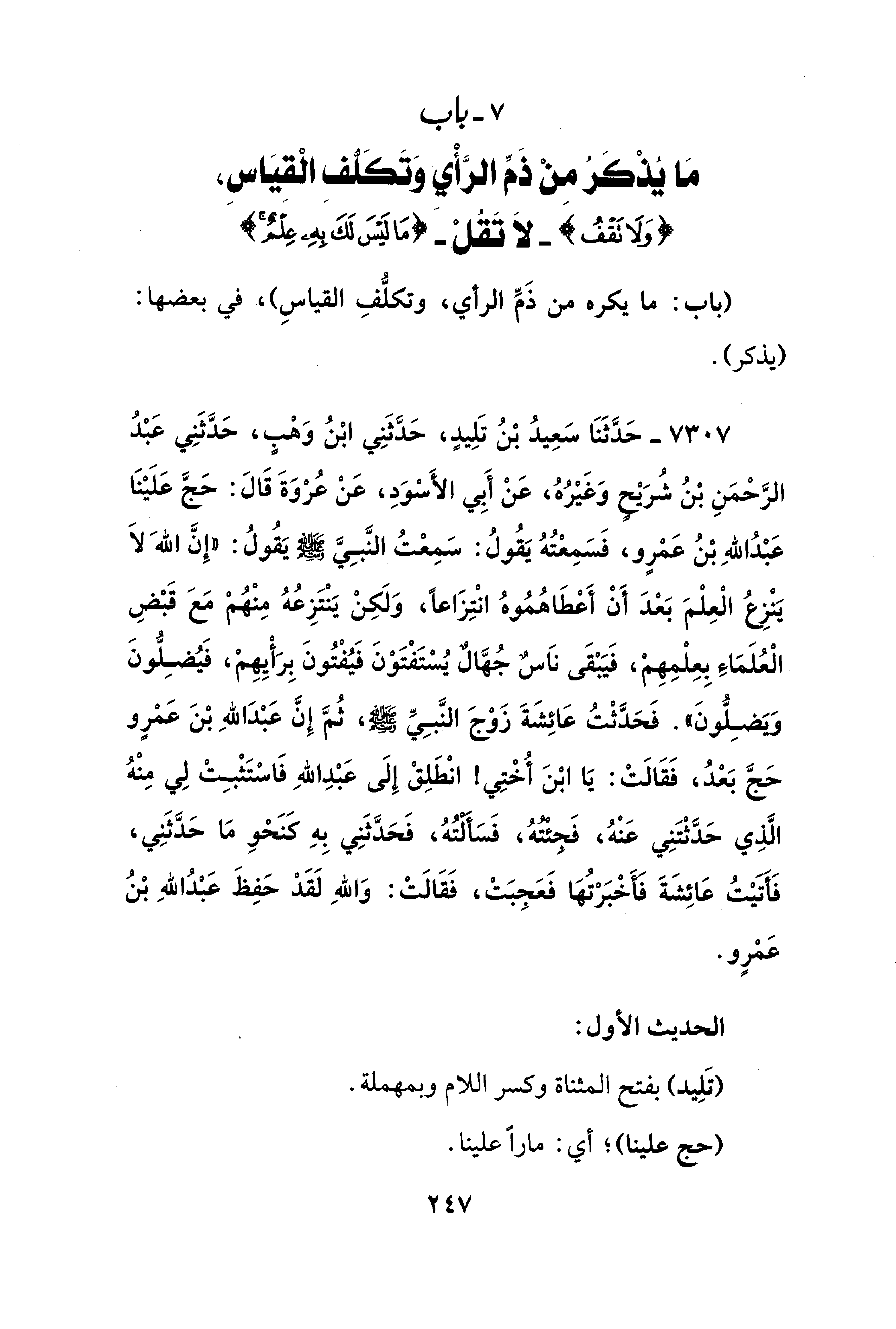 7 - باب مَا يُذْكَرُ مِنْ ذَمِّ الرَّأْي وَتَكَلُّفِ الْقيَاسِ، {وَلَا تَقْفُ} -لَا تَقُلْ- {مَا لَيْسَ لَكَ بِهِ عِلْمٌ}