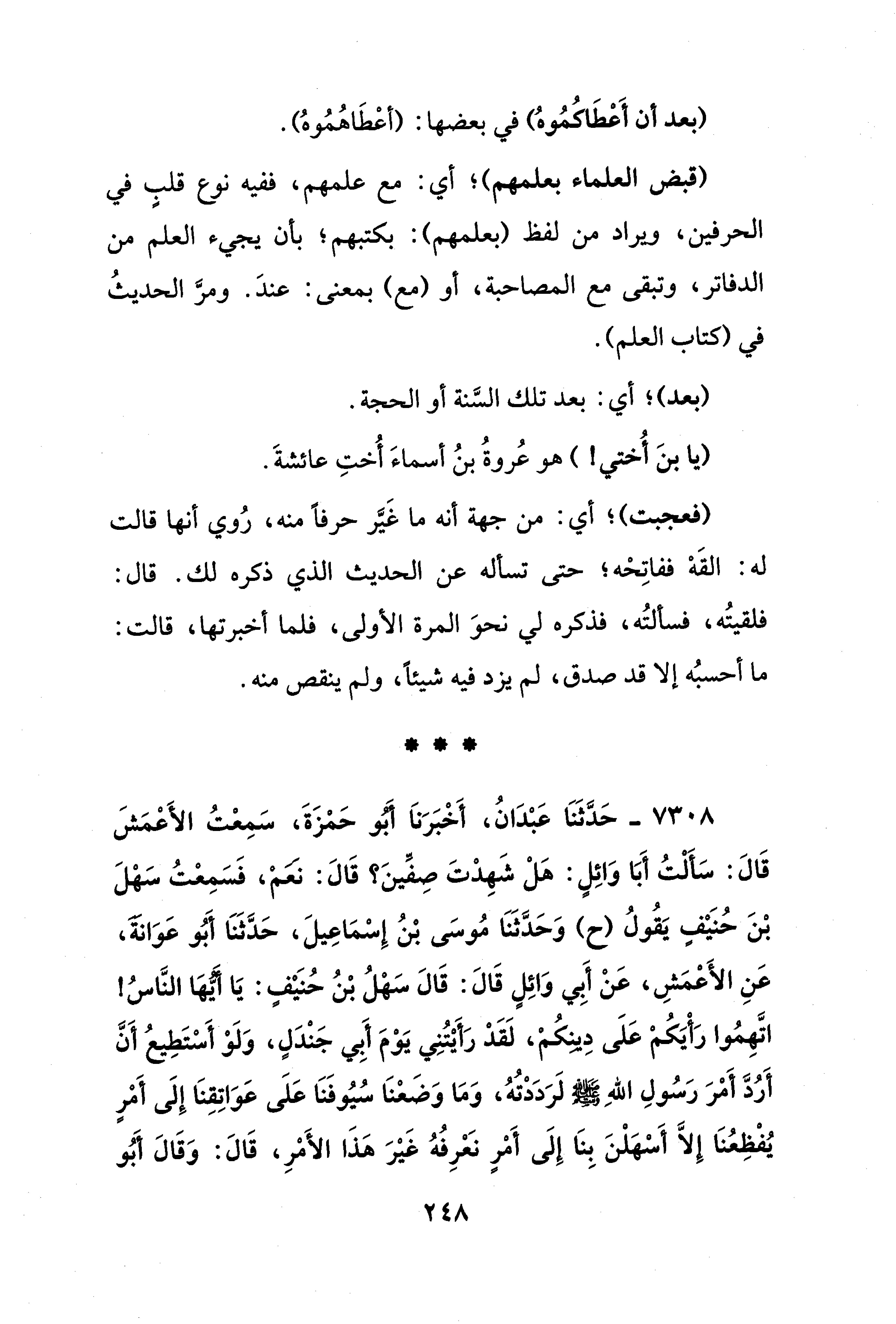 (قبض العلماء بعلمهم)؛ أي: مع علمهم، ففيه نوع قلبٍ في الحرفين، ويراد من لفظ (بعلمهم): بكتبهم؛ بأن يجيء العلم من الدفاتر، وتبقى مع المصاحبة، أو (مع) بمعنى: عندَ. ومرَّ الحديثُ في (كتاب العلم).