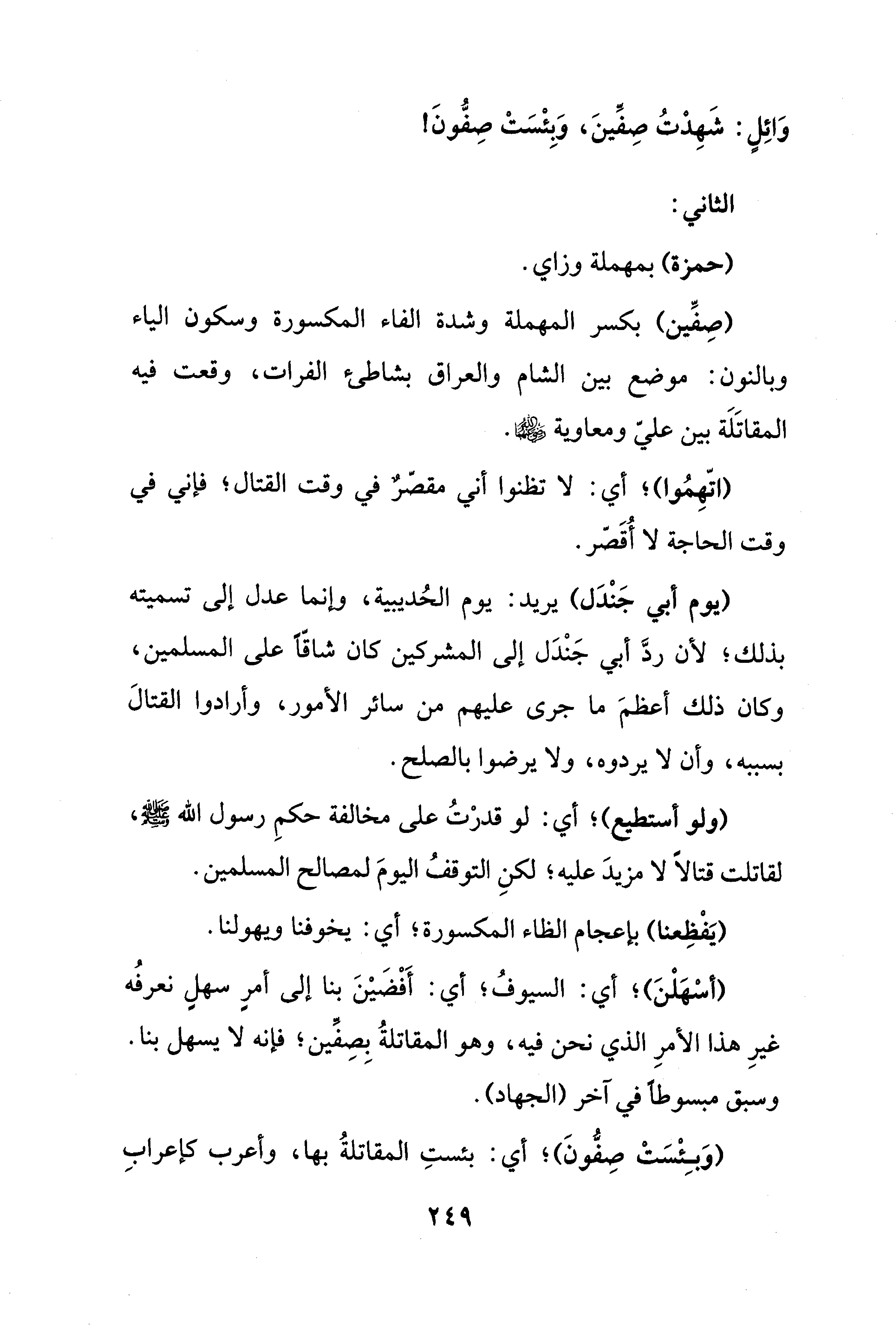 (صِفِّين) بكسر المهملة وشدة الفاء المكسورة وسكون الياء وبالنون: موضع بين الشام والعراق بشاطئ الفرات، وقعت فيه المقاتَلَة بين علي ومعاوية - رضي الله عنهما -.
