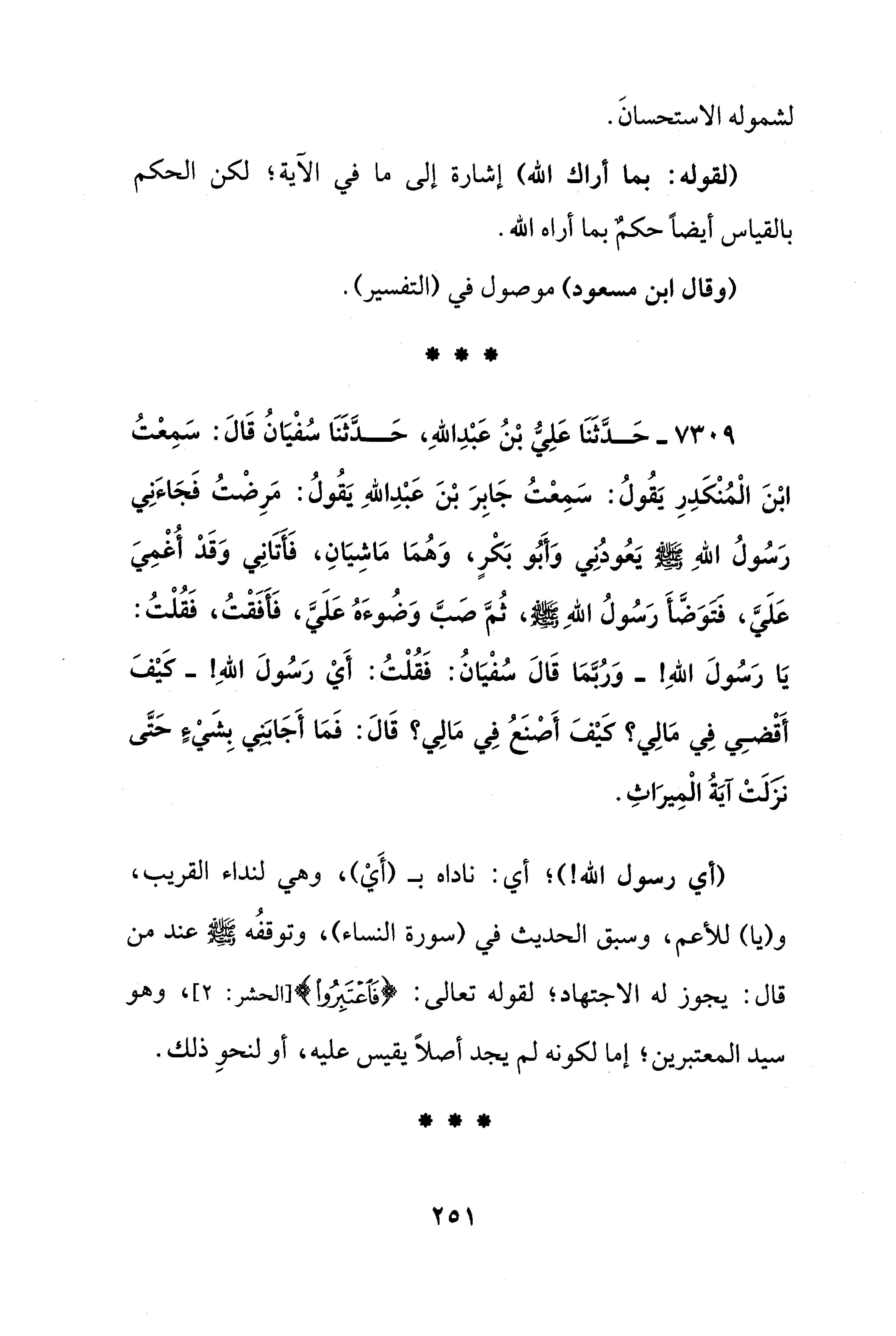 7309 - حَدَّثَنَا عَلِيُّ بْنُ عَبْدِ اللهِ، حَدَّثَنَا سُفْيَانُ قَال: سَمِعْتُ ابْنَ الْمُنْكَدِرِ يَقُولُ: سَمِعْتُ جَابِرَ بْنَ عَبْدِ اللهِ يَقُولُ: مَرِضْتُ فَجَاءَنِي رَسُولُ اللهِ - صلى الله عليه وسلم - يَعُودُنِي وَأَبُو بَكْرٍ، وَهُمَا مَاشِيَانِ، فَأَتَانِي وَقَدْ أُغْمِيَ عَلَيَّ، فَتَوَضَّأَ رَسُولُ اللهِ - صلى الله عليه وسلم -، ثُمَّ صَبَّ وَضُوءَهُ عَلَيَّ، فَأَفَقْتُ، فَقُلْتُ: يَا رَسُولَ اللهِ! -وَرُبَّمَا قَالَ سُفْيَانُ: فَقُلْتُ: أَيْ رَسُولَ اللهِ! - كَيْفَ أَقْضِي فِي مَالِي؟ كَيْفَ أَصْنَعُ فِي مَالِي؟ قَالَ: فَمَا أَجَابَنِي بِشَيْءٍ حَتَّى نزَلَتْ آيَةُ الْمِيرَاثِ.