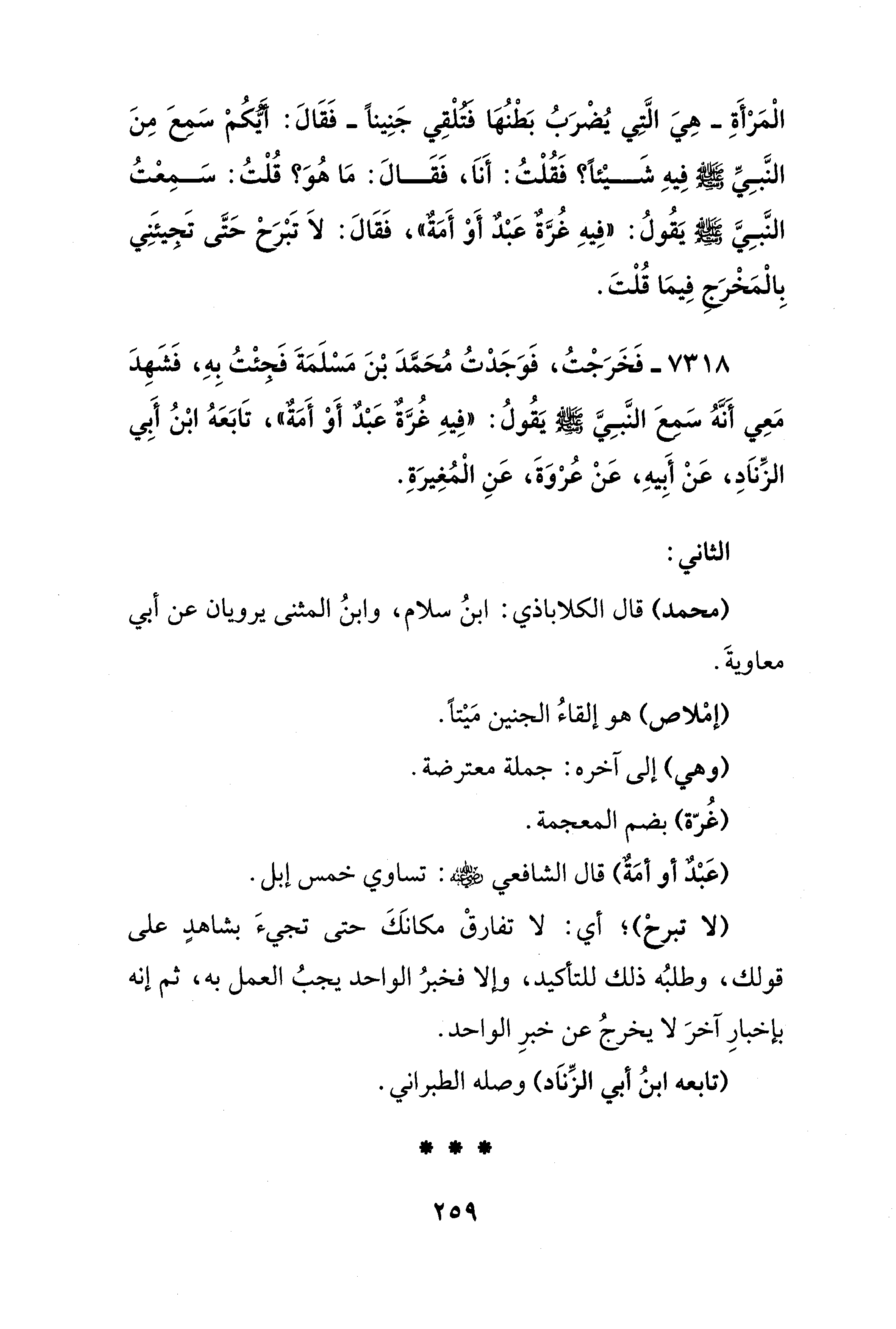 الْمَرْأَةِ -هِيَ الَّتِي يُضْرَبُ بَطْنُهَا فَتُلْقِي جَنِينًا- فَقَالَ: أَيُّكُمْ سَمِعَ مِنَ النَّبِيِّ - صلى الله عليه وسلم - فِيهِ شَيْئًا؟ فَقُلْتُ: أَنَا، فَقَالَ: مَا هُوَ؟ قُلْتُ: سَمِعْتُ النَّبِيَّ - صلى الله عليه وسلم - يَقُولُ: "فِيهِ غُرَّةٌ عَبْدٌ أَوْ أَمَةٌ"، فَقَالَ: لَا تَبْرَحْ حَتَّى تَجيئَنِي بِالْمَخْرَجِ فِيمَا قُلْتَ.