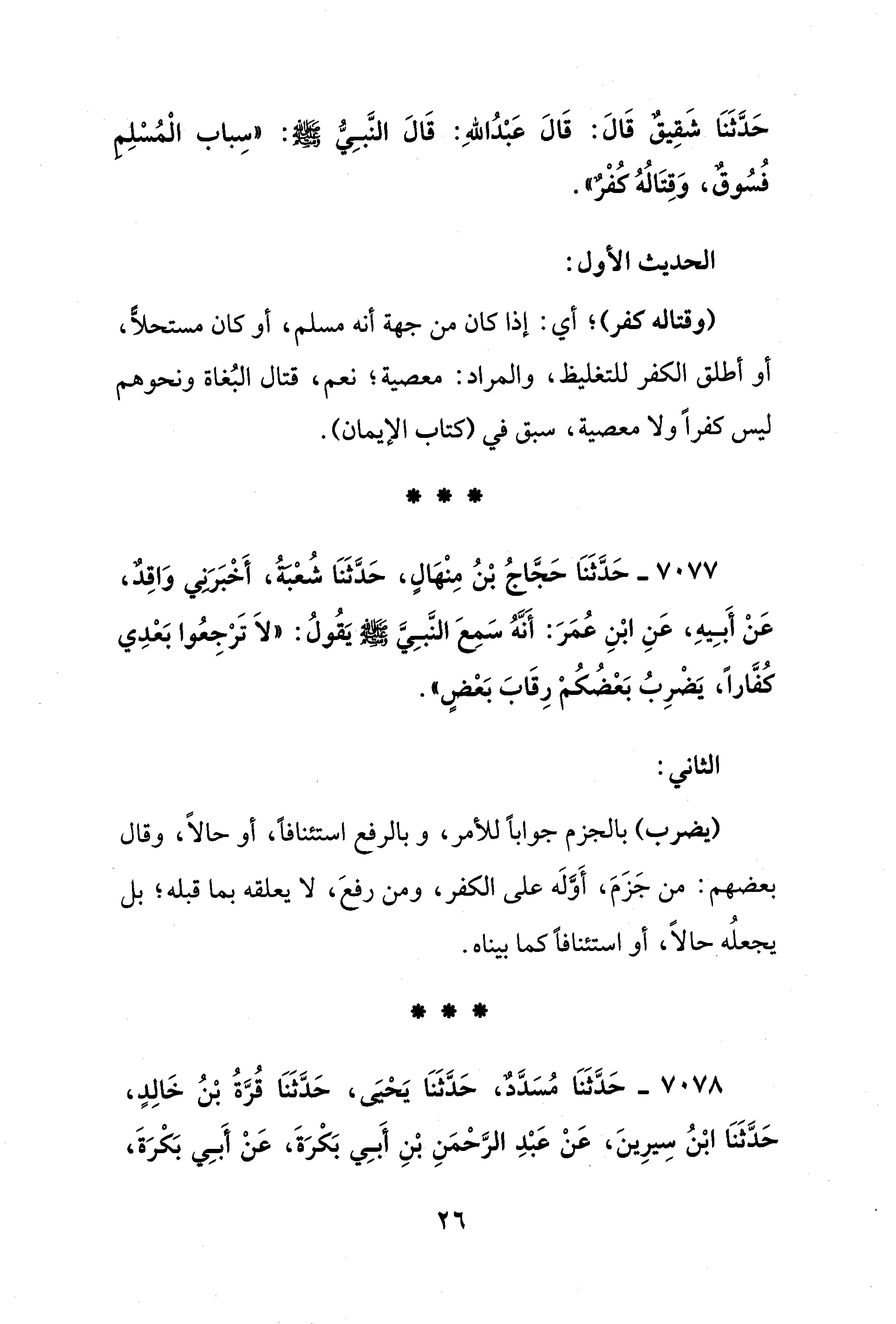 حَدَّثَنَا شَقِيقٌ قَالَ: قَالَ عَبْدُ اللهِ: قَالَ النَّبِيُّ - صلى الله عليه وسلم -: "سِبابُ الْمُسْلِم فُسُوقٌ، وَقِتَالُهُ كُفْرٌ".
