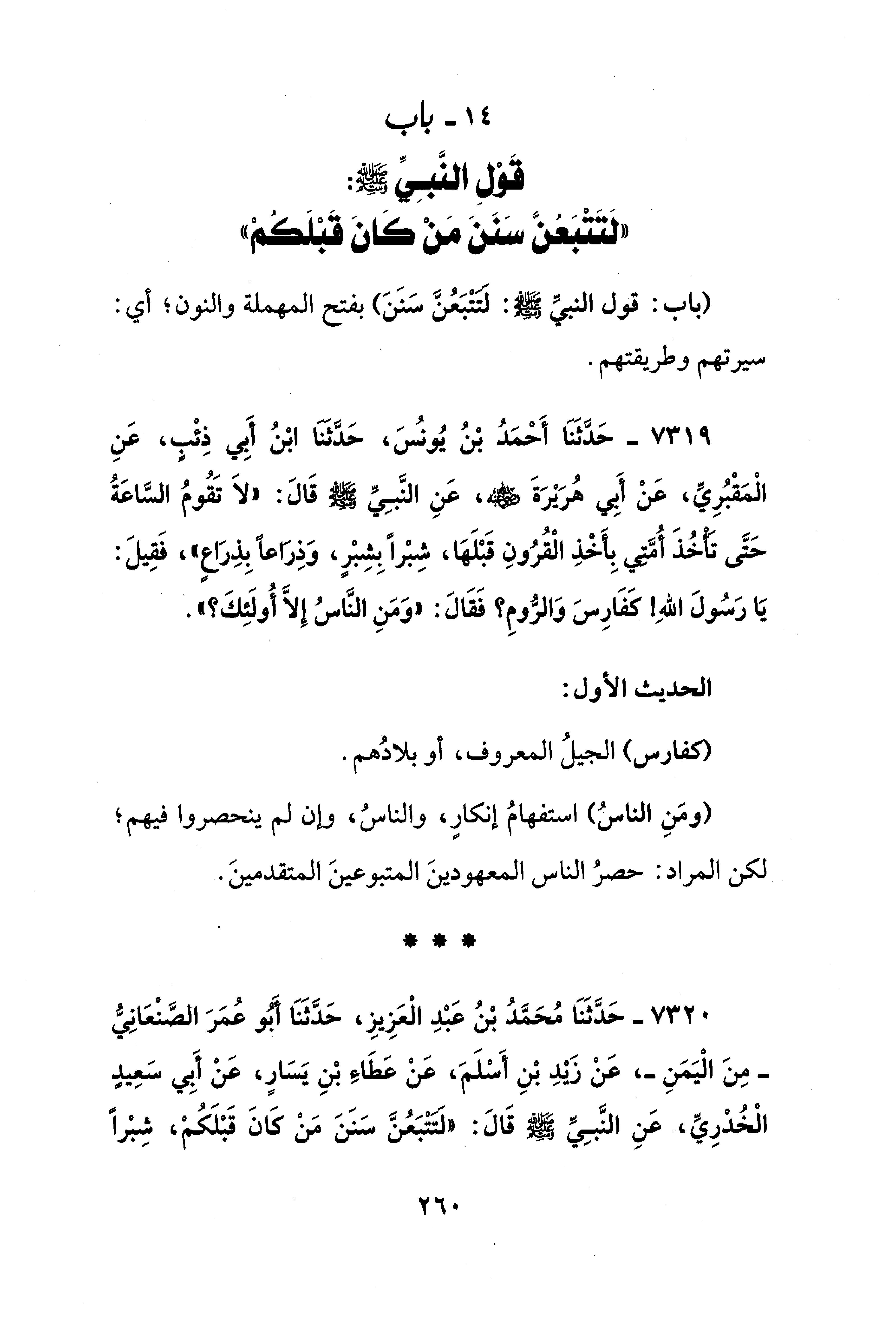 14 - باب قَوْلِ النَّبِيِّ - صلى الله عليه وسلم -: "لَتَتْبَعُنَّ سَنَنَ مَنْ كَانَ قَبْلَكُمْ"