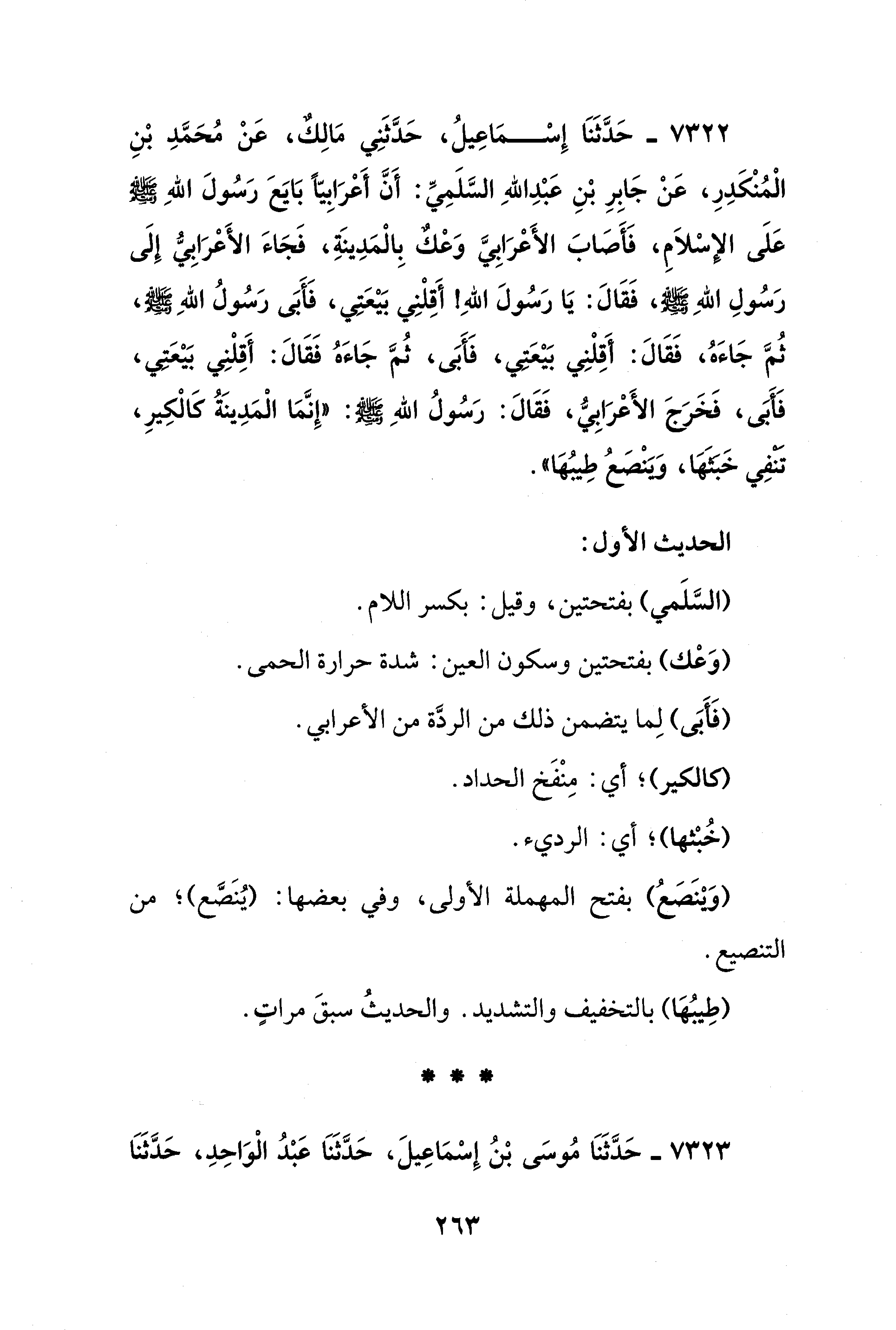 7322 - حَدَّثَنَا إِسْمَاعِيلُ، حَدَّثَنِي مَالِكٌ، عَنْ مُحَمَّدِ بْنِ الْمُنْكَدِرِ، عَنْ جَابِرِ بْنِ عَبْدِ اللهِ السَّلَمِيِّ: أَنَّ أَعْرَابِيًّا بَايَعَ رَسُولَ اللهِ - صلى الله عليه وسلم - عَلَى الإِسْلاَمِ، فَأَصَابَ الأَعْرَابِيَّ وَعْكٌ بِالْمَدِينَةِ، فَجَاءَ الأَعْرَابِيُّ إِلَى رَسُولِ اللهِ - صلى الله عليه وسلم -، فَقَالَ: يَا رَسُولَ اللهِ! أَقِلْنِي بَيْعَتِي، فَأَبَى رَسُولُ اللهِ - صلى الله عليه وسلم -، ثُمَّ جَاءَهُ، فَقَالَ: أَقِلْنِي بَيْعَتِي، فَأَبَى، ثُمَّ جَاءَهُ فَقَالَ: أَقِلْنِي بَيْعَتِي، فَأَبَى، فَخَرَجَ الأَعْرَابِيُّ، فَقَالَ: رَسُولُ اللهِ - صلى الله عليه وسلم -: "إِنَّمَا الْمَدِينَةُ كَالْكِيرِ، تنفِي خَبَثَهَا، وَيَنْصَعُ طِيبُهَا".