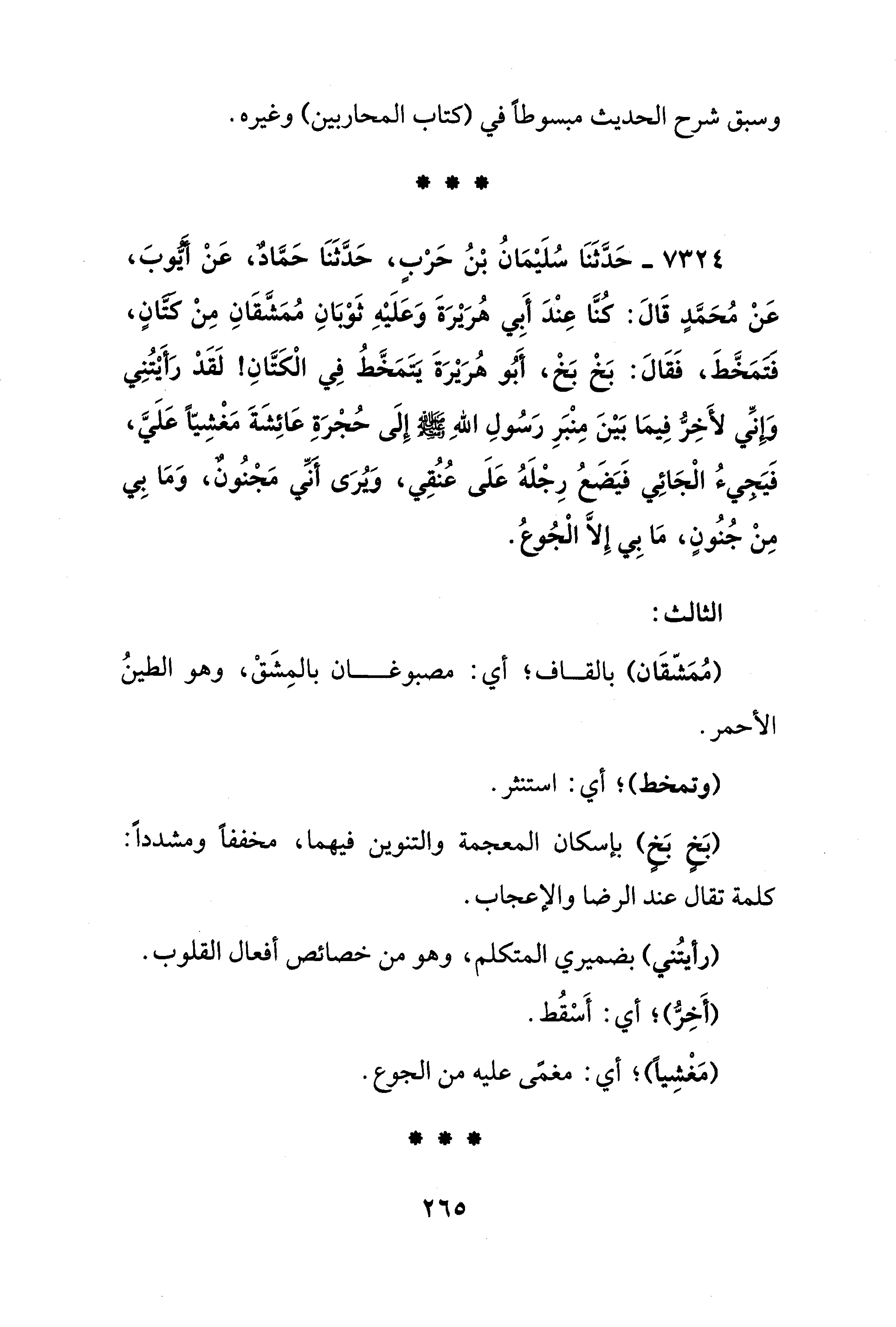 7324 - حَدَّثَنَا سُلَيْمَانُ بْنُ حَرْبٍ، حَدَّثَنَا حَمَّادٌ، عَنْ أَيُّوبَ، عَنْ مُحَمَّدٍ قَالَ: كُنَّا عِنْدَ أَبِي هُرَيْرَةَ وَعَلَيْهِ ثَوْبَانِ مُمَشَّقَانِ مِنْ كَتَّانٍ، فَتَمَخَّطَ، فَقَالَ: بَخْ بَخْ، أَبُو هُرَيْرَةَ يَتَمَخَّطُ فِي الْكَتَّانِ! لَقَدْ رَأَيْتُنِي وَإِنِّي لأَخِرُّ فِيمَا بَيْنَ مِنْبَرِ رَسُولِ اللهِ - صلى الله عليه وسلم - إِلَى حُجْرَةِ عَائِشَةَ مَغْشِيًّا عَلَىَّ، فَيَجيءُ الْجَائِي فَيَضَعُ رِجْلَهُ عَلَى عُنُقِي، وَيُرَى أَنِّي مَجْنُونٌ، وَمَا بِي مِنْ جُنُونٍ، مَا بِي إِلَّا الْجُوعُ.