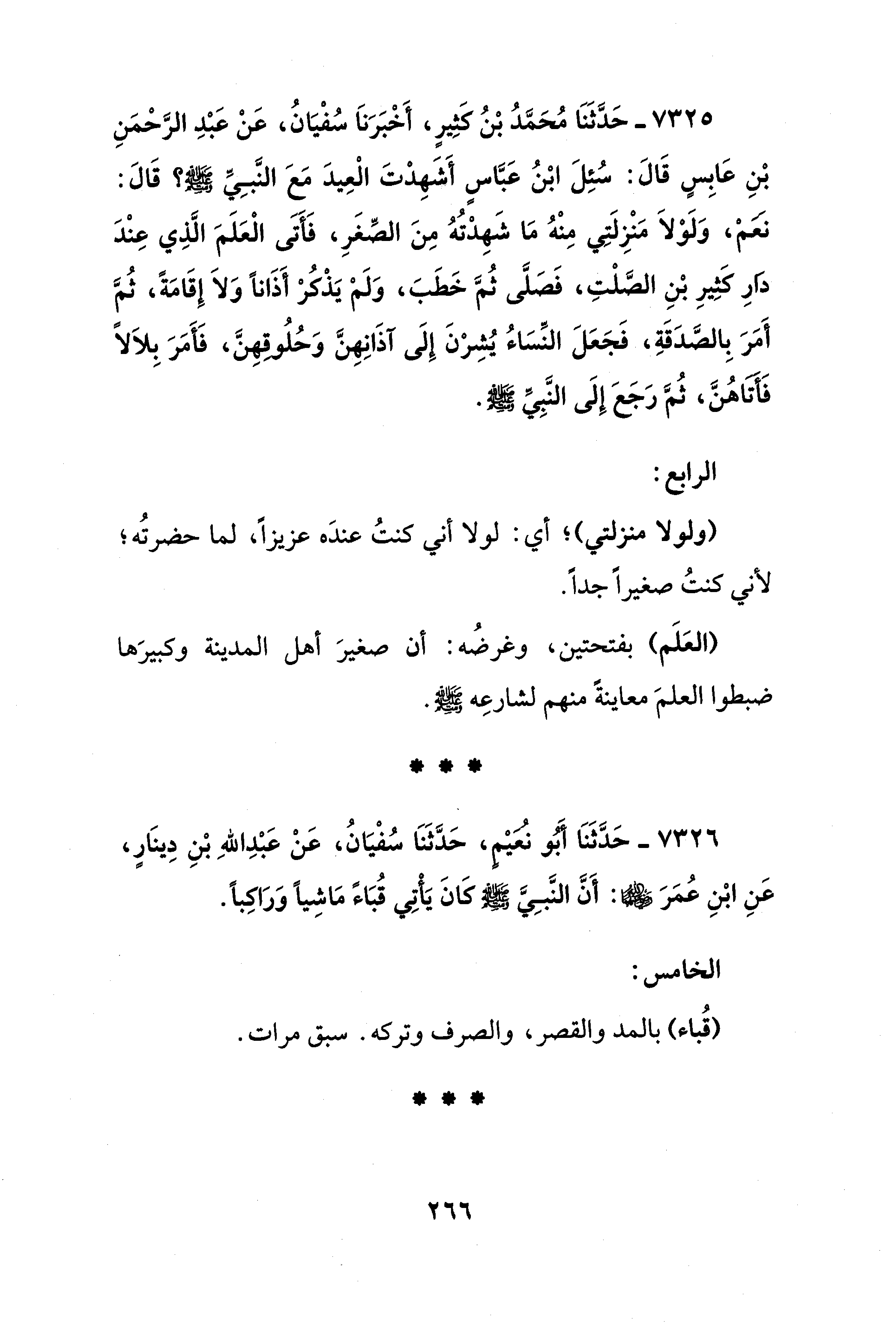 7325 - حَدَّثَنَا مُحَمَّدُ بْنُ كَثِيرٍ، أَخْبَرَنَا سُفْيَانُ، عَنْ عَبْدِ الرَّحْمَنِ بْنِ عَابِسٍ قَالَ: سُئِلَ ابْنُ عَبَّاسٍ أَشَهِدْتَ الْعِيدَ مَعَ النَّبِيِّ - صلى الله عليه وسلم -؟ قَالَ: نَعَمْ، وَلَوْلَا مَنْزِلَتِي مِنْهُ مَا شَهِدْتُهُ مِنَ الصِّغَرِ، فَأَتَى الْعَلَمَ الَّذِي عِنْدَ دَارِ كَثِيرِ بْنِ الصَّلْتِ، فَصَلَّى ثُمَّ خَطَبَ، وَلَمْ يَذْكُرْ أَذَانًا وَلَا إِقَامَةً، ثُمَّ أَمَرَ بِالصَّدَقَةِ، فَجَعَلَ النِّسَاءُ يُشِرْنَ إِلَى آذَانِهِنَّ وَحُلُوقهِنَّ، فَأَمَرَ بِلاَلًا فَأَتَاهُنَّ، ثُمَّ رَجَعَ إلَى النَّبِيِّ - صلى الله عليه وسلم -.