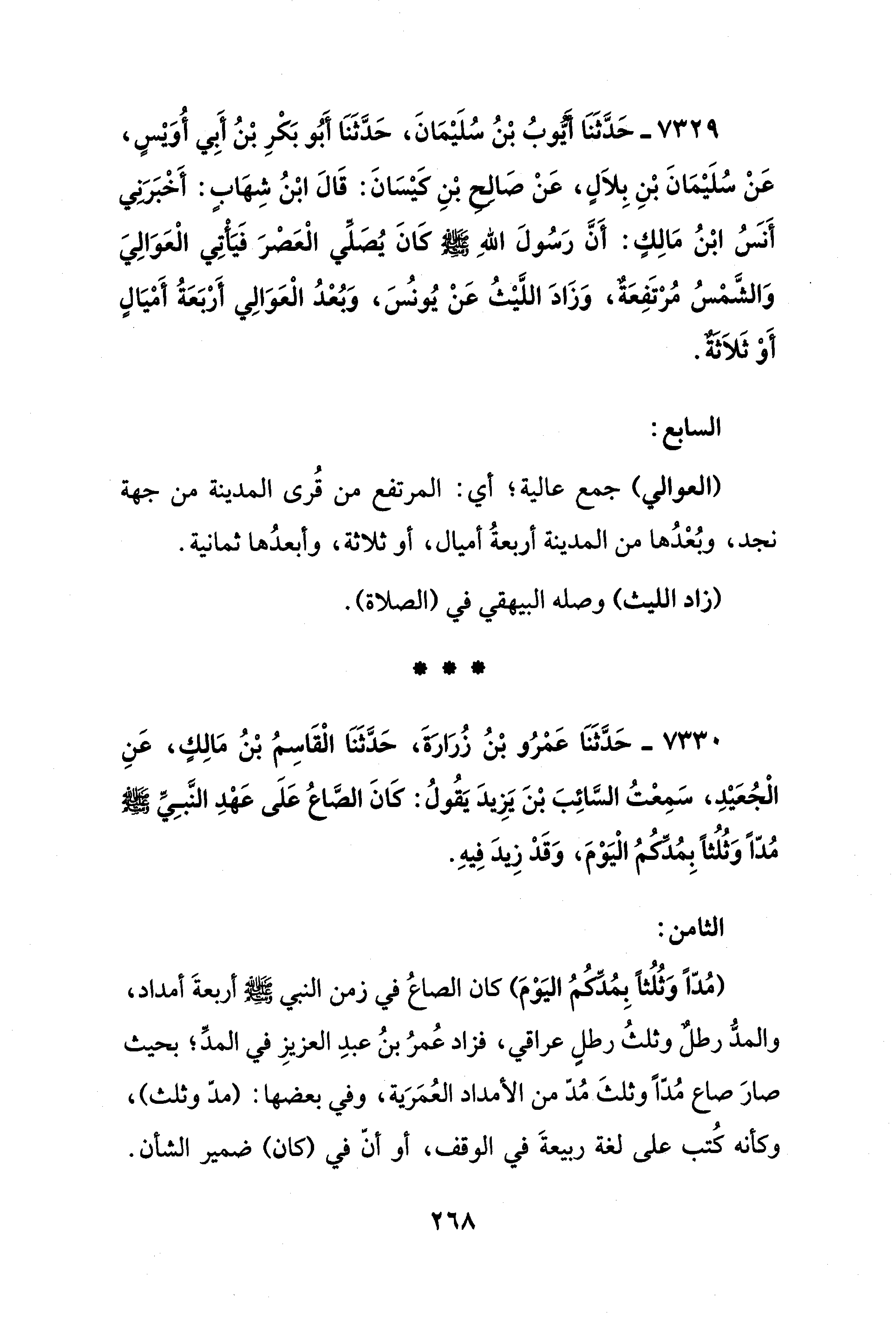 7329 - حَدَّثَنَا أَيُّوبُ بْنُ سُلَيْمَانَ، حَدَّثَنَا أَبُو بَكْرِ بْنُ أَبِي أُوَيْسٍ، عَنْ سُلَيْمَانَ بْنِ بِلاَلٍ، عَنْ صَالِحٍ بْنِ كَيْسَانَ: قَالَ ابْنُ شِهَابٍ: أَخْبَرَنِي أَنَسُ بْنُ مَالِكٍ: أَنَّ رَسُولَ اللهِ - صلى الله عليه وسلم - كَانَ يُصَلِّي الْعَصْرَ فَيَأْتِي الْعَوَالِيَ وَالشَّمْسُ مُرْتَفِعَةٌ، وَزَادَ اللَّيْثُ عَنْ يُونُسَ، وَبُعْدُ الْعَوَالِي أَرْبَعَةُ أَمْيَالٍ أَوْ ثَلاَثَةٌ.