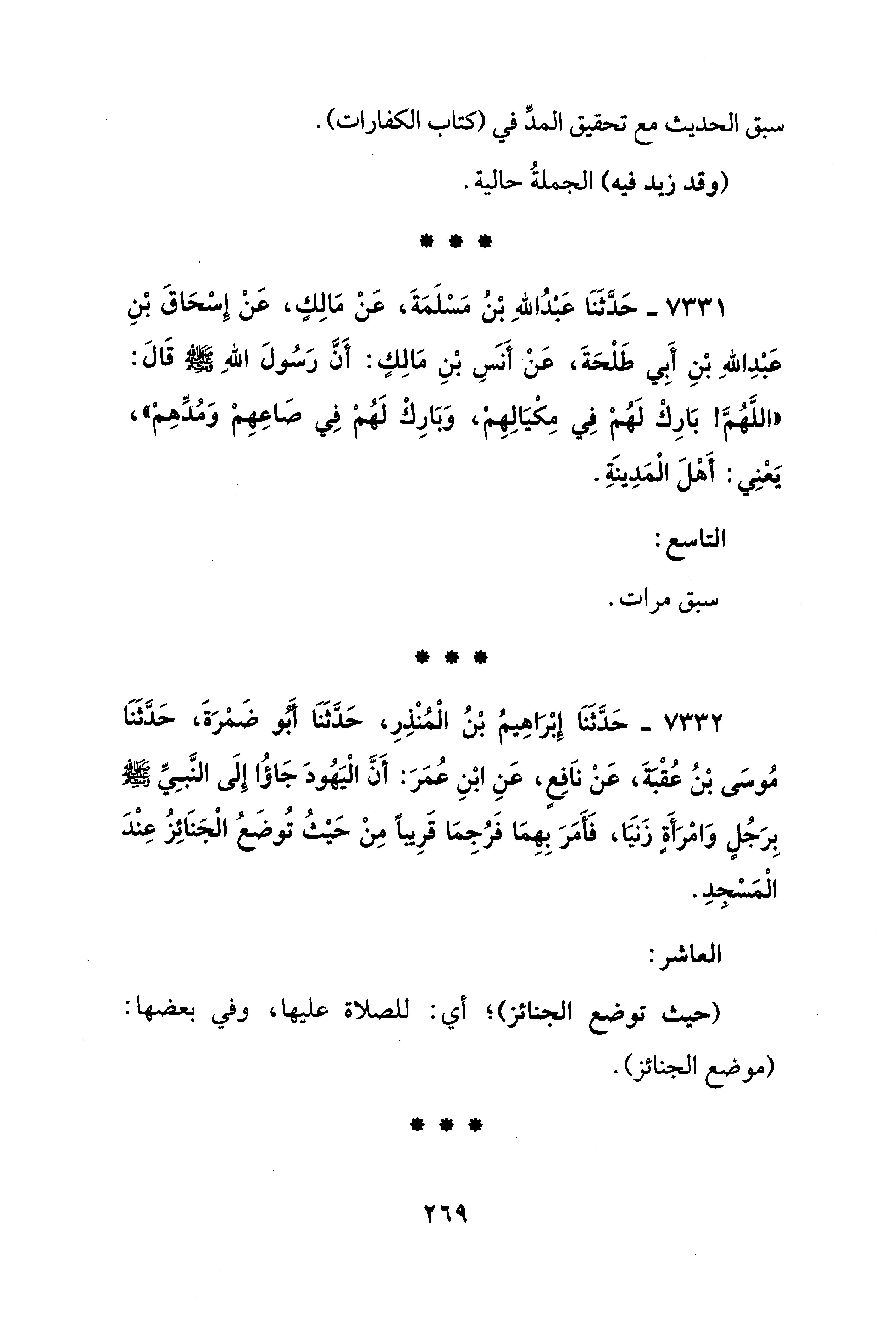 7332 - حَدَّثَنَا إِبْرَاهِيمُ بْنُ الْمُنْذِرِ، حَدَّثَنَا أَبُو ضَمْرَةَ، حَدَّثَنَا مُوسَى بْنُ عُقْبَةَ، عَنْ نَافِعٍ، عَنِ ابْنِ عُمَرَ: أَنَّ الْيَهُودَ جَاؤُا إِلَى النَّبِيِّ - صلى الله عليه وسلم - بِرَجُلٍ وَامْرَأَةٍ زَنَيَا، فَأَمَرَ بِهِمَا فَرُجِمَا قَرِيبًا مِنْ حَيْثُ تُوضَعُ الْجَنَائِزُ عِنْدَ الْمَسْجدِ.